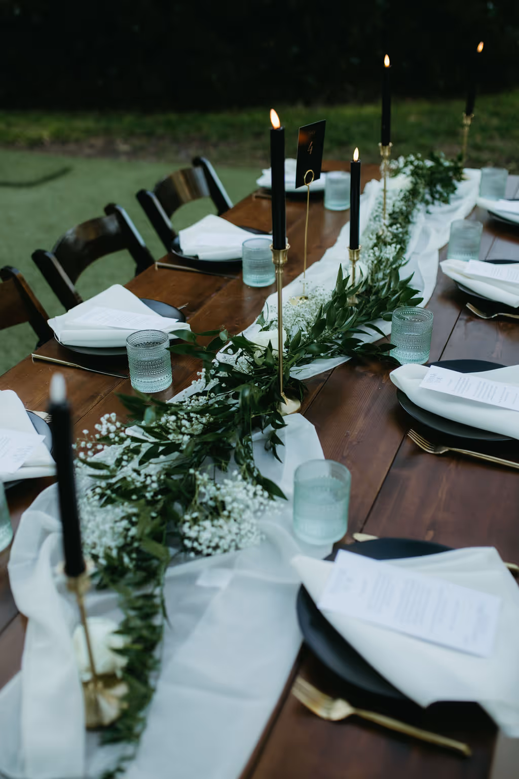 Following the heartfelt ceremony, guests moved to the reception, where candlelight flickered, casting a warm glow over the tables. The reception centerpieces were exquisite, with table flowers continuing the elegant theme and adding a touch of romance to the celebration. The reception decor was a perfect blend of rustic charm and sophisticated elegance.