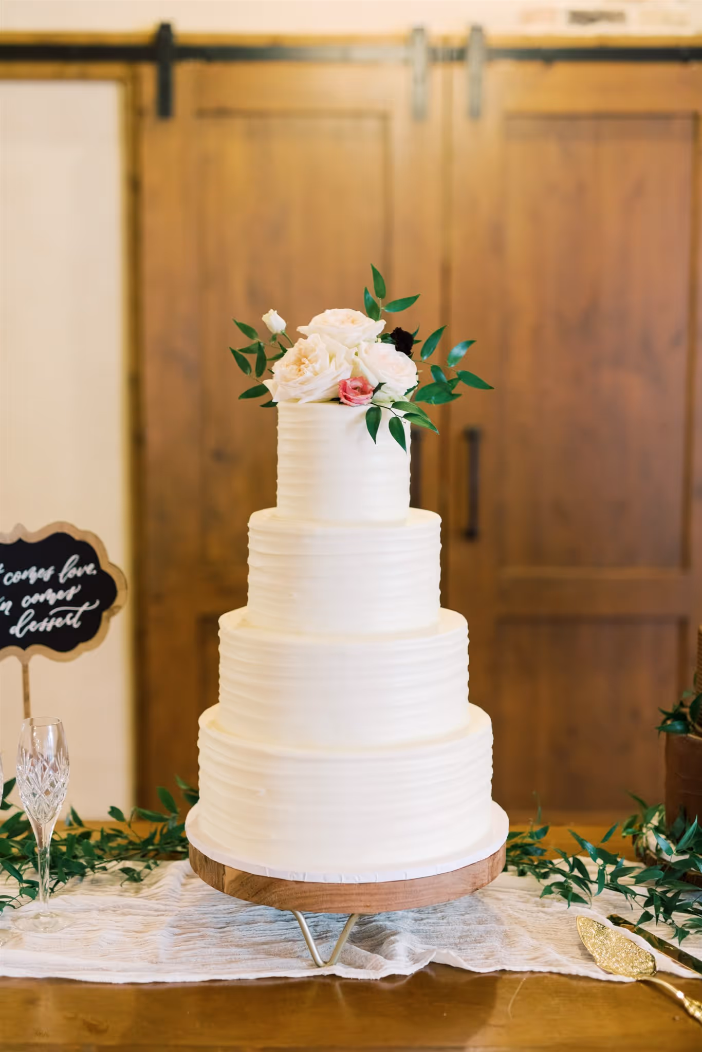 Inside, the reception tables were a vision of sophisticated simplicity. Rich blue linens provided a striking contrast to the soft hues of the floral arrangements. Our signature decor candle trios, accented with delicate greenery and flowers, cast a warm, inviting glow, creating an intimate and romantic ambiance for dinner and celebration. And, of course, no celebration is complete without a masterpiece, and Michelle's Patisserie delivered a stunning cake that was as delicious as it was beautiful.