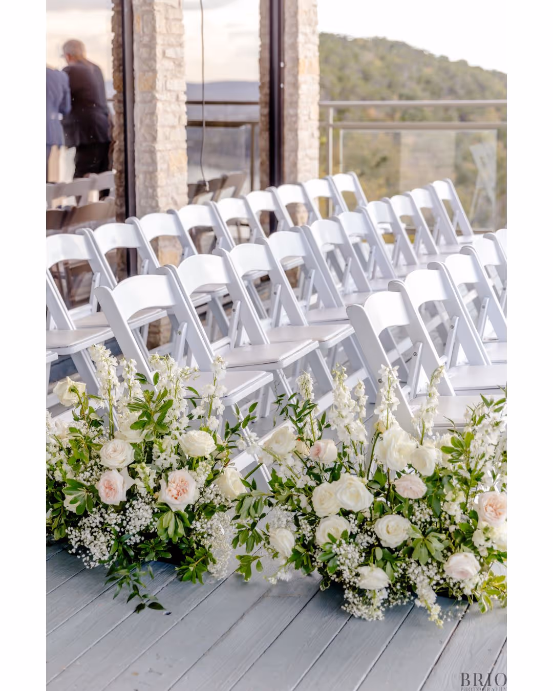 Amanda and Mark envisioned a classic black and white color scheme, and we brought their vision to life with lush floral designs that complemented the stunning backdrop. The ceremony aisle was adorned with romantic blooms, creating a pathway to "I do" with the sparkling lake as their witness. The elegant simplicity of the black and white palette allowed the natural beauty of the Hill Country to shine through, creating a timeless and sophisticated atmosphere.