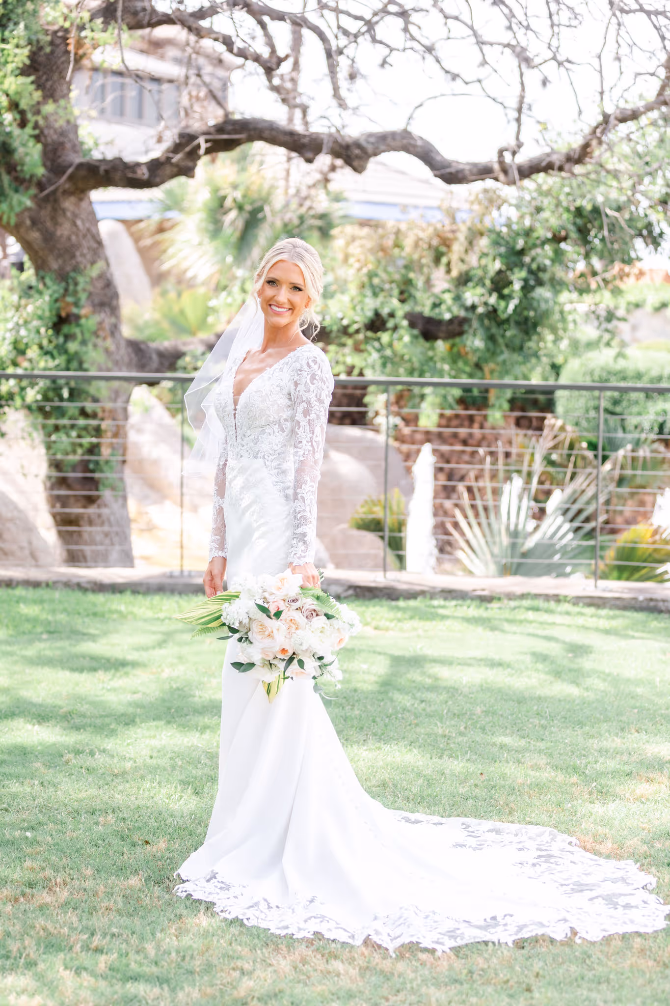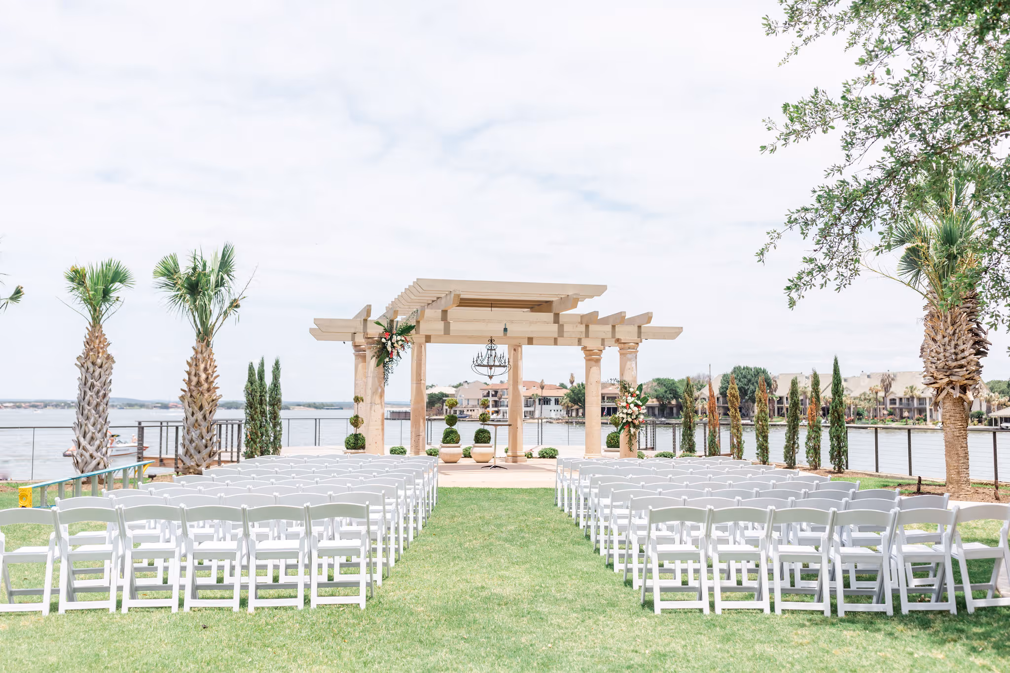Ashley & David's Horseshoe Bay Resort wedding day was one that we will always be fond of! It was hard not to relax while attending with the gorgeous lake view all around you and the breeze in your hair. They originally planned for a wedding in Mexico. However, due to COIVD they planned to bring Mexico to their wedding guests instead with subtle tropical vibes/accent along with classic wedding floral. ⁠⁠They had arbor floral attachments and bright elegant premium floral and orchids.