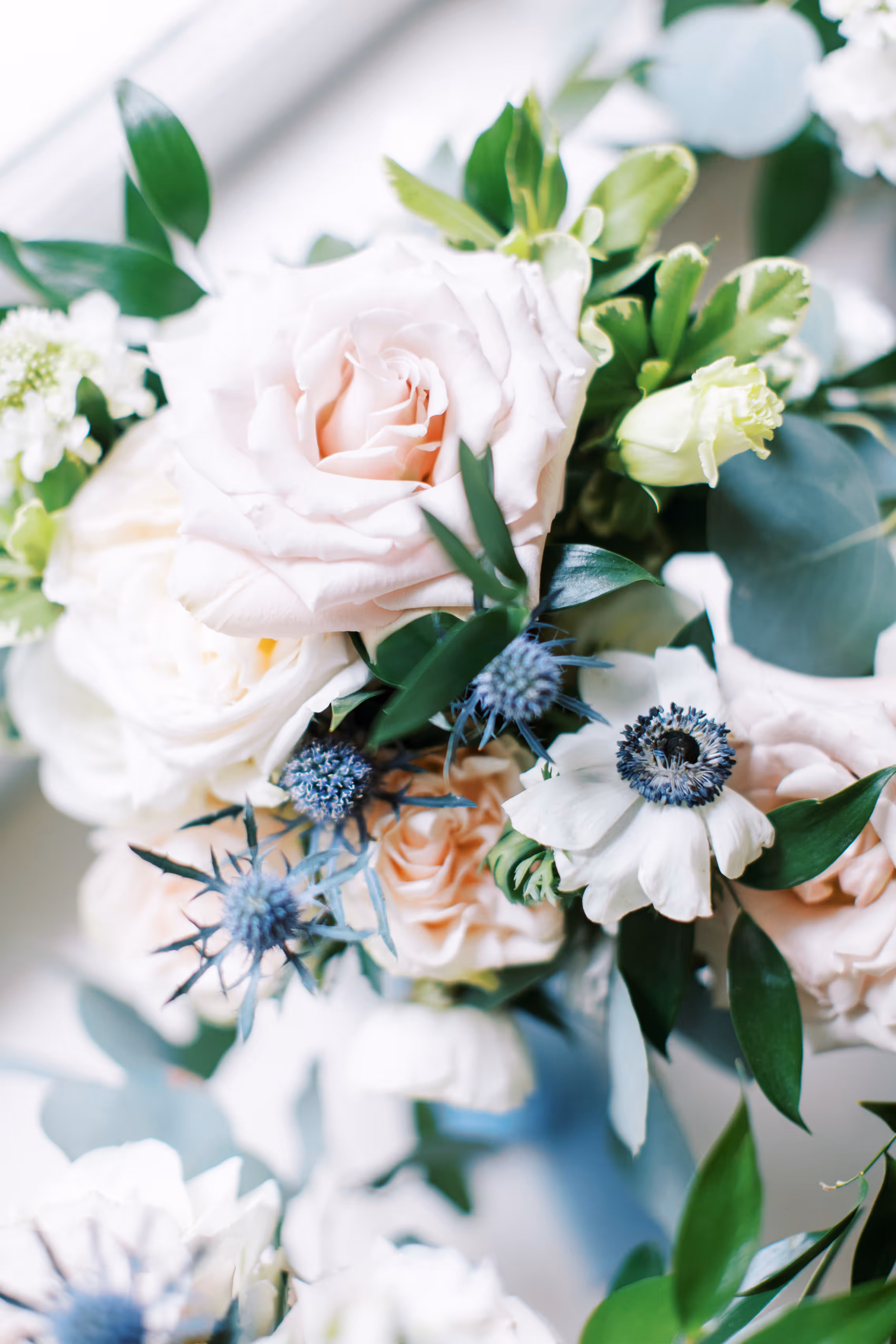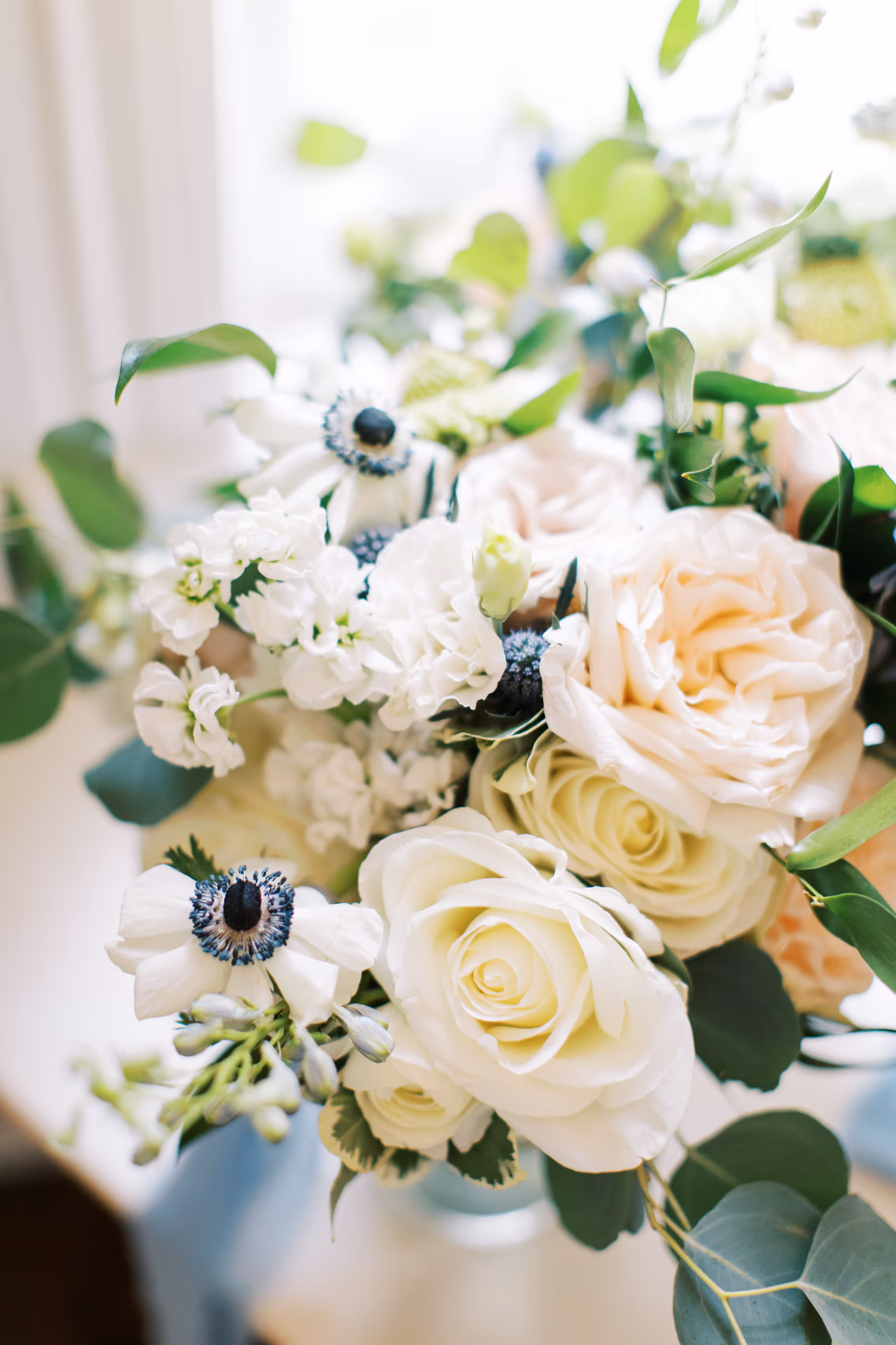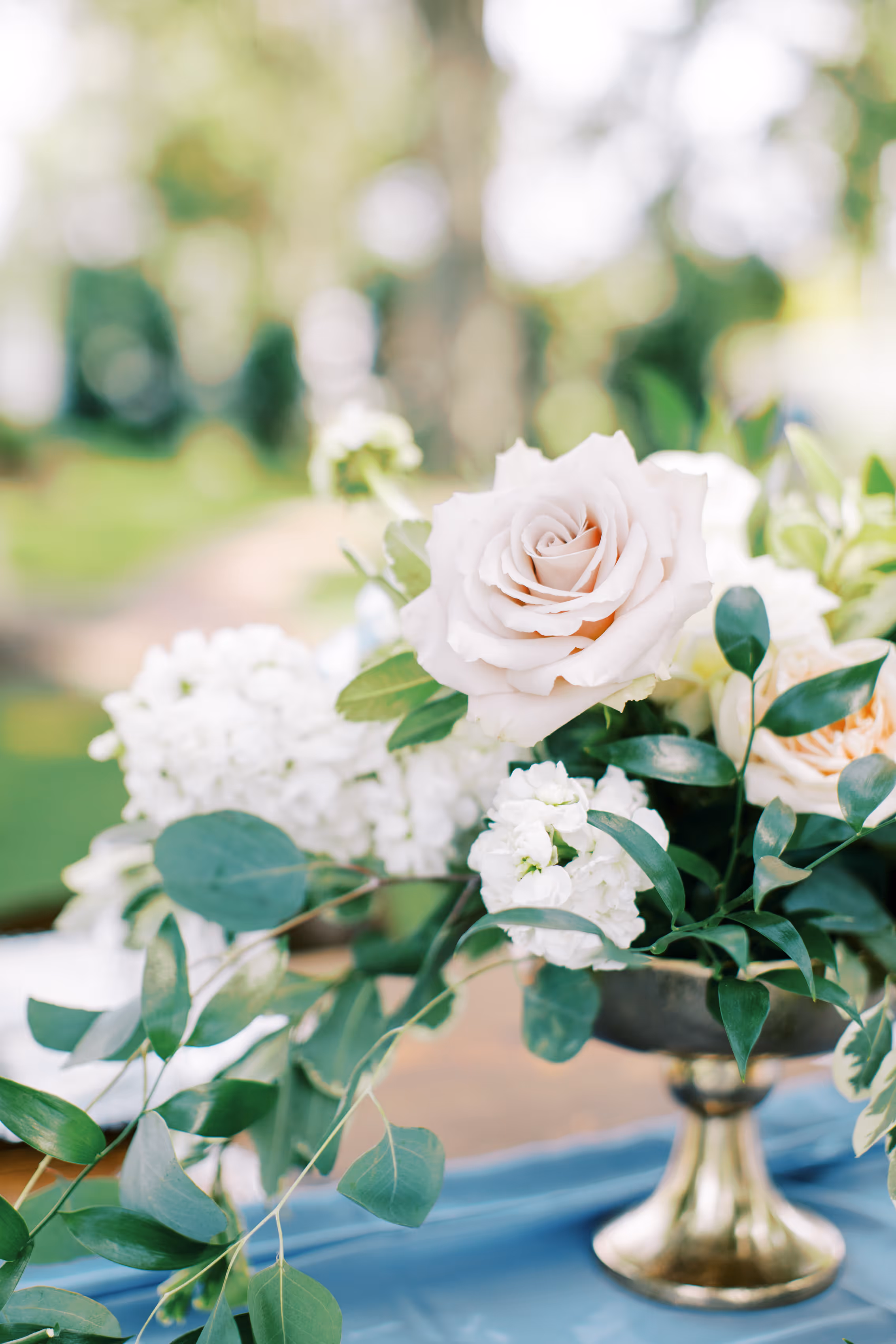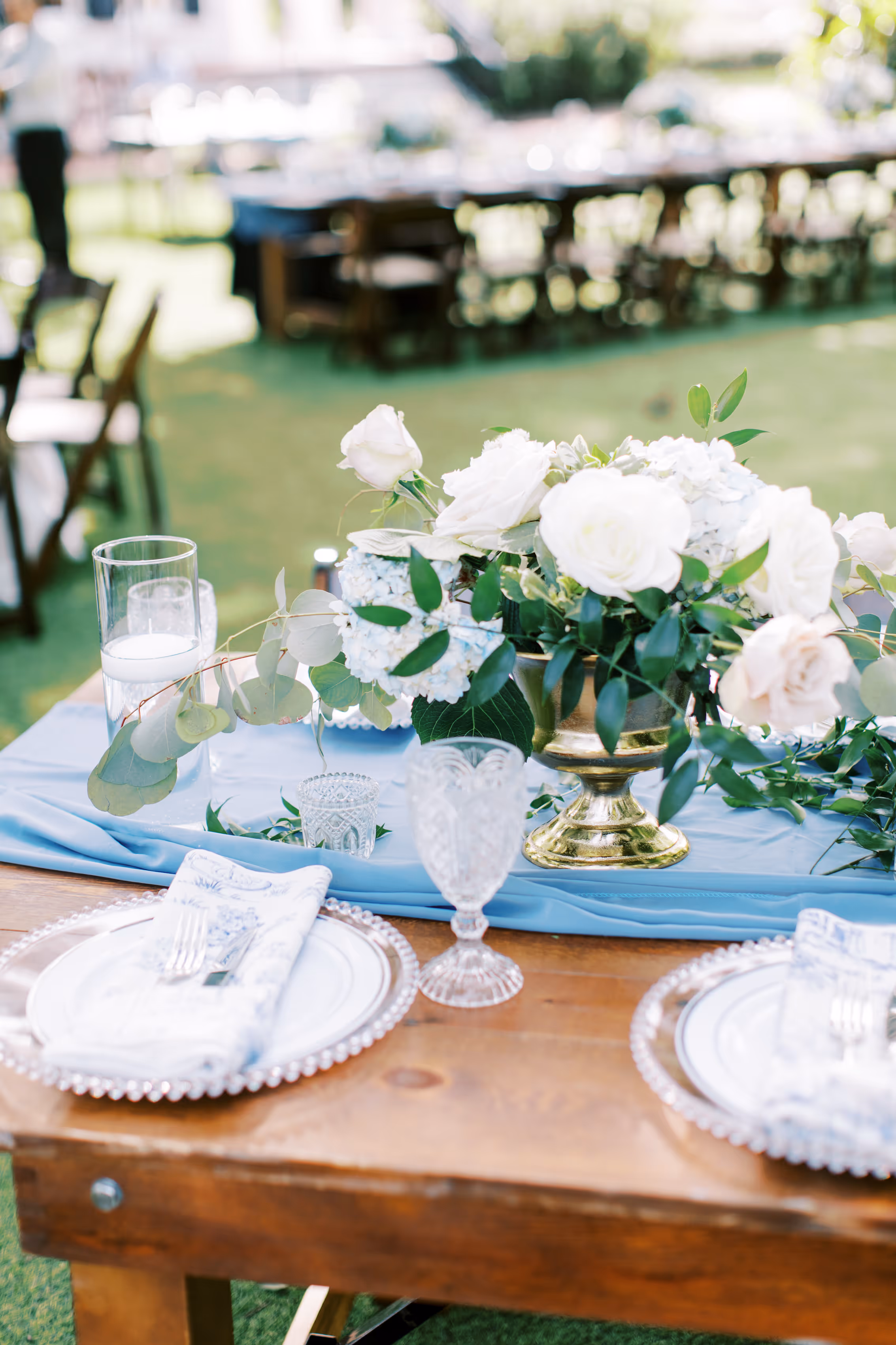 Clare & Greg's wedding day at Woodbine Mansion was like something from a movie. Their wedding colors were light blue and white and every detail covered. Clare's asymetrical bouquet had white wedding spirit roses along with light blue delphinium for the blue accents. Blue pastorale print linens from Premiere Events are a perfect fit for these blue and white European style arrangements in our rental brass urn vases at Woodbine Mansion. Saulnier Weddings partnered their antique glass bead chargers and voila! A stunning antique French table setting for an amazing wedding day. Ceremony floral that can be reused flawlessly at the reception are our favorite. Premiere Events provided the clear acrylic columns and we designed asymmetrical floral that cascaded down on each side of our urn rental brass vases to be used on the guest tables after. Then, to frame the bottom of each columns we made 2 beautiful "L" shaped floral to be moved from the floor to the DJ booth after. So unique, modern, and gorgeous!!