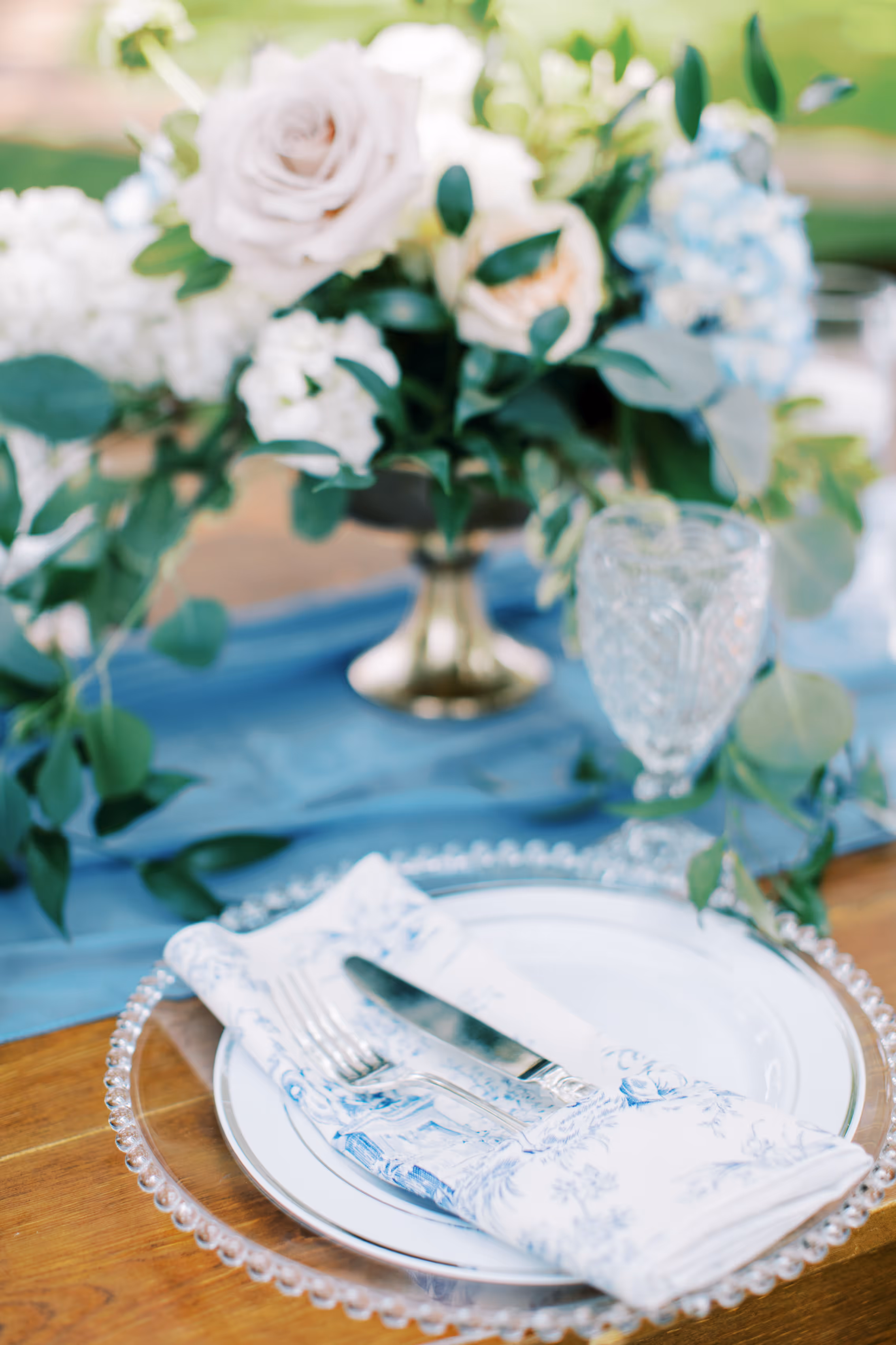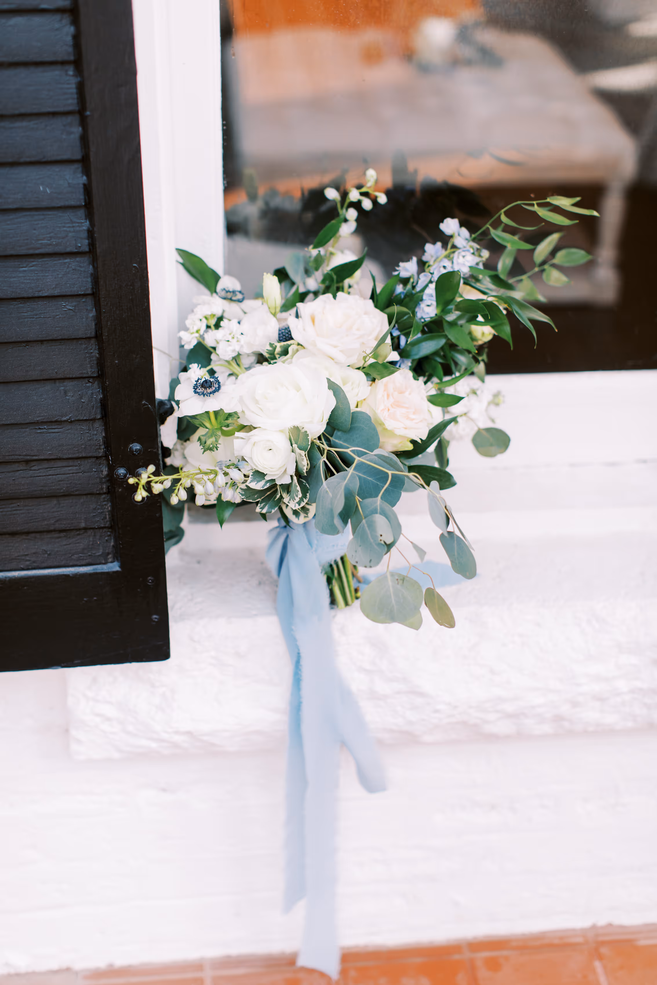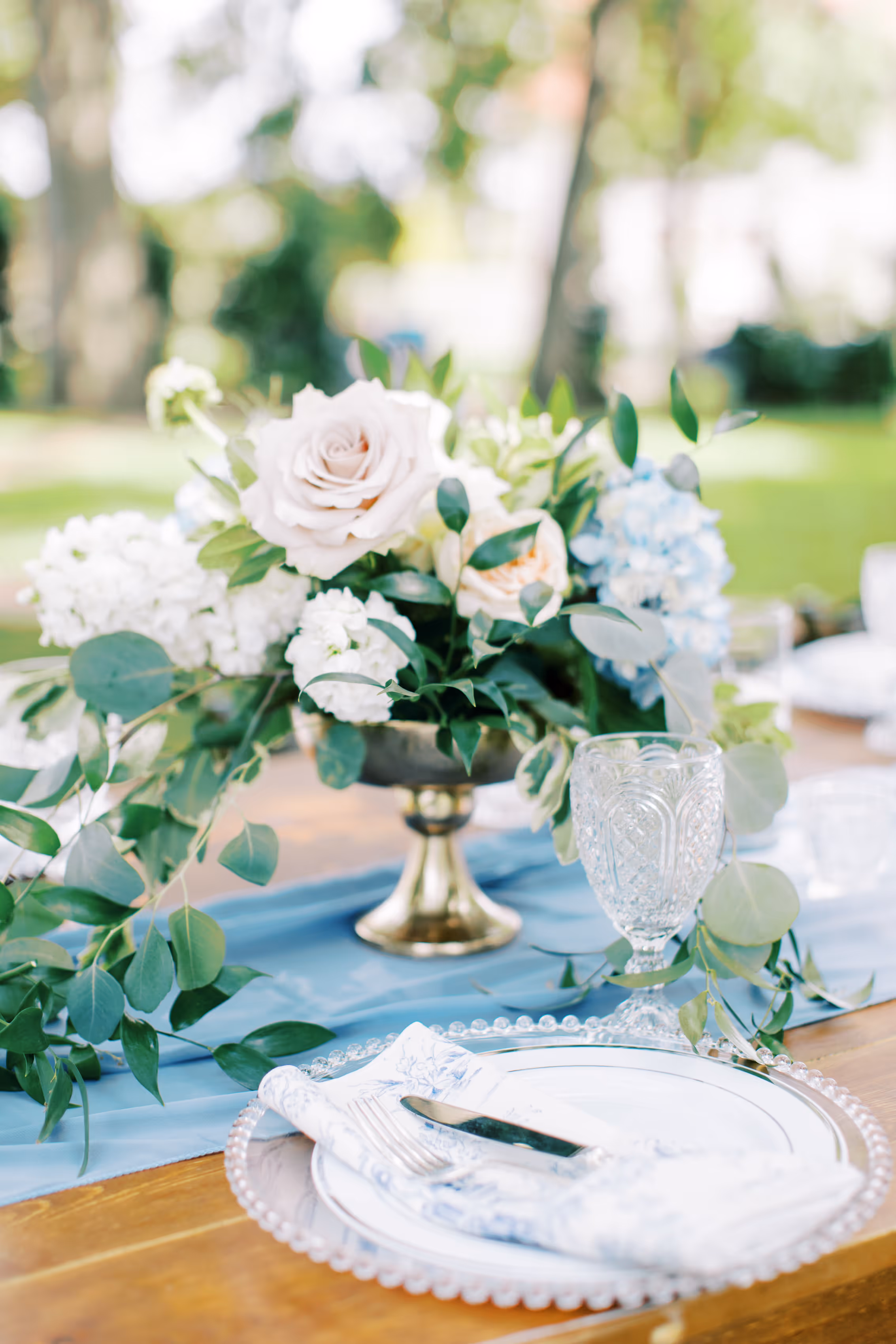 Clare & Greg's wedding day at Woodbine Mansion was like something from a movie. Their wedding colors were light blue and white and every detail covered. Clare's asymetrical bouquet had white wedding spirit roses along with light blue delphinium for the blue accents. Blue pastorale print linens from Premiere Events are a perfect fit for these blue and white European style arrangements in our rental brass urn vases at Woodbine Mansion. Saulnier Weddings partnered their antique glass bead chargers and voila! A stunning antique French table setting for an amazing wedding day. Ceremony floral that can be reused flawlessly at the reception are our favorite. Premiere Events provided the clear acrylic columns and we designed asymmetrical floral that cascaded down on each side of our urn rental brass vases to be used on the guest tables after. Then, to frame the bottom of each columns we made 2 beautiful "L" shaped floral to be moved from the floor to the DJ booth after. So unique, modern, and gorgeous!!