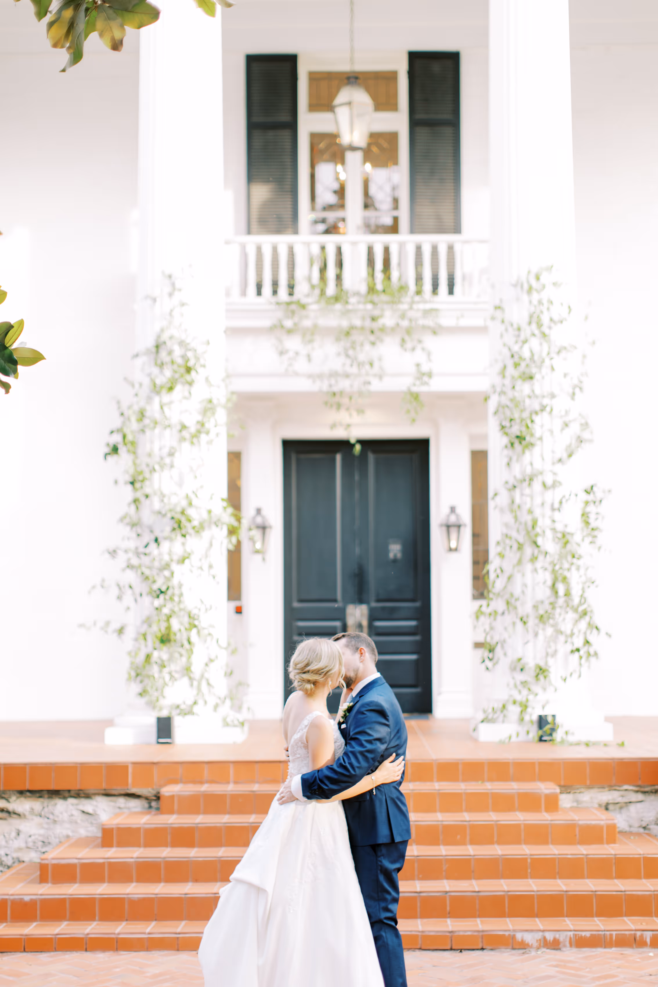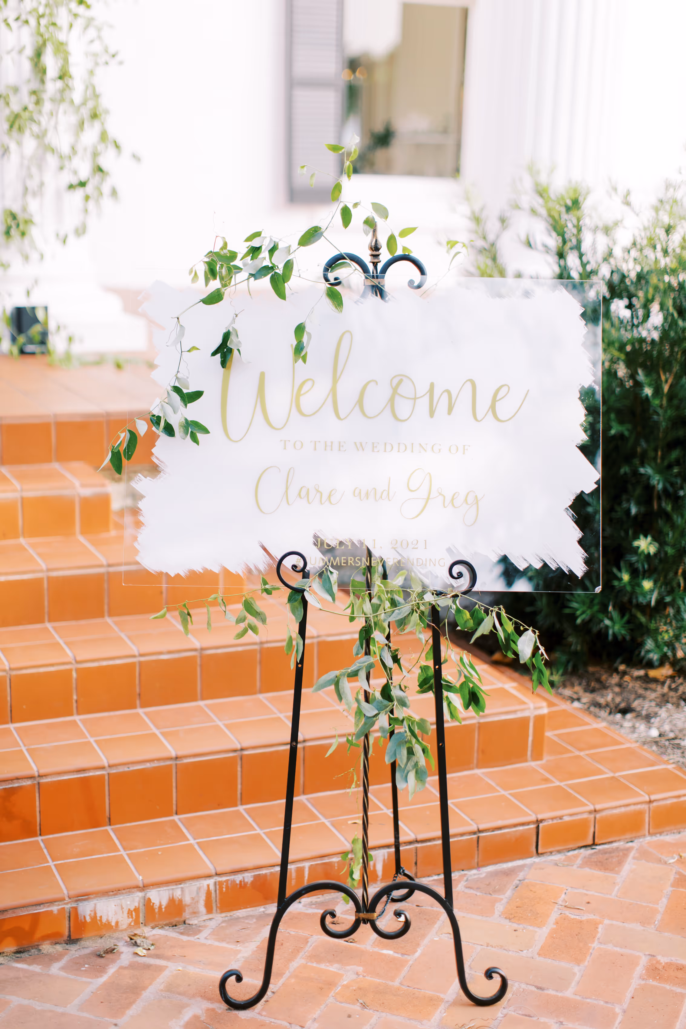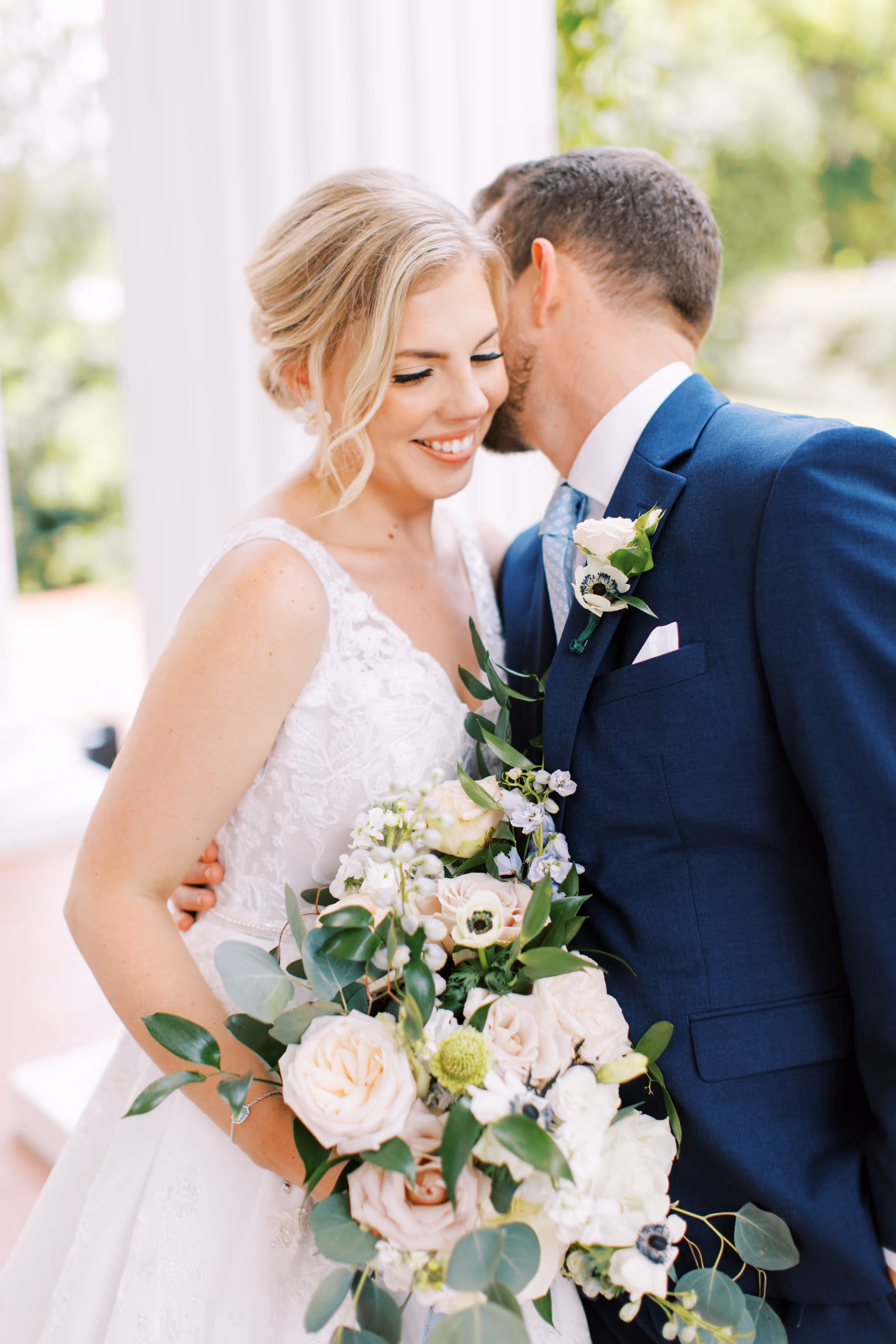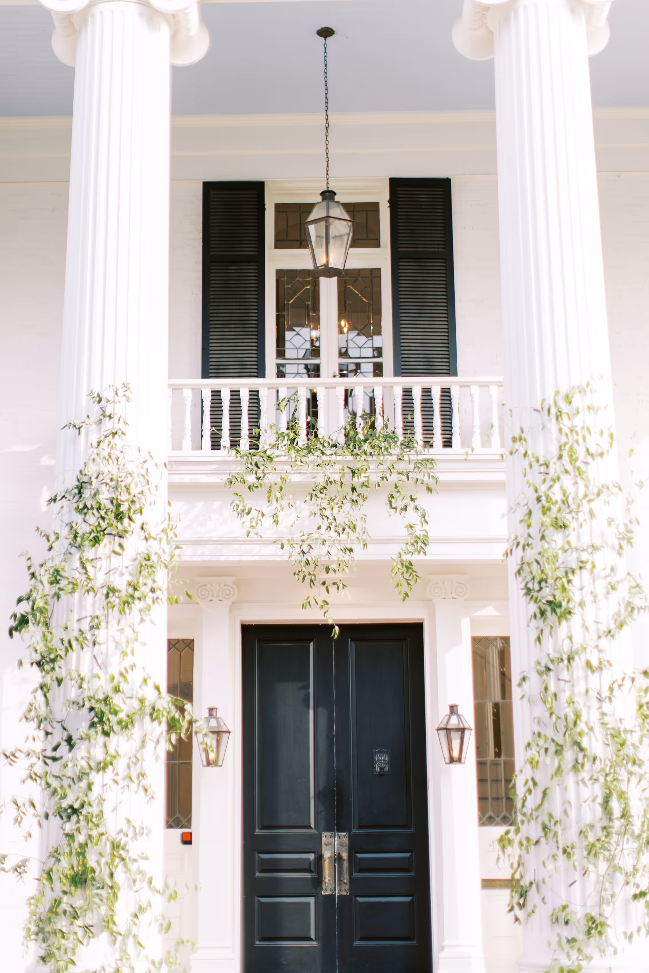 Clare & Greg's wedding day at Woodbine Mansion was like something from a movie. Their wedding colors were light blue and white and every detail covered. Clare's asymetrical bouquet had white wedding spirit roses along with light blue delphinium for the blue accents. Blue pastorale print linens from Premiere Events are a perfect fit for these blue and white European style arrangements in our rental brass urn vases at Woodbine Mansion. Saulnier Weddings partnered their antique glass bead chargers and voila! A stunning antique French table setting for an amazing wedding day. Ceremony floral that can be reused flawlessly at the reception are our favorite. Premiere Events provided the clear acrylic columns and we designed asymmetrical floral that cascaded down on each side of our urn rental brass vases to be used on the guest tables after. Then, to frame the bottom of each columns we made 2 beautiful "L" shaped floral to be moved from the floor to the DJ booth after. So unique, modern, and gorgeous!!