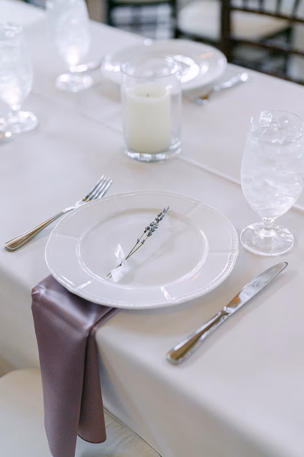 Inside, the reception tables were a vision of sophisticated simplicity. Rich blue linens provided a striking contrast to the soft hues of the floral arrangements. Our signature decor candle trios, accented with delicate greenery and flowers, cast a warm, inviting glow, creating an intimate and romantic ambiance for dinner and celebration. And, of course, no celebration is complete without a masterpiece, and Michelle's Patisserie delivered a stunning cake that was as delicious as it was beautiful.