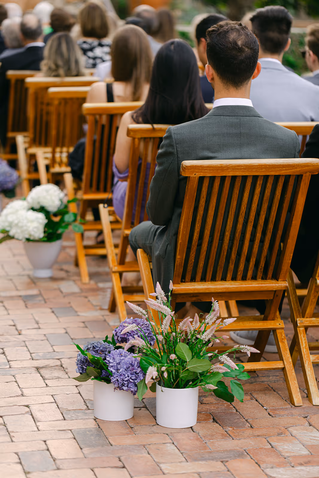 The ceremony flowers were a breathtaking display, with the wedding florist creating a lush, fresh floral arrangement that adorned a circular white stage. This unique stage became the focal point of the ceremony, where the bride and groom exchanged vows. The decor was thoughtfully designed, featuring circular, lush, round ottoman couches in a striking mustard yellow to match the couple's color palette. The Spanish Tuscan villa style provided a romantic and timeless backdrop for this new wedding trend.