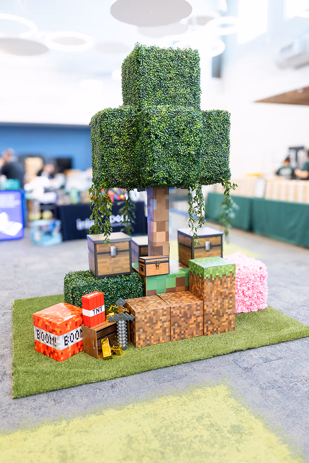 - Blocky Inhabitants & Immersive Scenery: Our team meticulously crafted bespoke Minecraft-style "people," towering "trees," and characteristic "shrubs." But we didn't stop there! We brought the game to life with iconic elements like stacks of TNT, essential pickaxes, versatile crates, gleaming gold bars, and even a custom-made mine entrance that beckoned attendees into the learning zone. These weren't just decorations; they transformed each event space into a tangible, interactive representation of the game's iconic style, serving as eye-catching focal points and subtly reinforcing the learning environment.