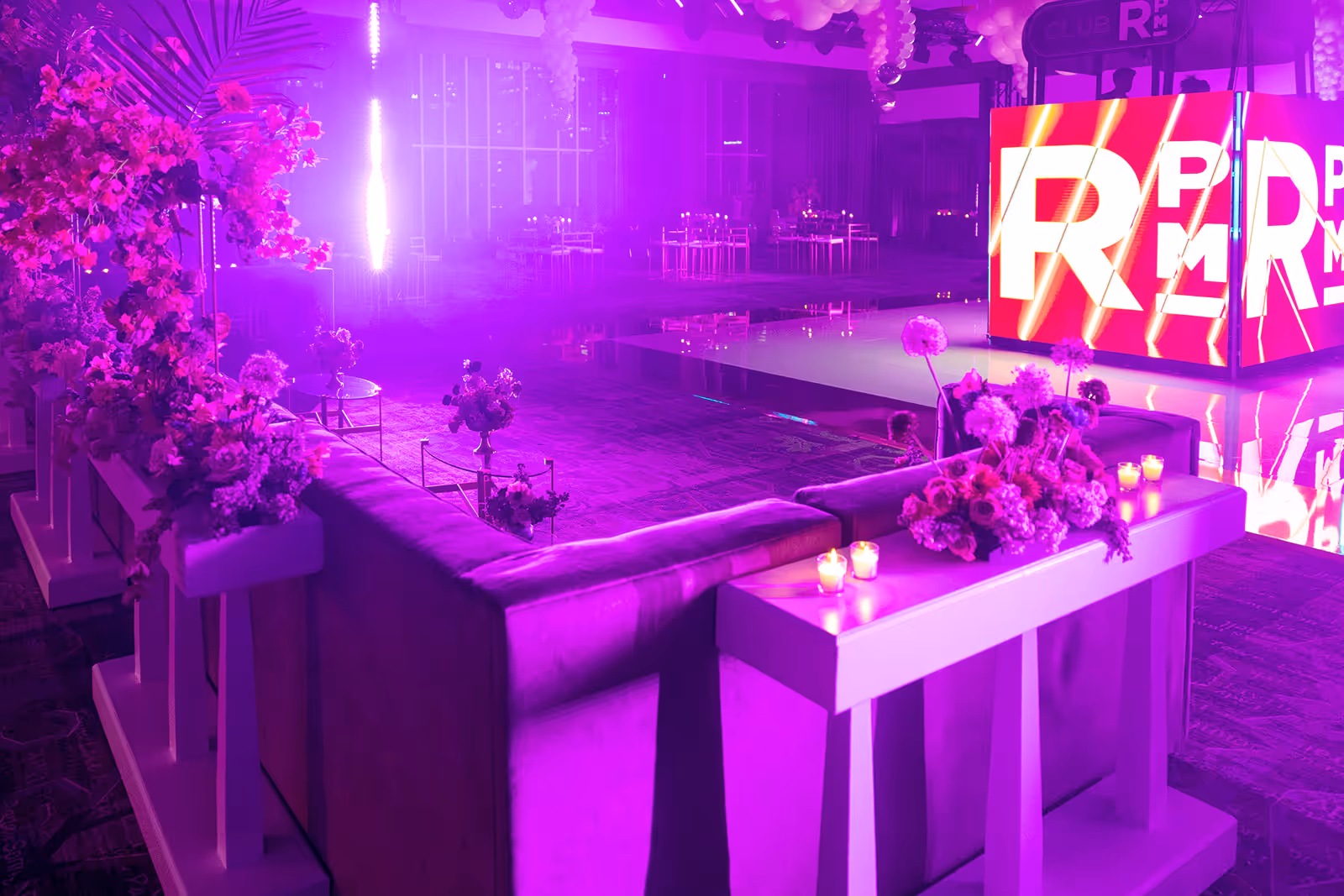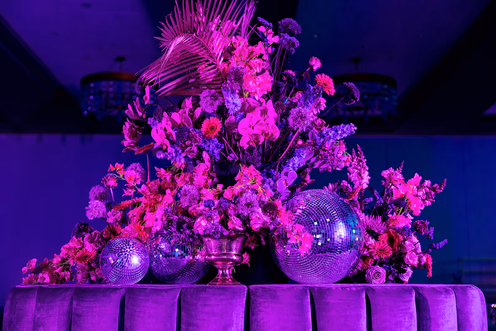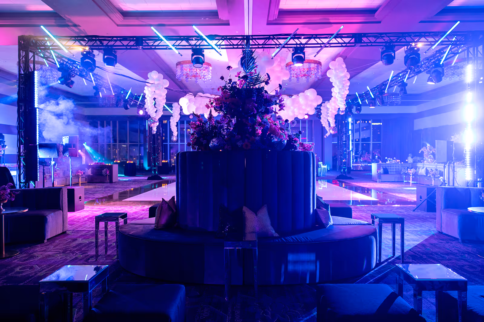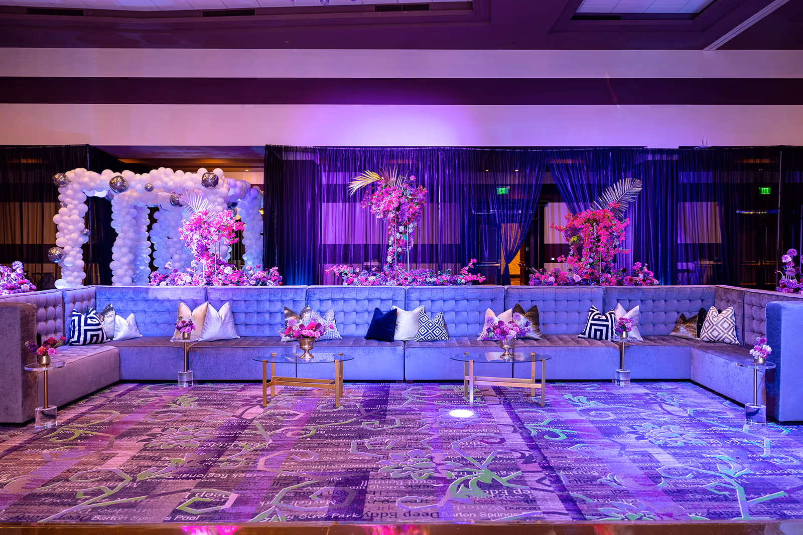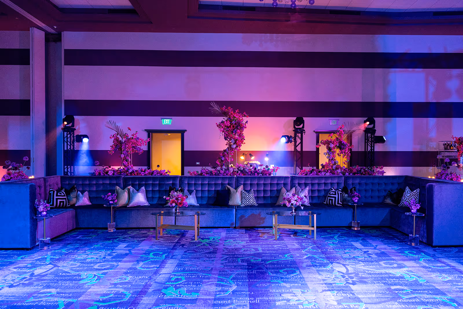 The ballroom was transformed into a vibrant oasis with lush floral installations in deep purples and fuchsia hues, perfectly complementing the modern elegance of the Fairmont. Guests were greeted by a dramatic floral archway framing the elevated stage, where live music and dance performances took place throughout the night.