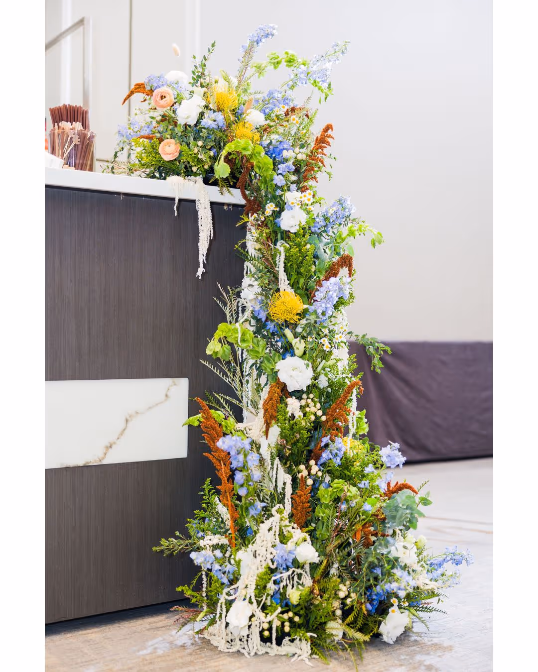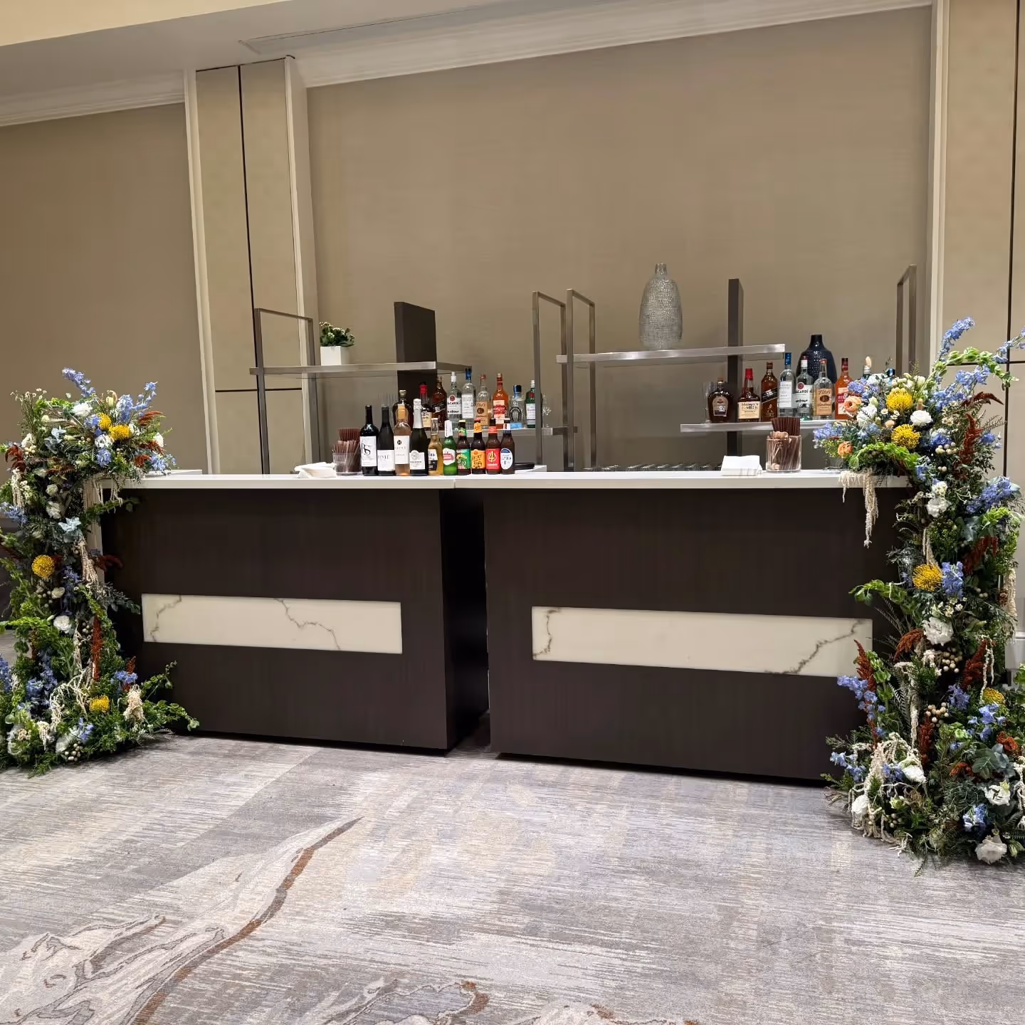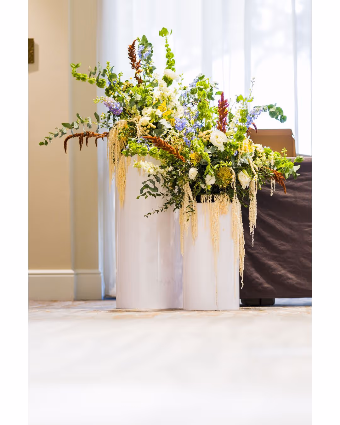 The sign-in table also received a touch of our signature style, seamlessly blending with the overall theme. We utilized our elegant white columns as pedestals for striking floral toppers. These arrangements echoed the sophisticated yet natural feel of the bar flowers, offering a welcoming and memorable first impression for guests as they arrived.