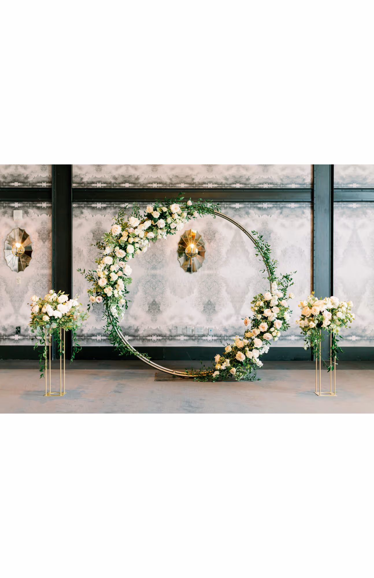 Gabby and Logan's wedding day was such a classic wedding day with a beautiful modern touch. We used traditional white and ivory tones with blush accents in all of the wedding and reception floral. The bridesmaids and groomsmen all had similar but different floral designs where the bride and groom had lighter tones and premium floral and really stood out among all of the flowers. We used out 7ft tall stainless steel flat bottom wreath rental along with our gold harlow stands on each side of the ceremony alter. Then, after the wedding we used the wreath as the head table backdrop and the gold stands down the head table. For their cake we used flowers to match the bride's premium floral and cascaded down the front.