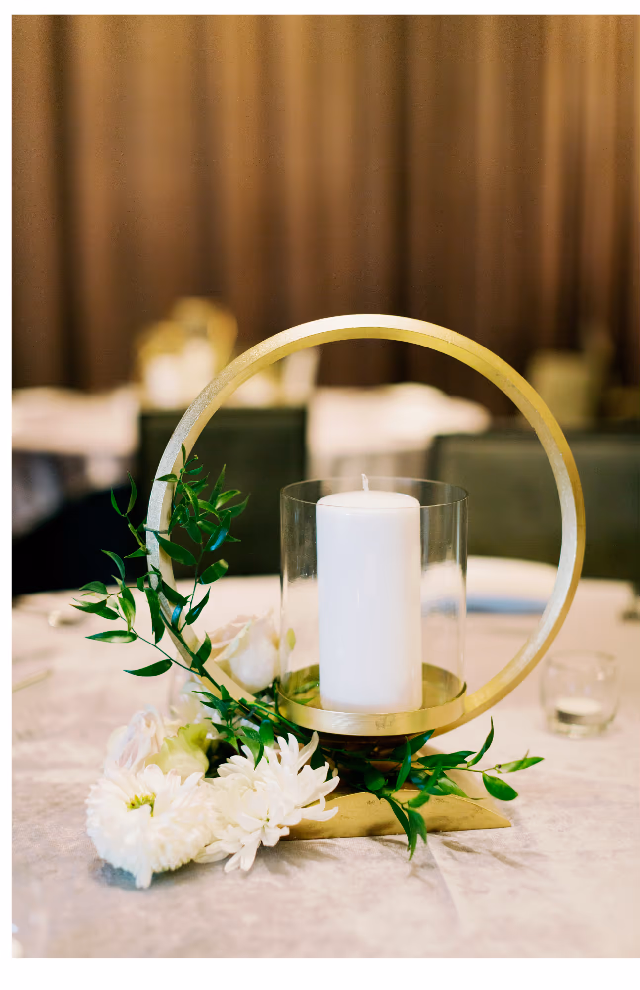 Following the heartfelt ceremony, guests moved to the reception, where candlelight flickered, casting a warm glow over the tables. The reception centerpieces were exquisite, with table flowers continuing the elegant theme and adding a touch of romance to the celebration. The reception decor was a perfect blend of rustic charm and sophisticated elegance.