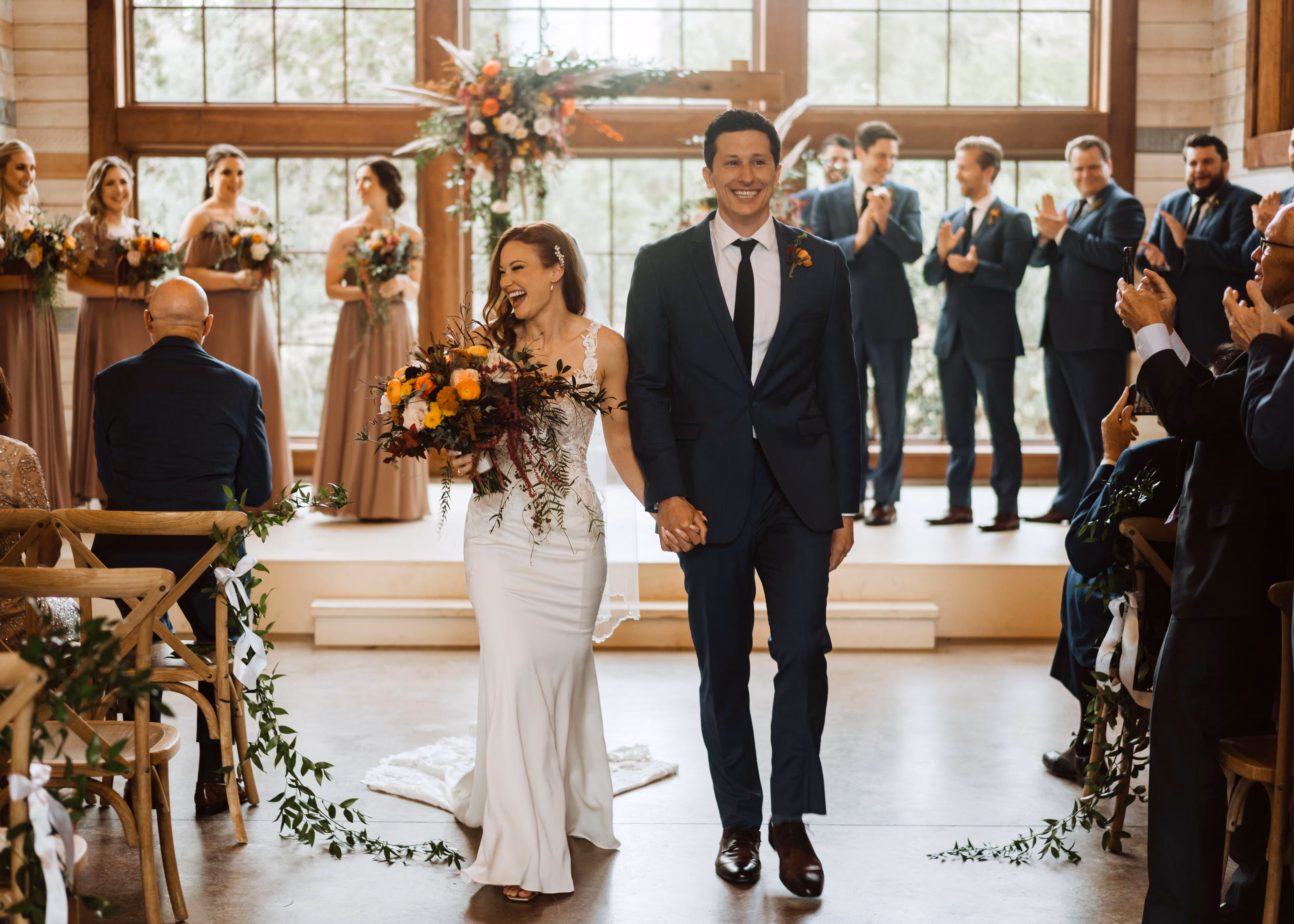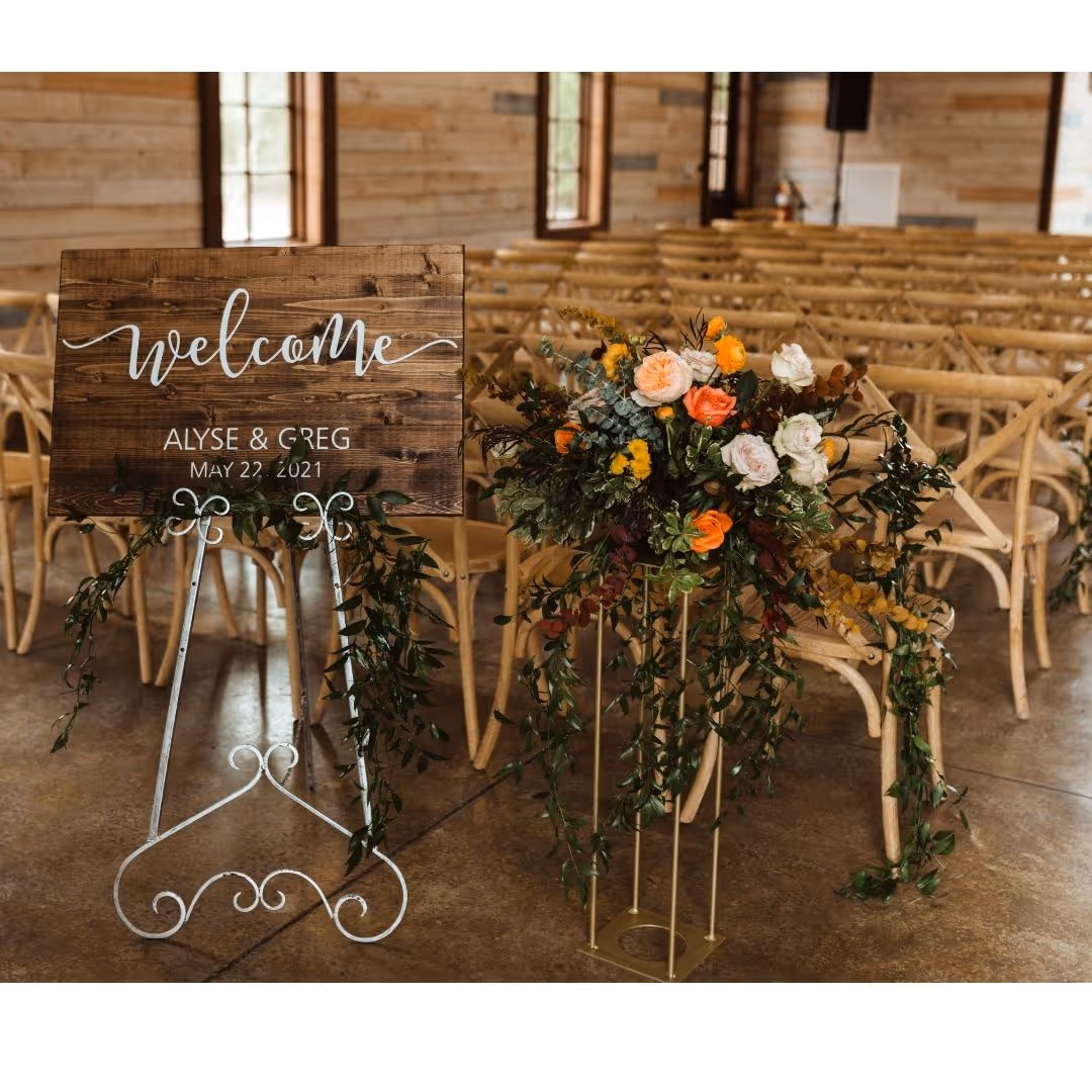 Warm natural tones with gold and burgundy pops, and coral orange tones was the color scheme for Alyse & Greg's hill country wedding day at Morgan Creek Barn. We used our ceder arch ceremony rental for the alter in front of the venues large open windows. For the aisle floral we used greenery swag attachments flowing from the top to the bottom of the chairs tapering off on the ground. When guest entered the ceremony area they were greeted with aisle flowers on top of our gold 31" metal harlow stands next to the welcome sign. We used greenery around the welcome sign and sign in table. For the ceremony we repurposed the flower from the ceremony to the reception tables with the ceremony alter attachments on top of the fireplace mantle and the tall gold stands arrangements on the tables. For the cocktail tables we used our rental bud vases and gold candle votive. Congratulations to our beautiful bride and groom on their special wedding day!