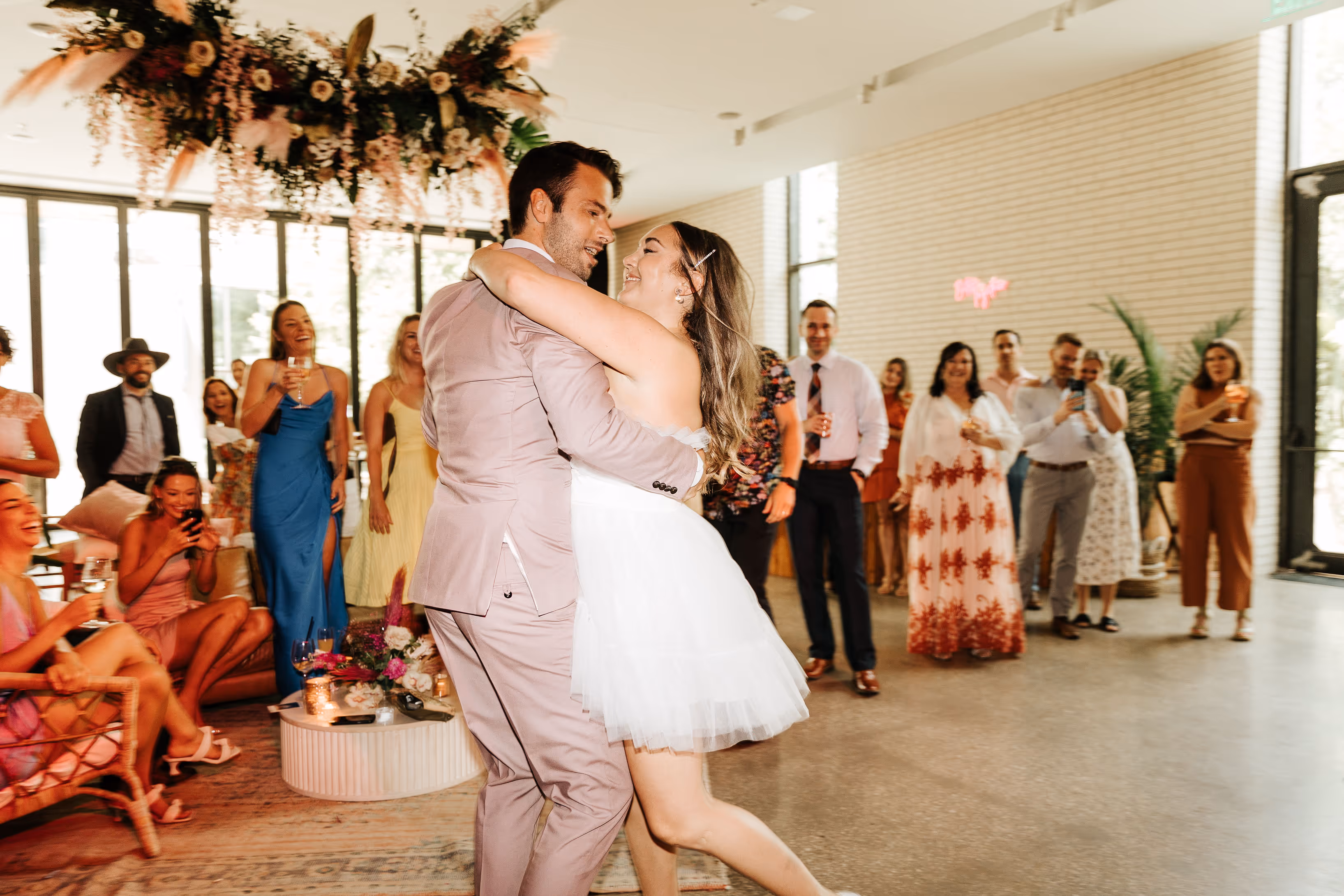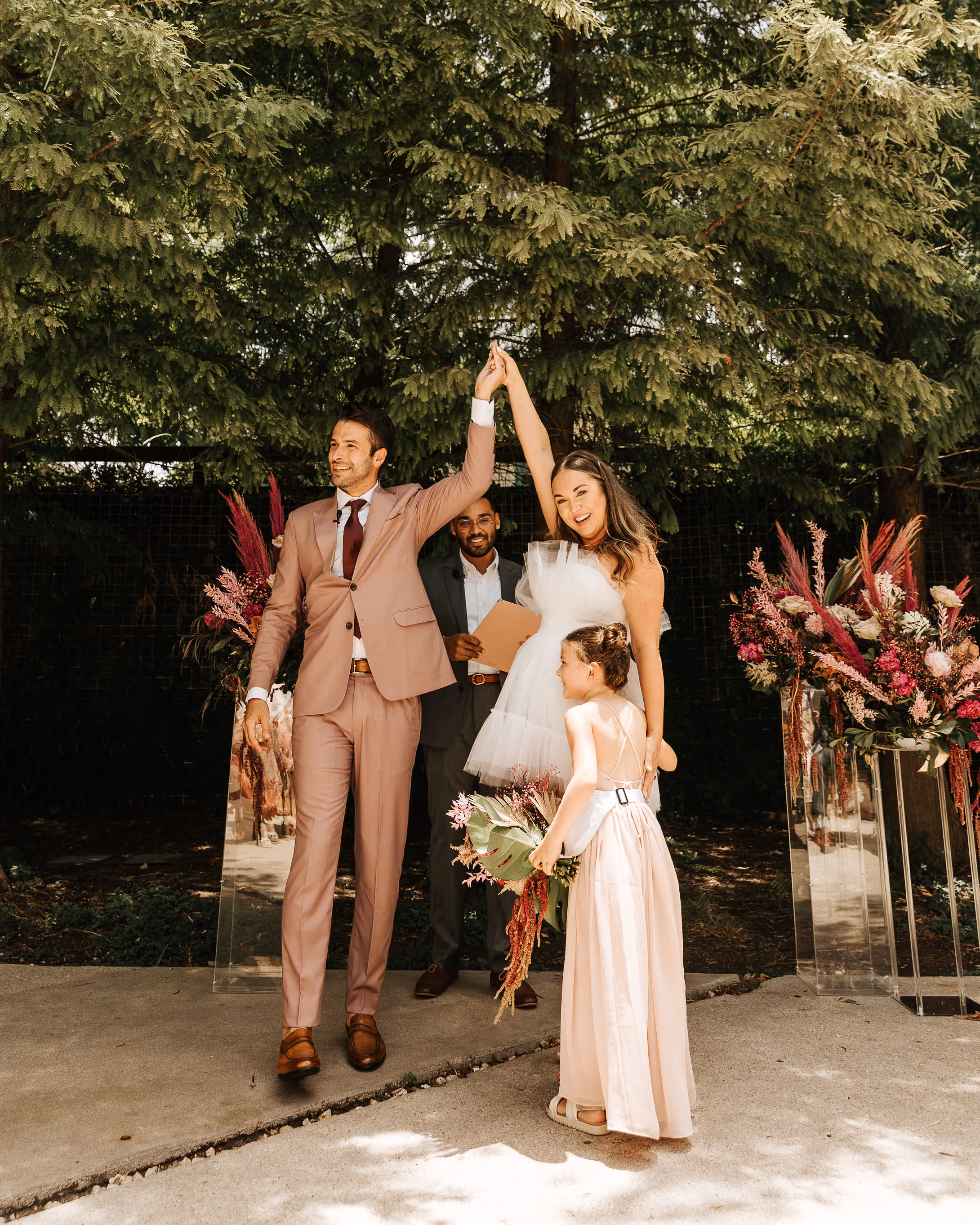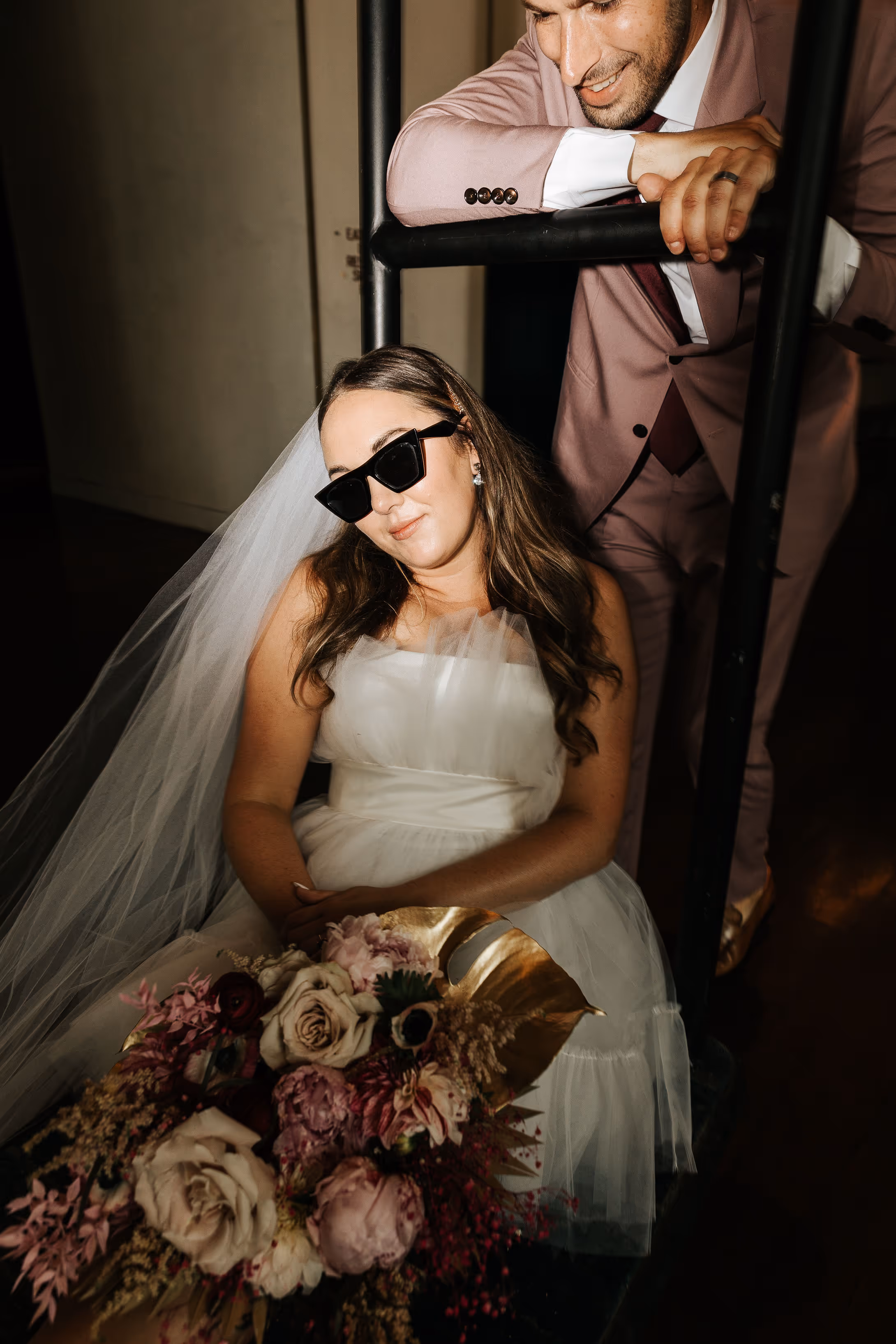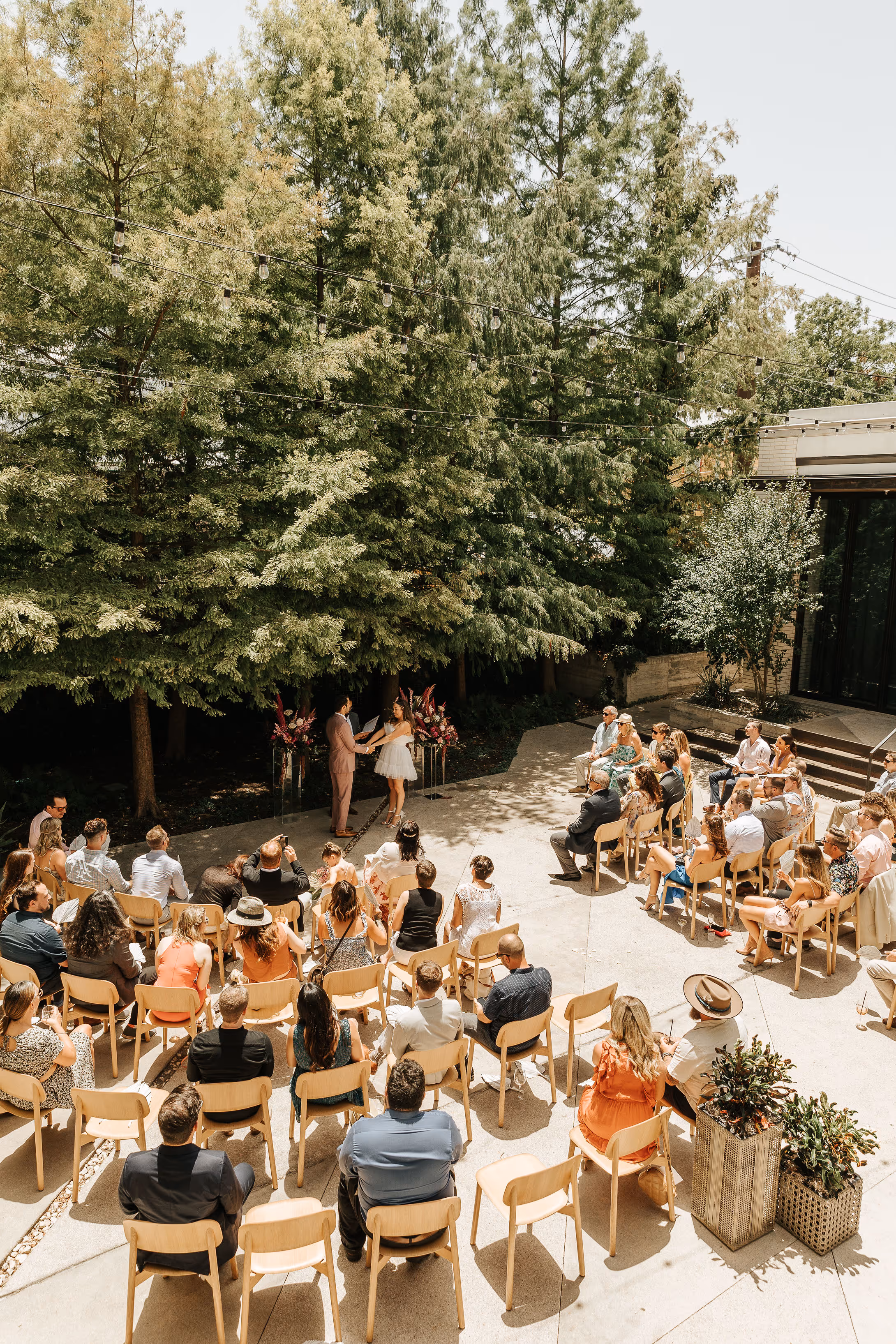OMG! Check out this amazing fun, colorful, Sunday, Funday, Brunch wedding day of Jaycie and Bo's at South Congress hotel!!! We did an AMAZING flower ceiling installation that was the perfect for their reception lounge area! Their wedding day was unlike any other wedding we have done and we freaking loved it!!! Champagne before noon on Sunday? No formal sit down dinner, all super fun, chill, and plenty of rocking! The ceremony flowers were reused at the reception for the champagne tower. Instead of the traditional sit down meal, South Congress Hotel had plenty of passed apps, and food stations set up for the guest to mingle, eat, and dance. A telephone wase set up for guests to leave messages for the couple and we used all hot pink and fuscia! The wedding flowers were like something from a Malibu Barbie wedding...in our dreams;) Take a look at this incredible wedding! Yes flower ceiling install is real and it was a real awe factor. The install was hanging from 20 ft ceiling and was 12 ft long which required 3 florists. Wedding Vendors who also brought this event to life: