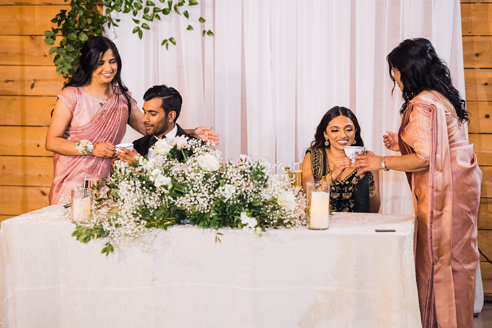 Adding another layer of cultural richness to the day was the tea ceremony, resplendent in traditional red and gold. This intimate and meaningful ritual offered a beautiful contrast to the white, blush, and navy theme, honoring heritage and creating cherished moments for the couple and their families.