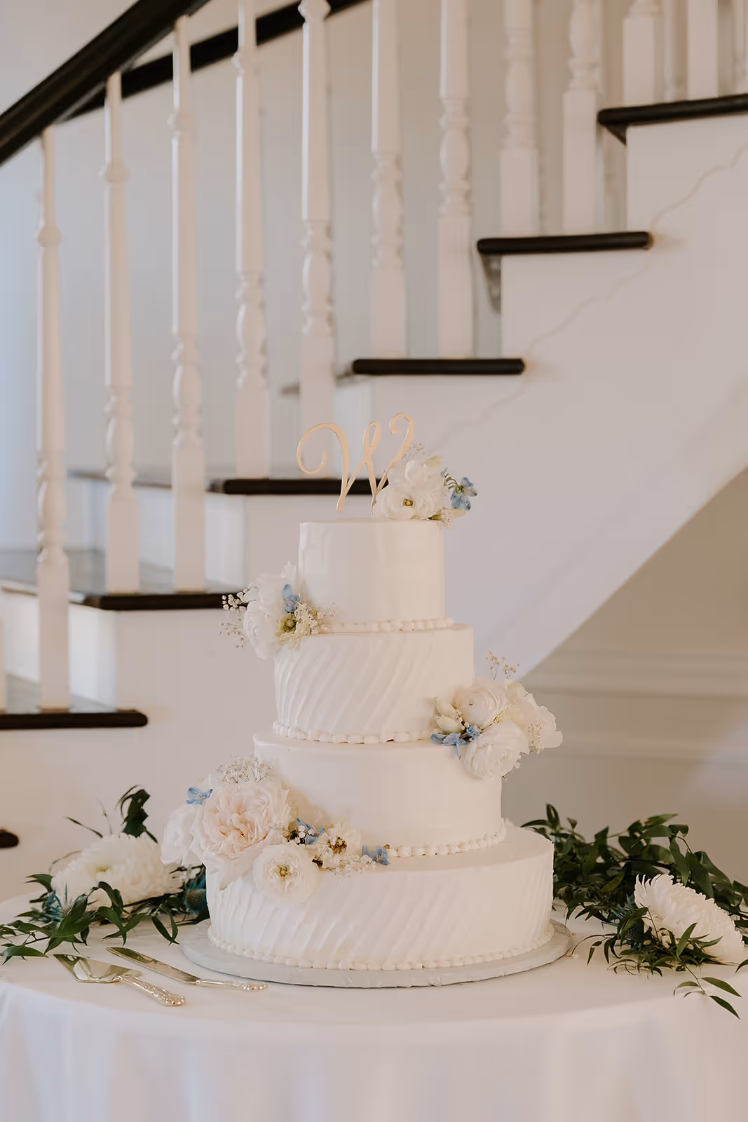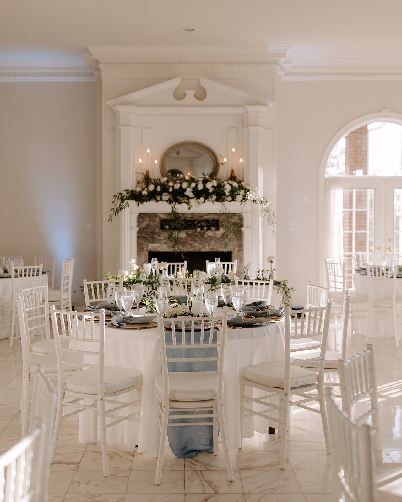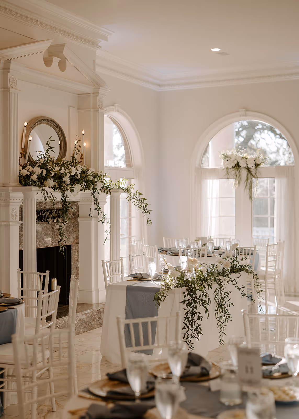 The reception entrance was nothing short of awe-inspiring. Guests ascended a grand stairwell, which had been transformed into a floral masterpiece. Eucalyptus garlands interspersed with fresh white blooms framed the staircase, setting the tone for an unforgettable evening. This lush installation was a perfect prelude to the elegance of the reception space, where subtle blue accents and classic floral arrangements brought the couple’s vision to life.