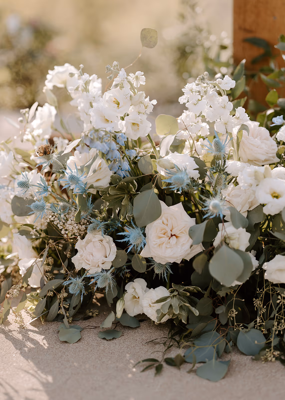 The ceremony took place overlooking the Colorado River, with the golden hues of a Texas sunset providing a breathtaking backdrop. At the center of this serene setting stood a handcrafted cross adorned with cascading florals, meticulously designed to complement the couple's sophisticated style. Soft white roses, delicate ivory blooms, and lush greenery wove through the cross, with an elegant arrangement at its base to ground the scene in natural beauty. As Jordan and Colleen exchanged vows, the setting sun cast a warm glow, creating a moment of pure magic for the couple and their guests.