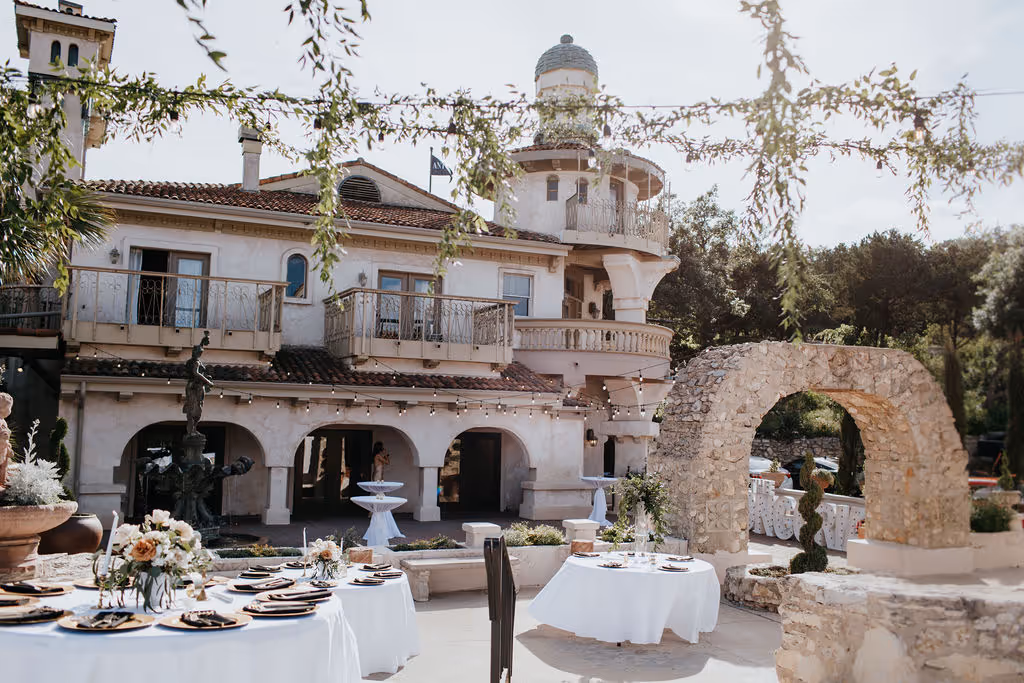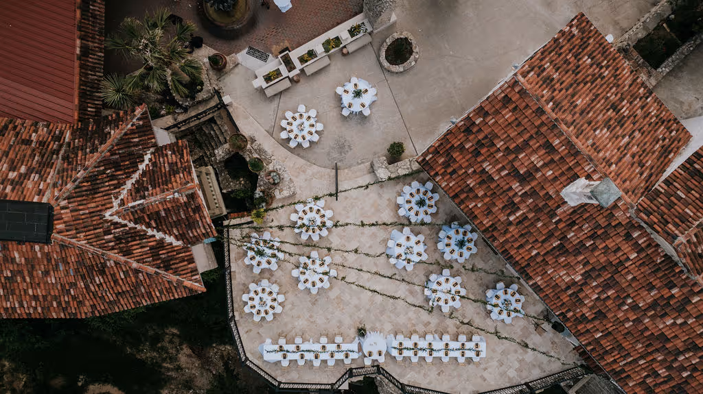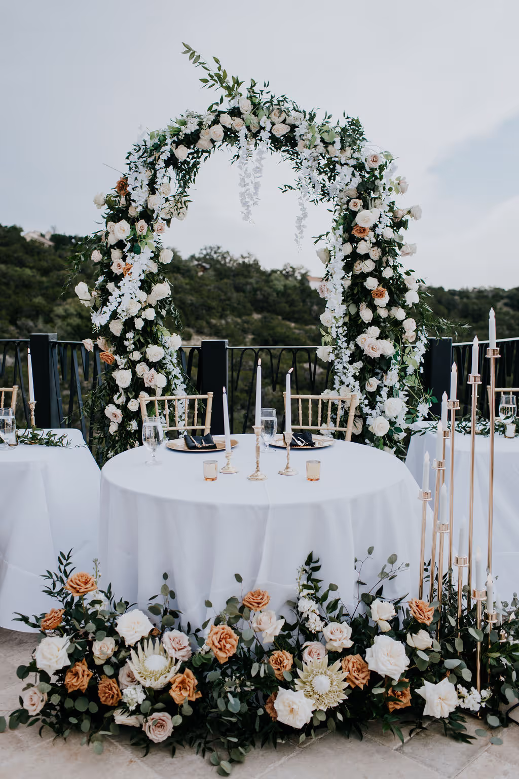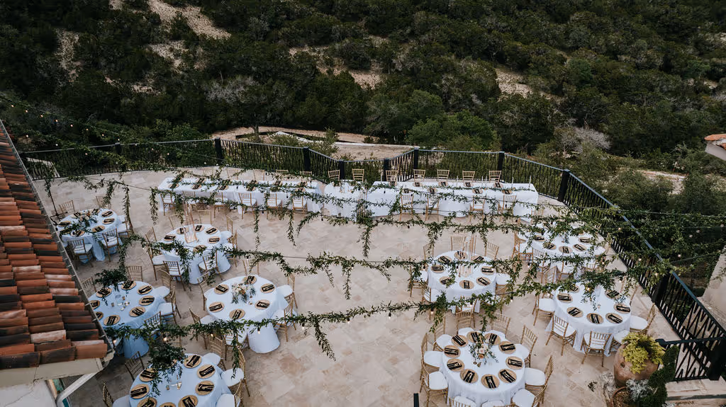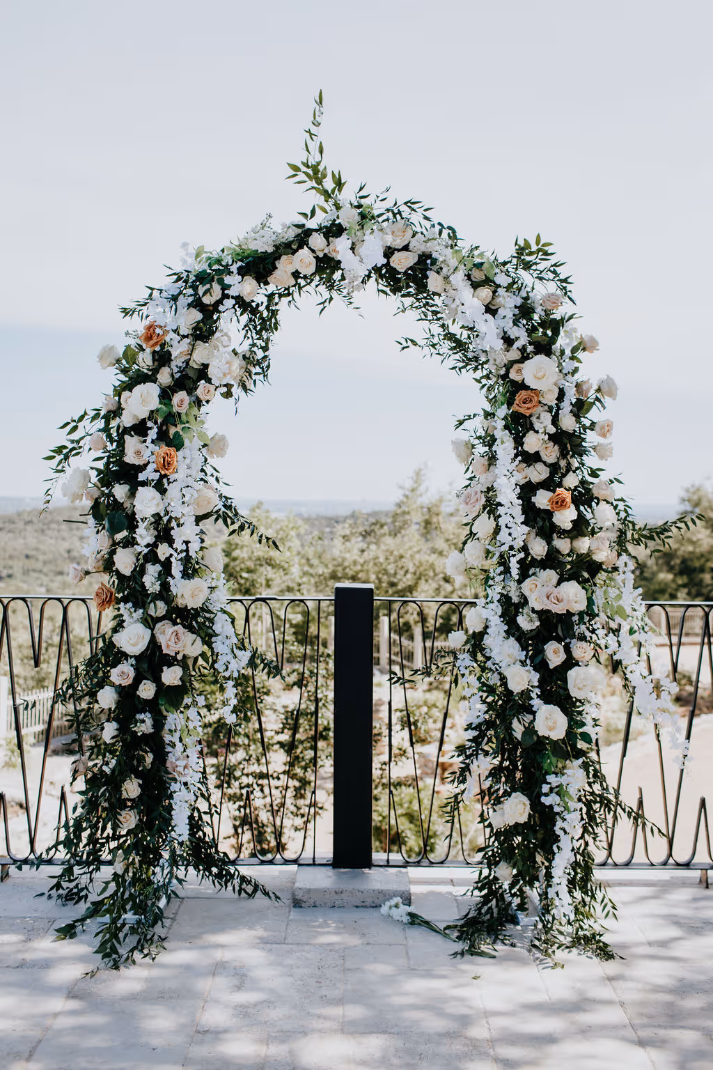 Villa Antonia is by far one of our most classic timeless favorite venues to work at! We are their preferred florist vendor and they ours, and what's not to love? I mean, have you seen this venue?! With ceremony balcony views that overlook the entire hill country mountain views, to a chapel that is straight from a movie, multiple amazing water fountains, and best yet a feel that when you step on the venue site you feel as if you are in Italy or Spain. We had the opportunity to bring Josh and Drew's sexy elegant wedding to life this past spring and boy oh boy did this wedding give us all the fun wedding day vibes! Some key features we would like to point out to their wedding day were their ceremony to reception flip to really make their sweetheart table pictures pop and frame the newlyweds but their reception with sprawling greenery hanging from their bistro strand twinkle lights, this wedding was one to remember! We used their aisle markers that welcomed guest as they entered down the aisle as the base to their sweetheart table, their full floral ceremony arch as their sweetheart table backdrop, candles to create the warm romantic ambiance at every tables, and full floral centerpieces to really elevate the tables and tie everything together. Their outdoor ceremony and indoor reception in the wine cellar chapel was so gorgeous. They had they used a super cool vintage sports car as their getaway, vintage cake for all the sexy vibes, and our favorite champagne tower for every guest to enjoy and the perfect photo moment.