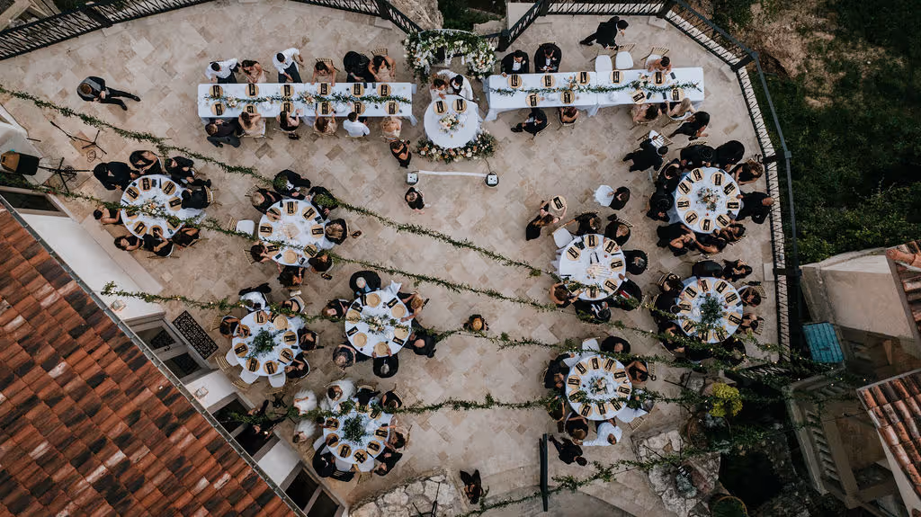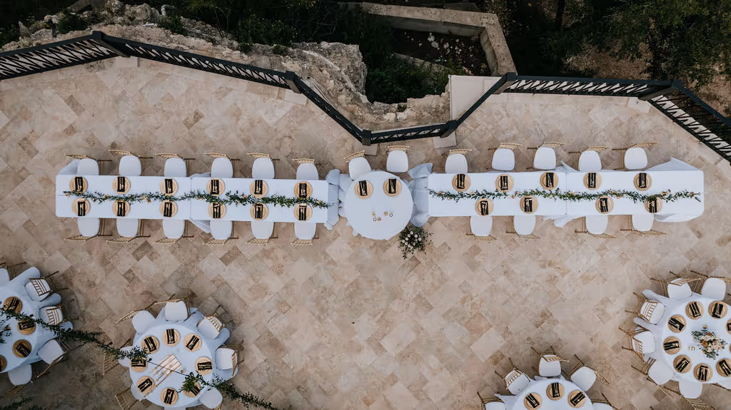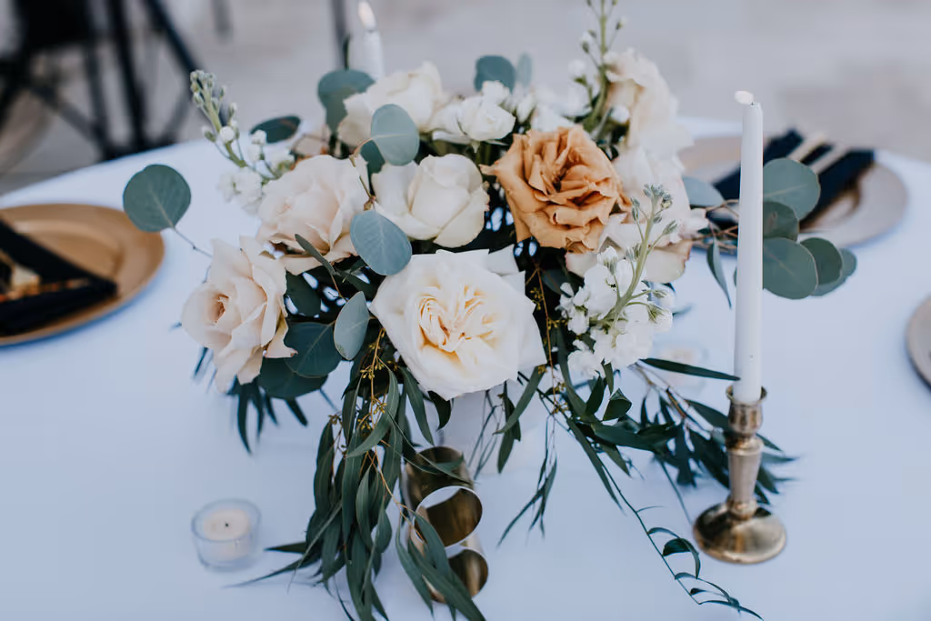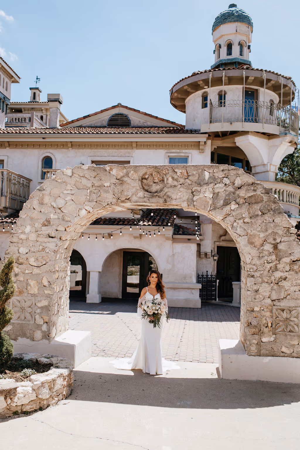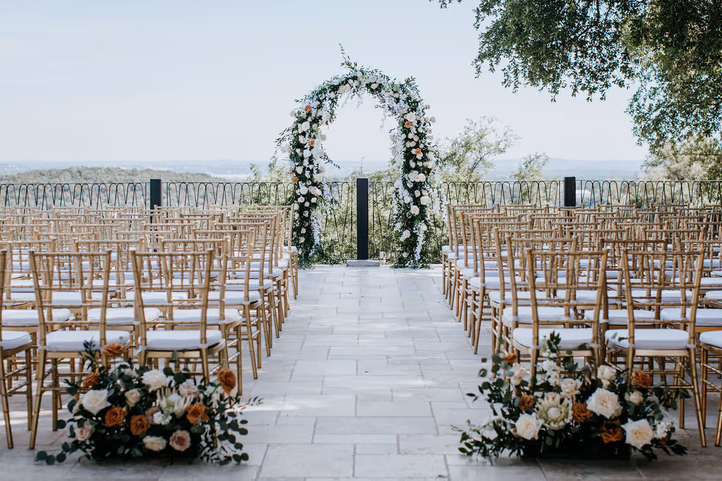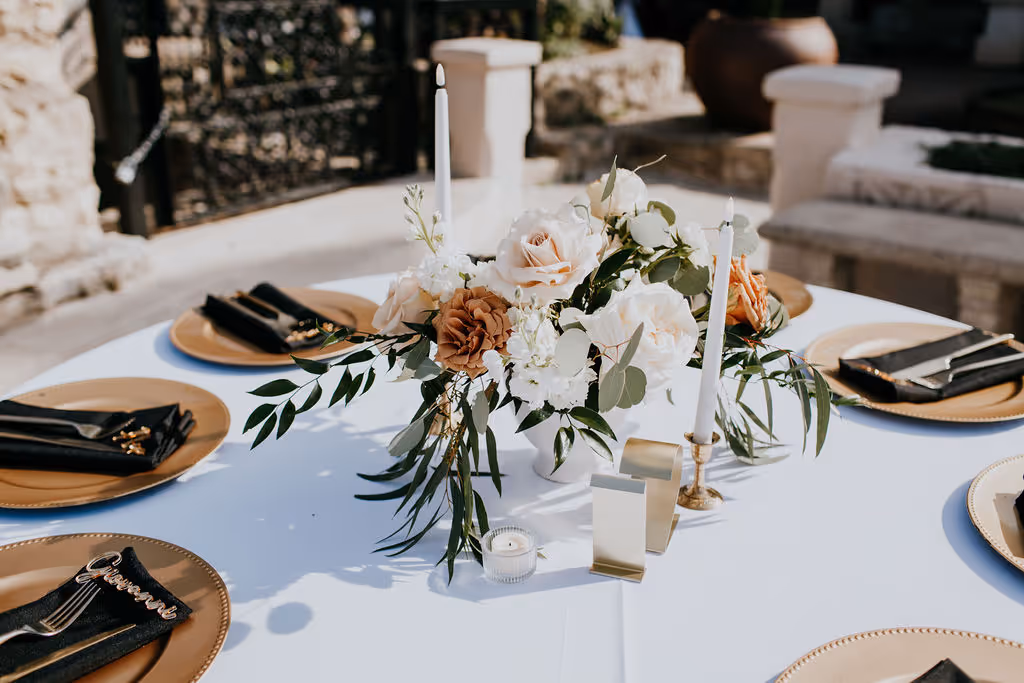 Villa Antonia is by far one of our most classic timeless favorite venues to work at! We are their preferred florist vendor and they ours, and what's not to love? I mean, have you seen this venue?! With ceremony balcony views that overlook the entire hill country mountain views, to a chapel that is straight from a movie, multiple amazing water fountains, and best yet a feel that when you step on the venue site you feel as if you are in Italy or Spain. We had the opportunity to bring Josh and Drew's sexy elegant wedding to life this past spring and boy oh boy did this wedding give us all the fun wedding day vibes! Some key features we would like to point out to their wedding day were their ceremony to reception flip to really make their sweetheart table pictures pop and frame the newlyweds but their reception with sprawling greenery hanging from their bistro strand twinkle lights, this wedding was one to remember! We used their aisle markers that welcomed guest as they entered down the aisle as the base to their sweetheart table, their full floral ceremony arch as their sweetheart table backdrop, candles to create the warm romantic ambiance at every tables, and full floral centerpieces to really elevate the tables and tie everything together. Their outdoor ceremony and indoor reception in the wine cellar chapel was so gorgeous. They had they used a super cool vintage sports car as their getaway, vintage cake for all the sexy vibes, and our favorite champagne tower for every guest to enjoy and the perfect photo moment.