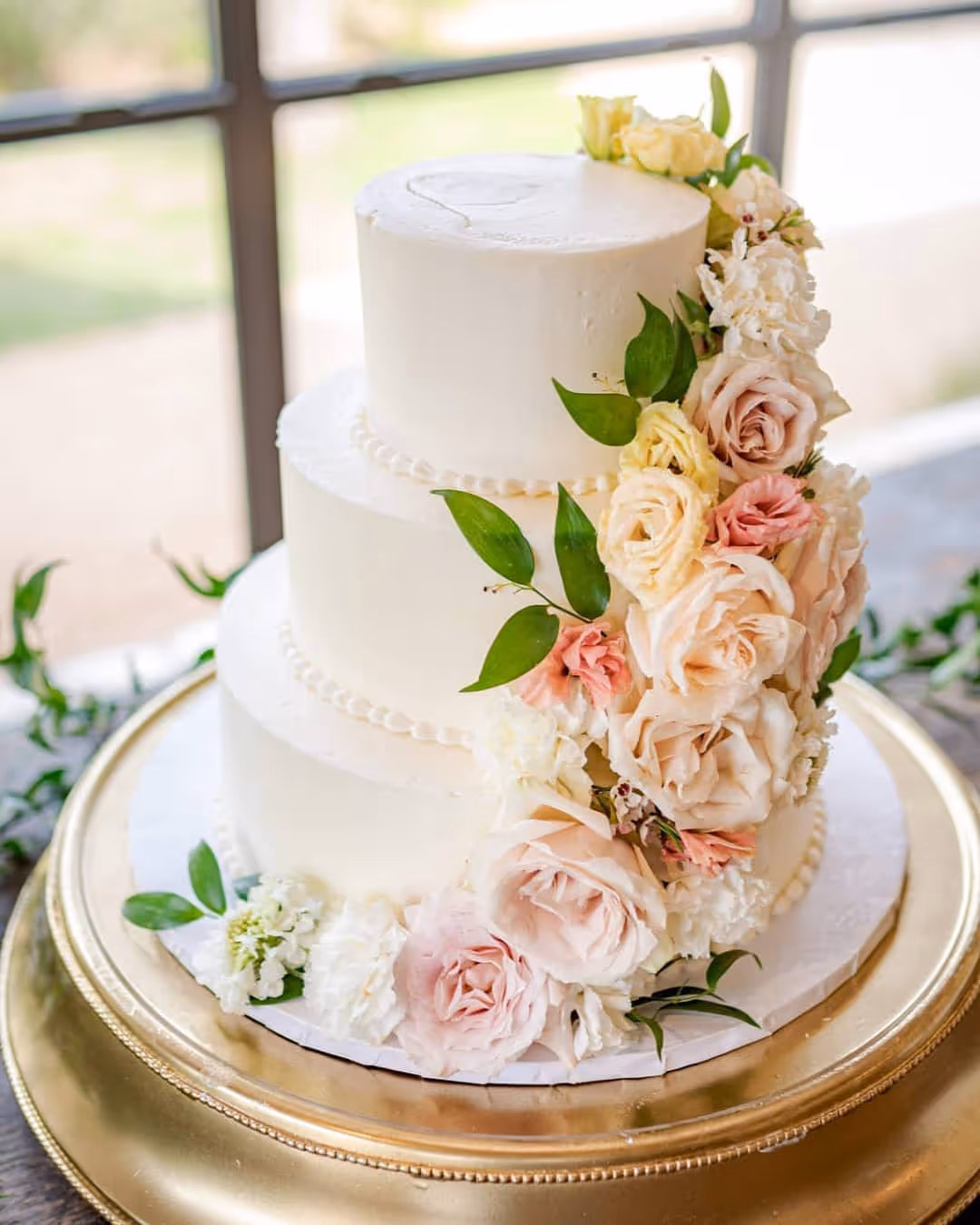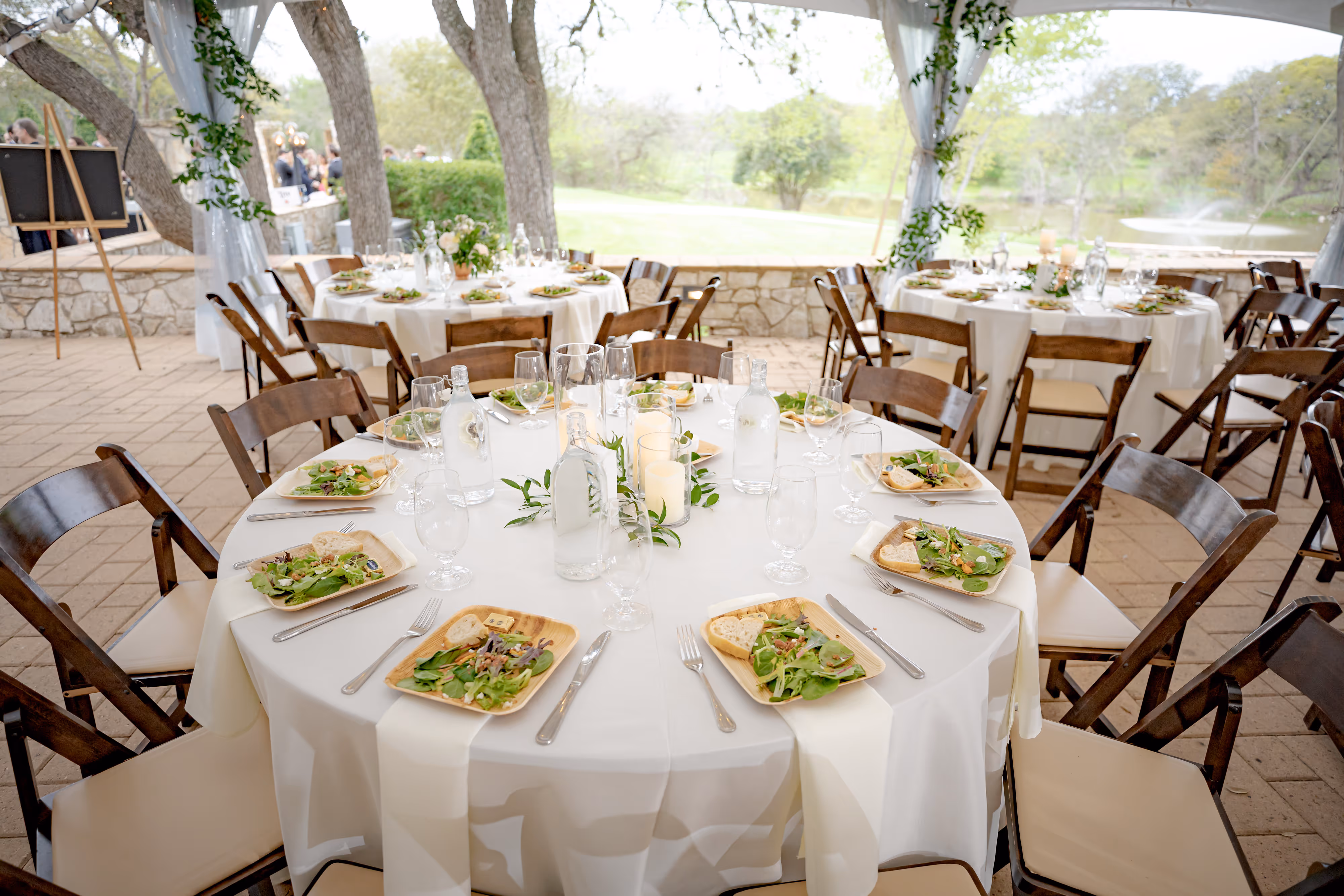 Inside, the reception tables were a vision of sophisticated simplicity. Rich blue linens provided a striking contrast to the soft hues of the floral arrangements. Our signature decor candle trios, accented with delicate greenery and flowers, cast a warm, inviting glow, creating an intimate and romantic ambiance for dinner and celebration. And, of course, no celebration is complete without a masterpiece, and Michelle's Patisserie delivered a stunning cake that was as delicious as it was beautiful.