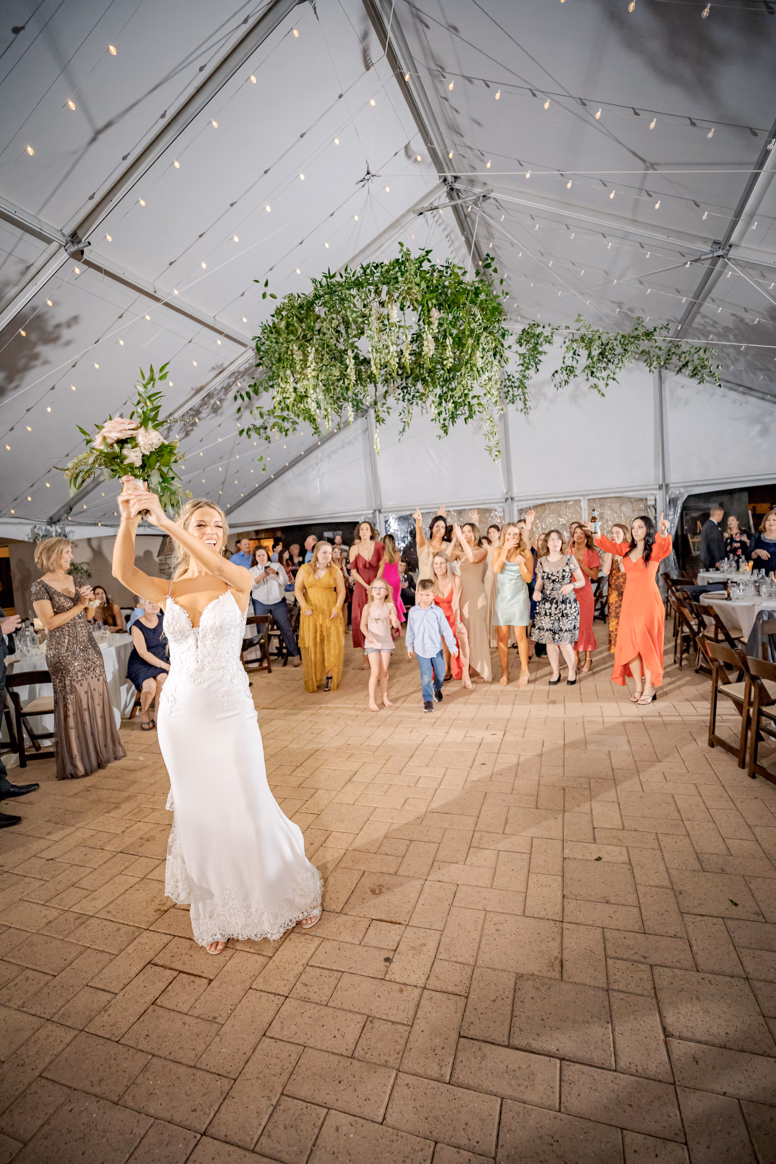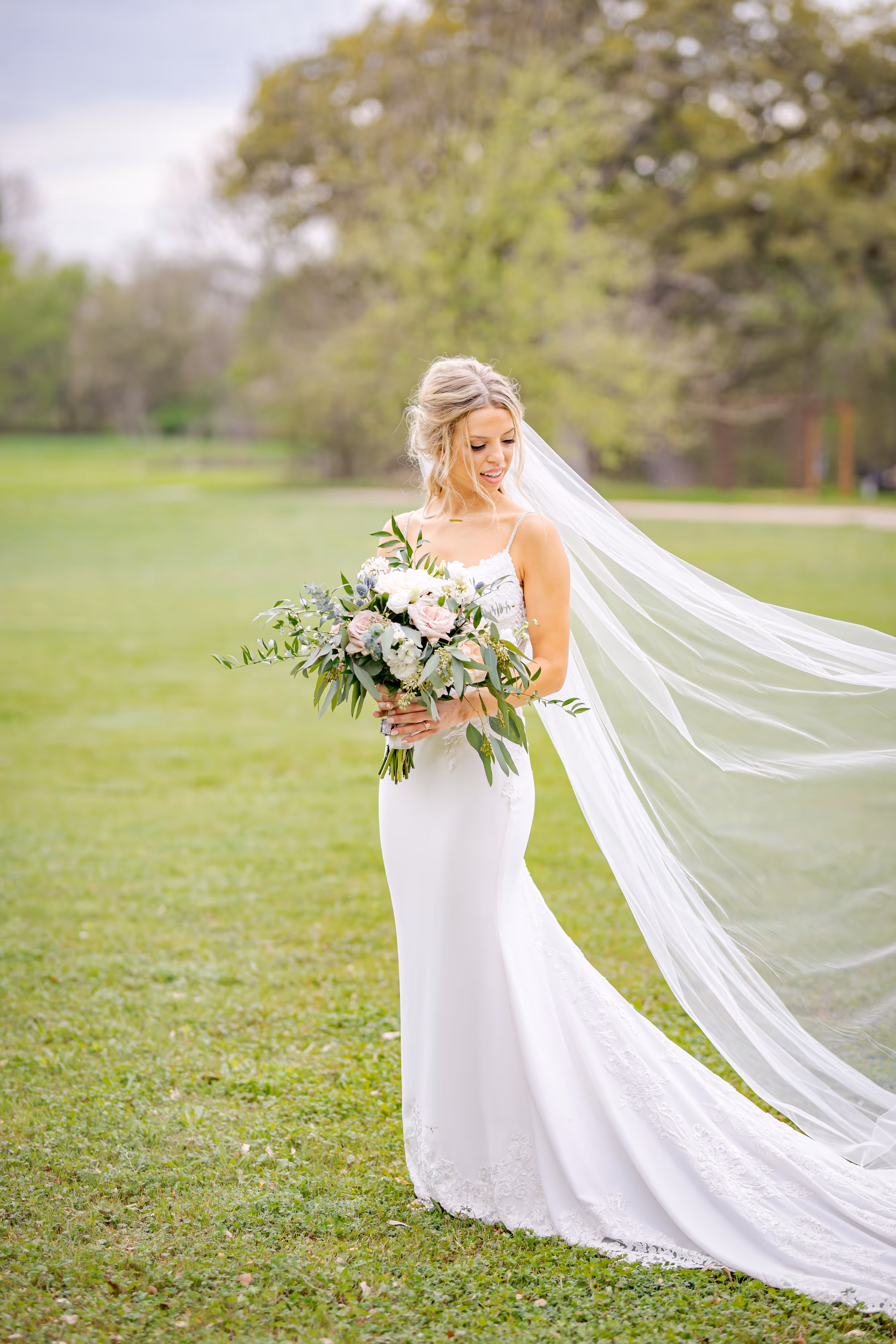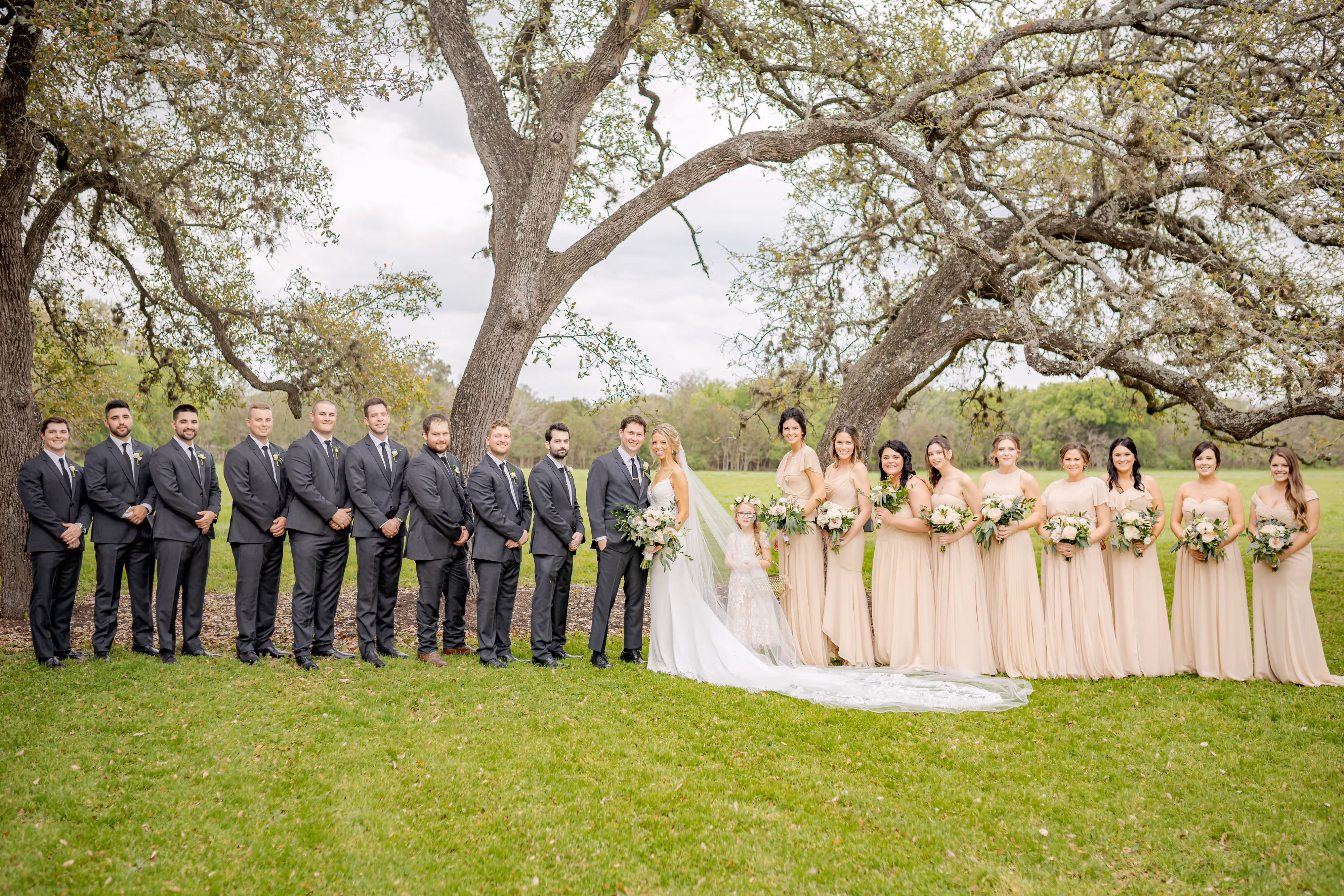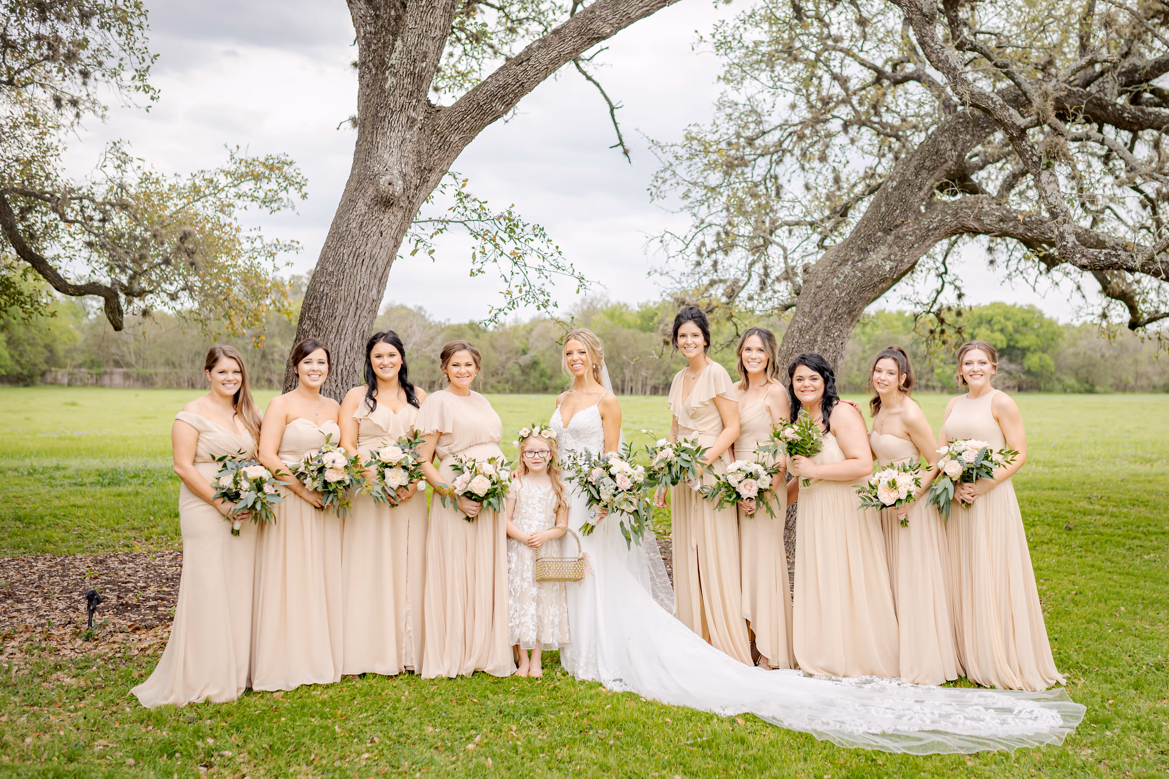 Kacie and Adam had a beautiful outdoor spring time hill country wedding at The Vineyards at Chapel Lodge. We used native hill country floral in white and blush with gold accents. We had our 7ft wreath alter designed to match the bride's bouquet filled with roses and greenery under their gigantic oak trees. The reception was amazing under their tented patio with string lights! As soon as you walked in your eyes went straight to the 6ft wide custom floral and greenery chandelier floral fixture. Smilax greenery sprawled down across the tops of the tents and flowed down the poles to hide a lot of the tent mechanics and create an outdoor inside feel. Take us back to this day we loved every moment of their wedding flowers. Classic gold revere bowls with greenery and floral cascading out mixed with a hurricane candle candle set mixed with our mercury glass pillar candles and LED lights.