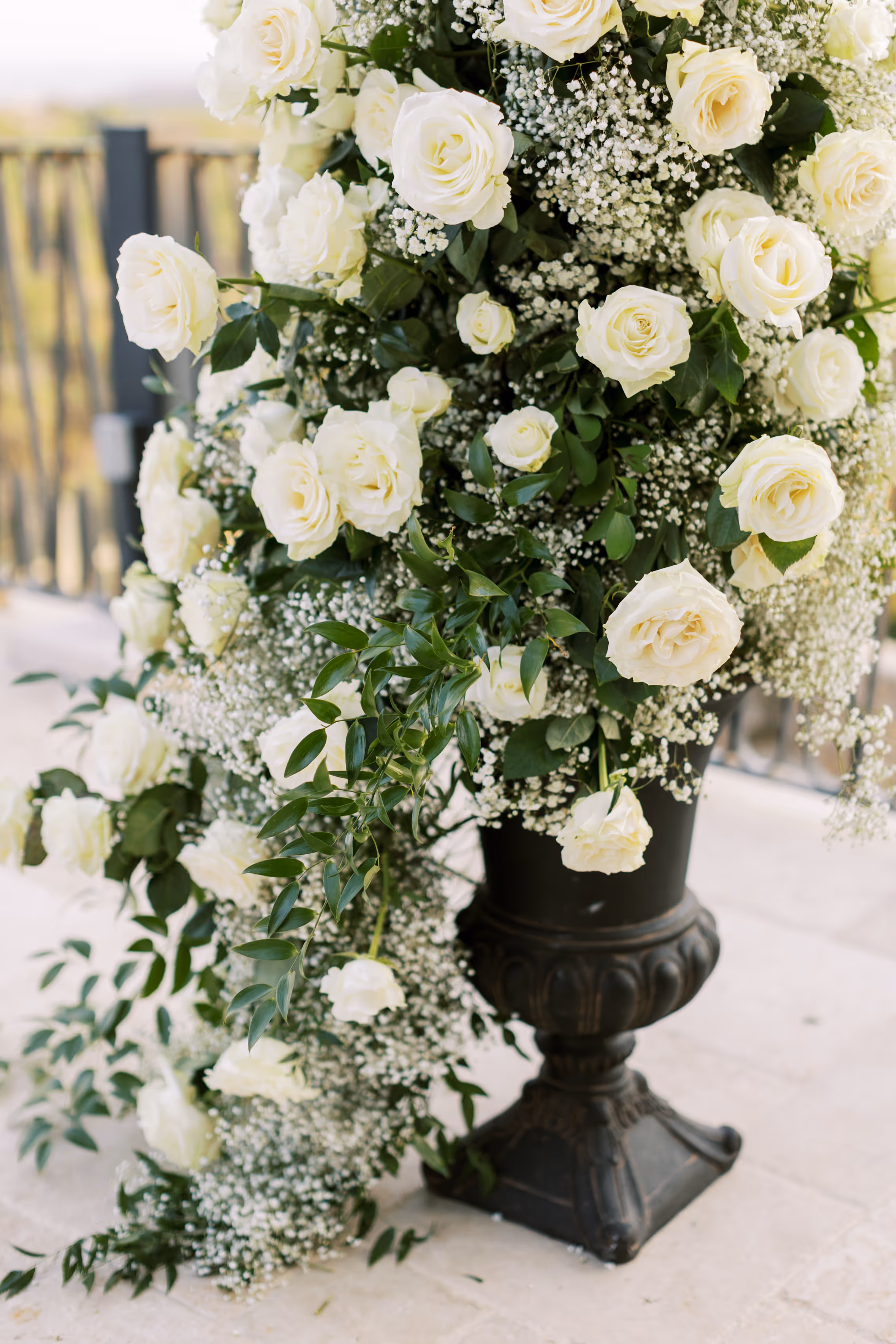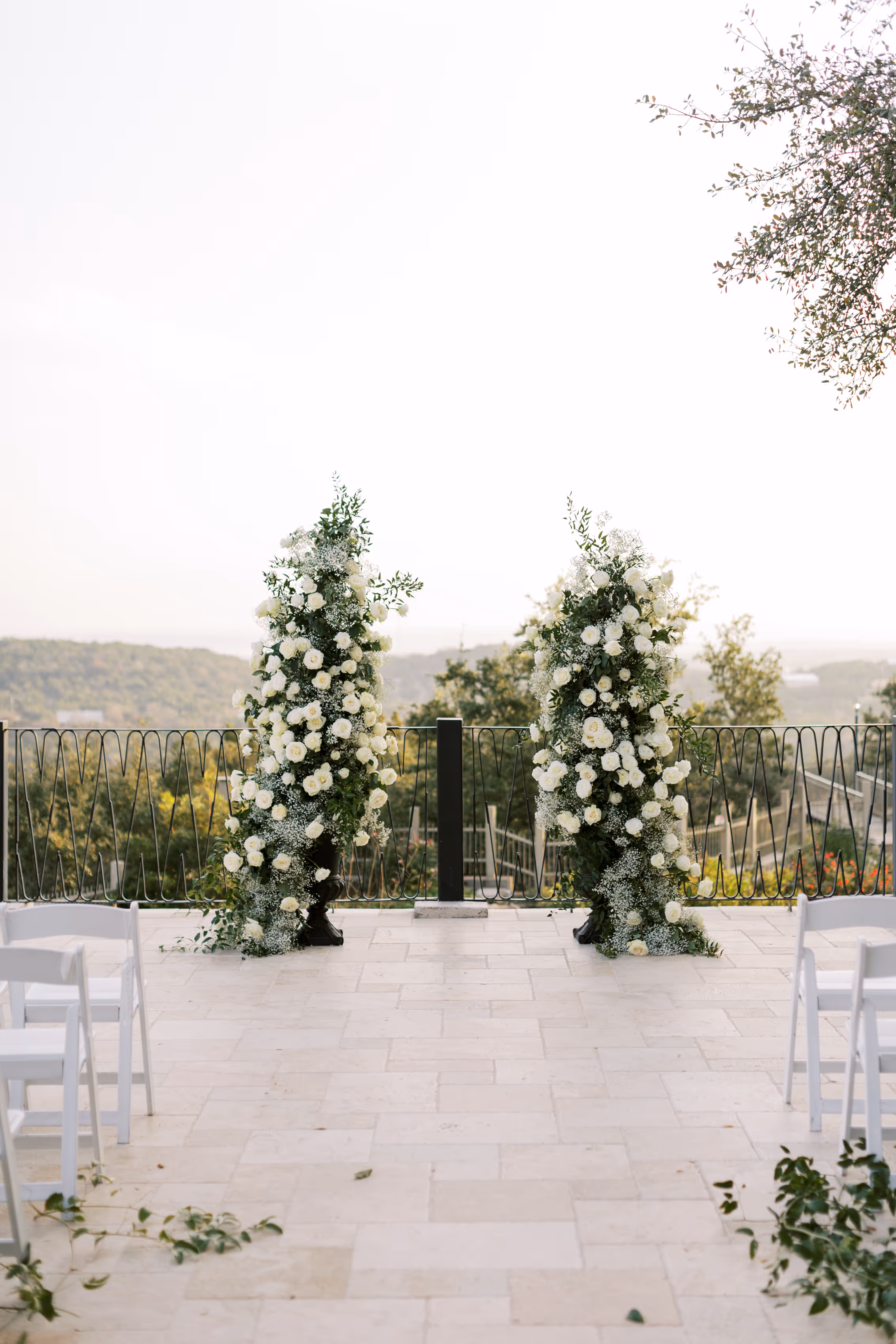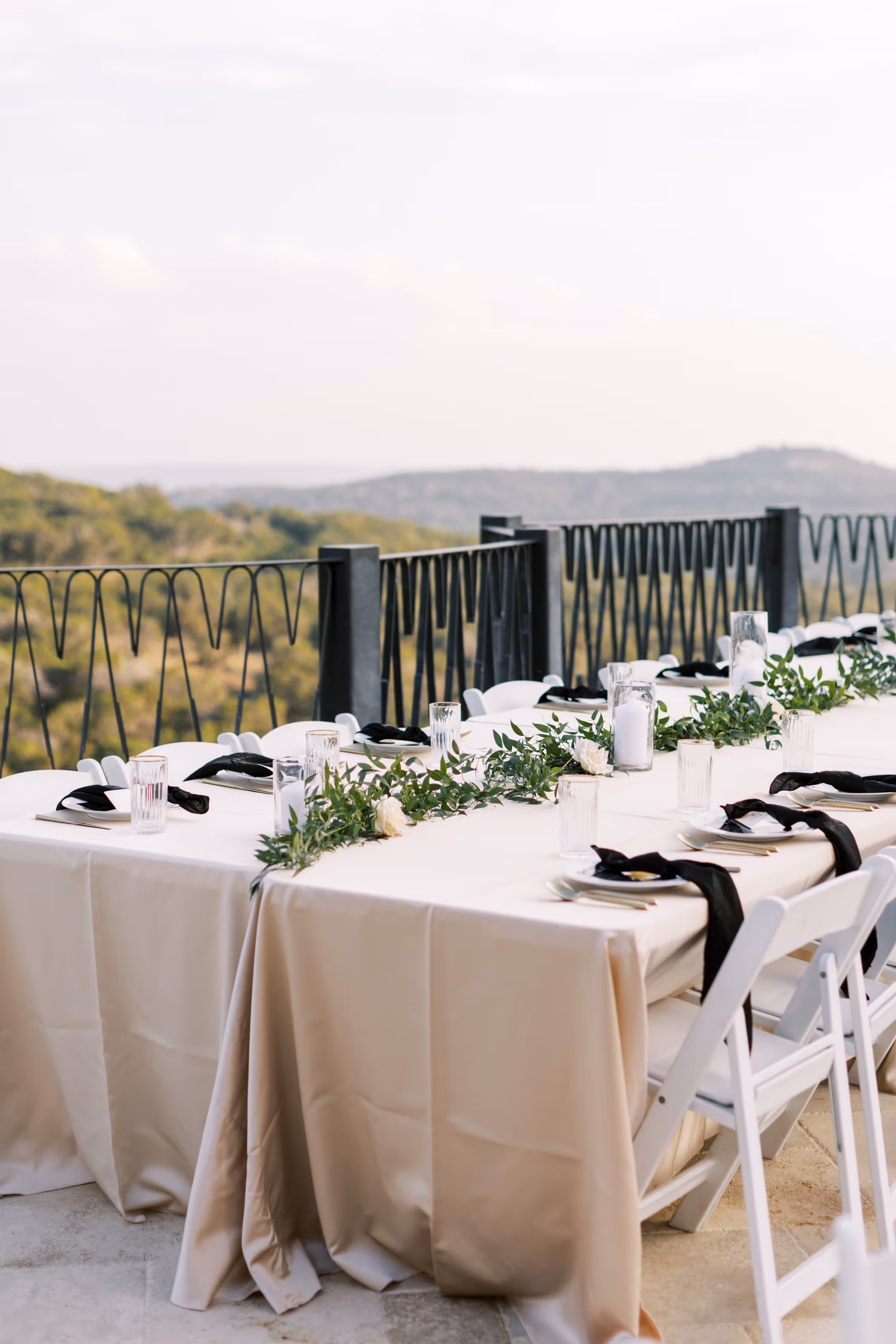 The most rewarding part of the job is seeing our beautiful floral come to life in photographers picture!! I mean don't get me wrong, we do not depart until the whole site looks amazing, but "wow" seeing everything in use and come to life is what we miss once we are done setting up. These photographs are so amazingly beautiful, and make our team so happy. The wedding colors were rich emerald green, white, and ivory. I absolutely adored working with Kaitlyn and Jacob, and I am so grateful for the opportunity they provided our team with. We used smilax over all of the hanging light floral over the terrace. It was a great touch in th evening having hanging light greenery, but especially on the fountain. The water fountain had greenery our favorite floating floral. There were soo many floating white candles it was the most perfectly romantic touch. To be apart of such a special day in their life is such an extreme compliment to Jordan Flowers & Events. We loved EVERYTHING about their wedding day, especially their beautiful ceremony site, colors, and florals; elegant, timeless, classic, and most of all soooo lovely. Champagne cocktail table linens with greenery smilax tie backs or white linen with greenery smilax tie back at Villa Antonia? We like them both! You can never go wrong with a classic cocktail table tie back instead of an arrangement outside to help tie back the linens and prevent them from blowing every where. beautiful