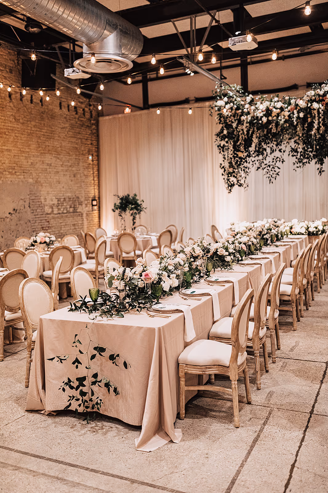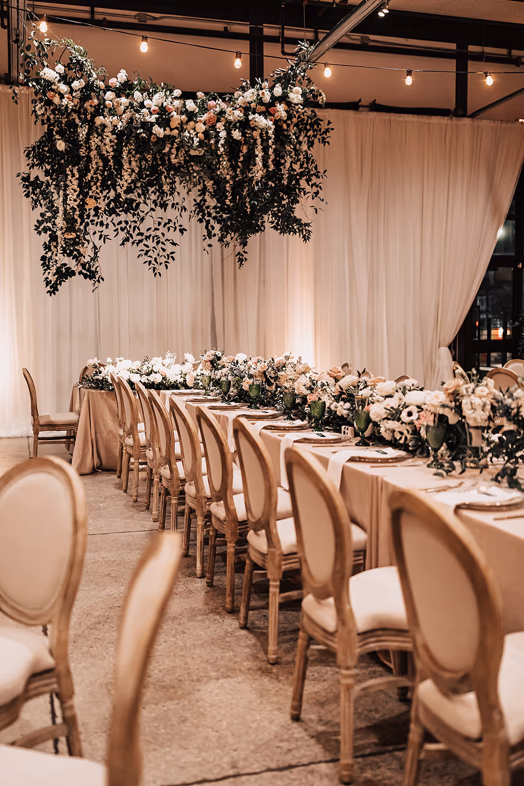 But the magic didn't stop there. The cherry blossoms from the chuppah also flowed seamlessly into a spectacular ceiling installation. This intricate and eye-catching arrangement created a sense of wonder and transformed the space into a blooming wonderland. Our team loves a good challenge, and a ceiling installation is always a highlight for us.