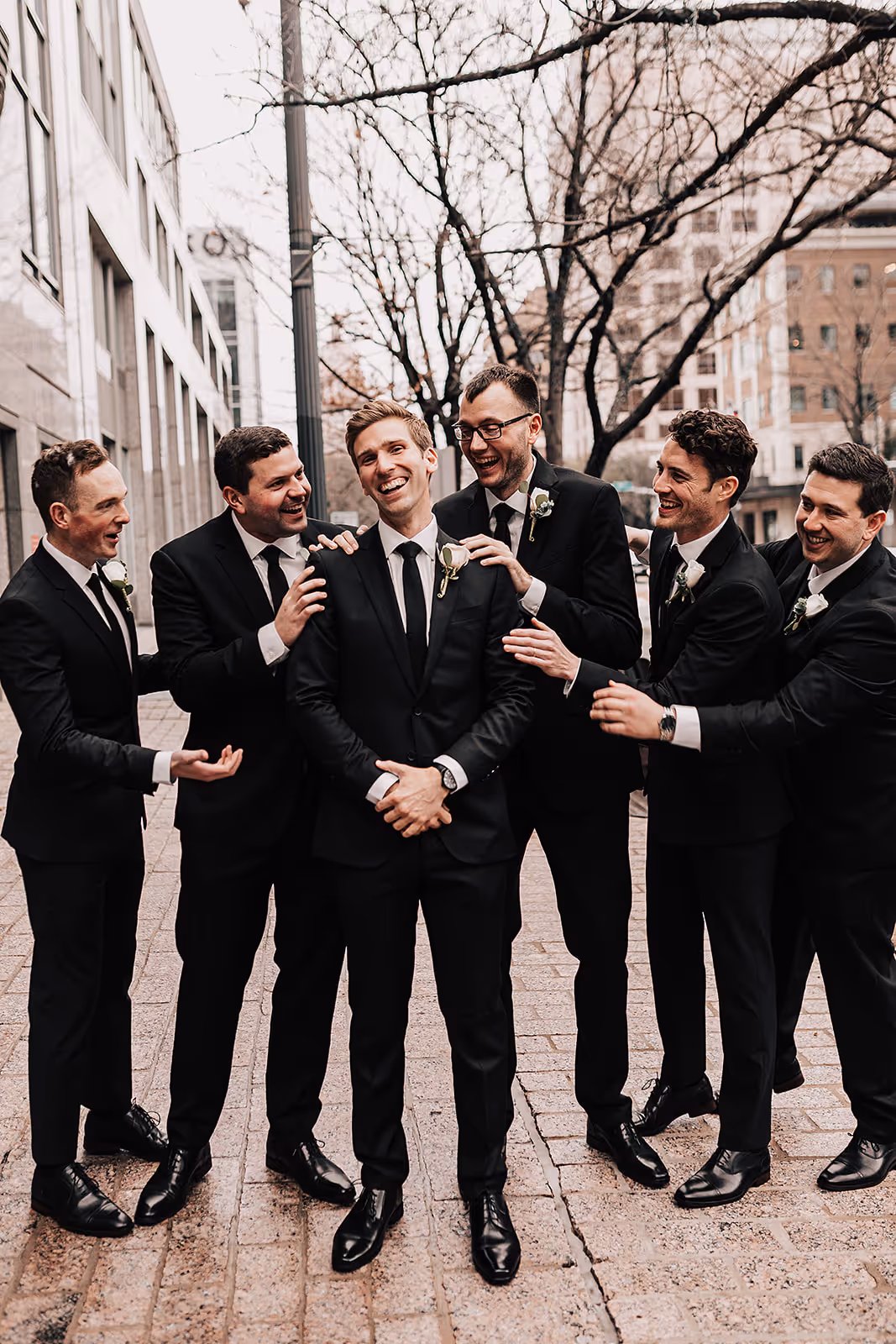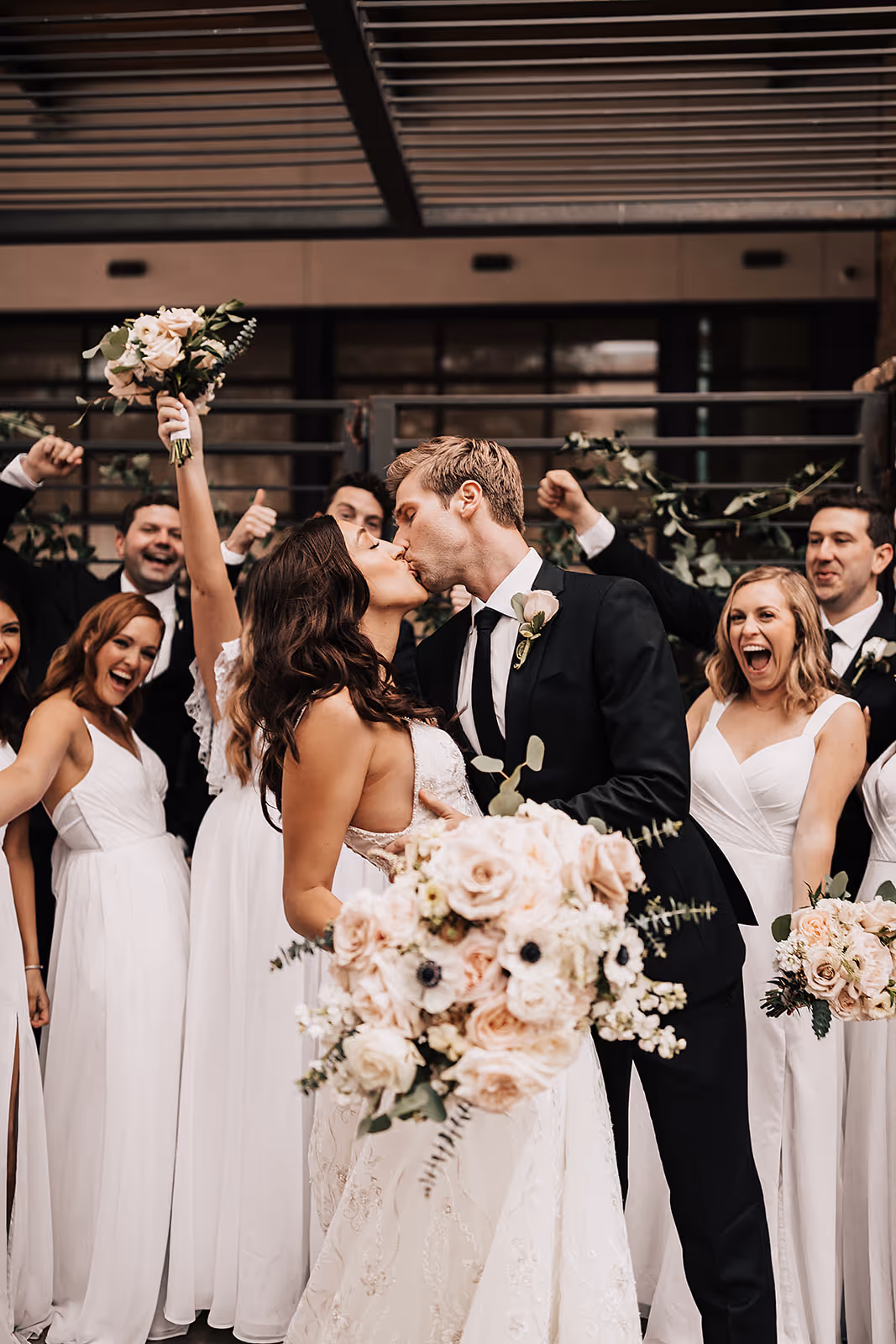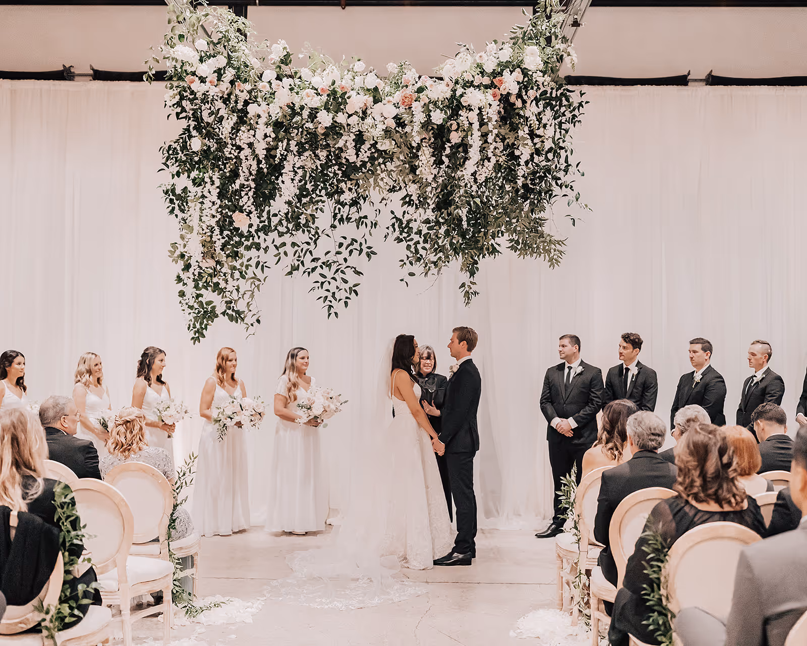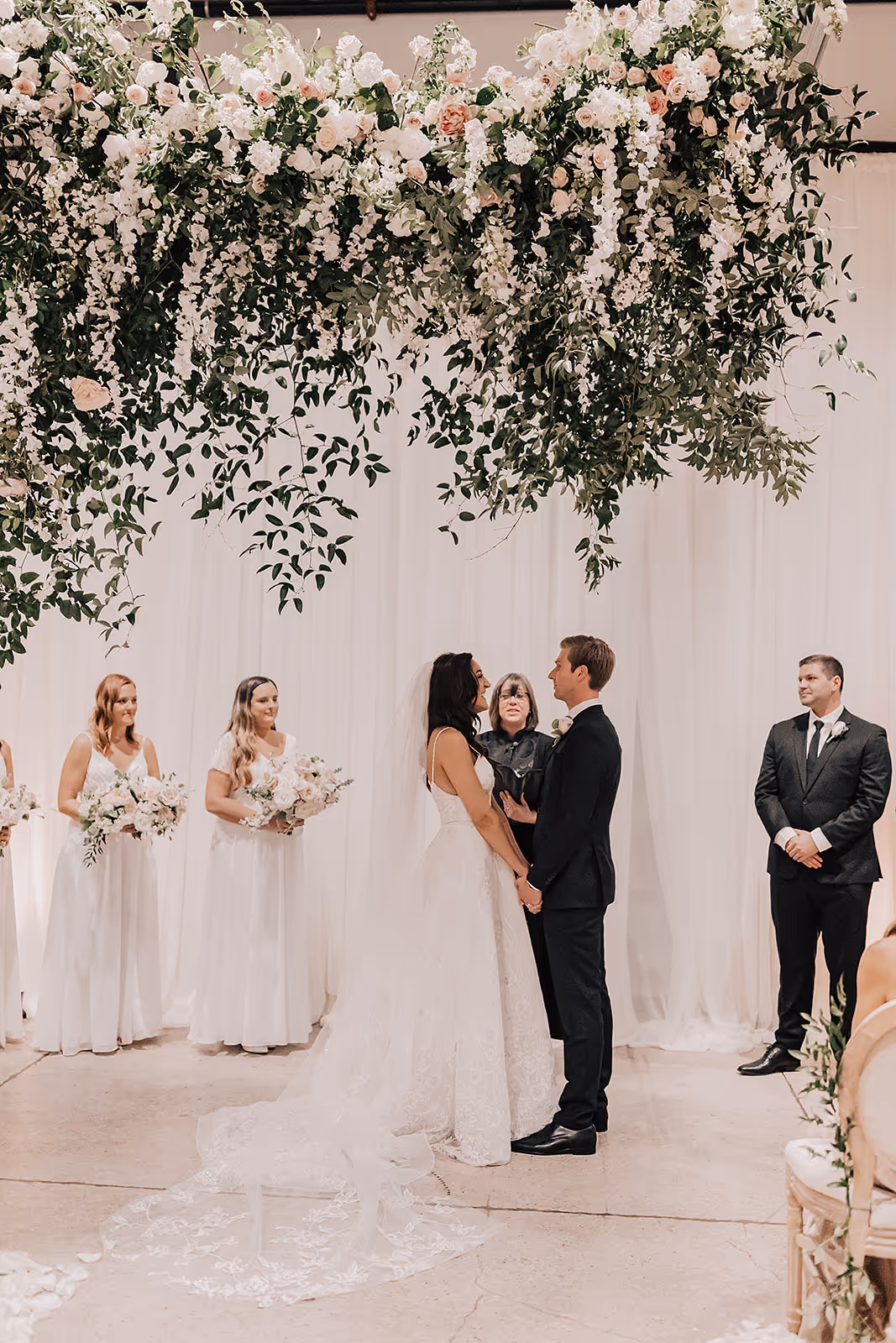 When it comes to weddings we will never forget, Kara and Zach's take the cake. It is by far one of top favorite weddings we had the opportunity to be apart of. It was the ultimate secret garden in an urban city come to life wedding ever and that is exactly how our client's wanted it. The wedding took place on Congress Avenue at the beautiful 800 Congress across the street from the Capital building and Paramount Theater. The venue is very urban and industrial with it's cement and unfinished vintage brick walls and metal air intakes. However, our client's were from California and LOVED flowers ...and the city, so why not combine the two? Our favorite flower hanging installation was at the ceremony. Our flower team designed a 10 ft long by 12 ft high hanging floral chandelier arch. Their aisle was lined by lush ivory white petals that combined;texture, color, and fragrance while keeping everything minimal and modern while the arch was the frame for this lovely bridal party. After the ceremony the arch became their sweetheart table chandelier while their head table had 42" long flower trays full of garden rose and peony mixtures and greenery to create the ultimate floral runner and head table. Greenery tapered off the ends tying the guest tables to the head table. The round guest tables were similar but different. Half of the tables had full premium pedalstool urn vase arrangements while the other half on the outside of the room had tall cylinder vase arrangements with full greenery mixtures over head transforming the warehouse like venue to a stunning flower and greenery mixture. We loved EVERYTHING about their wedding day! Check it out below to fall in love as well.