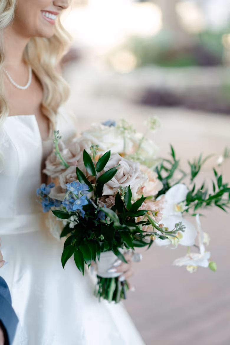The bride's bouquet was a masterpiece, a true reflection of her style and the wedding's color palette. Fragrant jasmine vines cascaded gracefully, intertwining with the delicate beauty of anemones, the lush fullness of dahlias, and the striking blue delphinium accents. It was a breathtaking accessory that perfectly completed her bridal look.