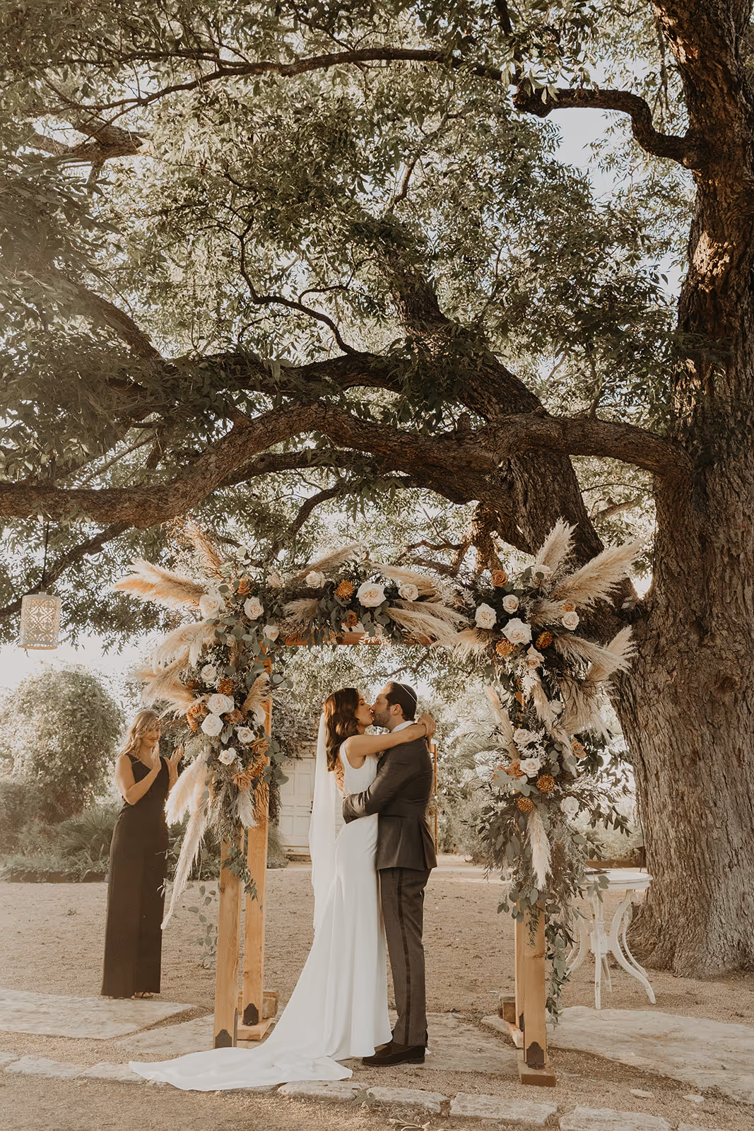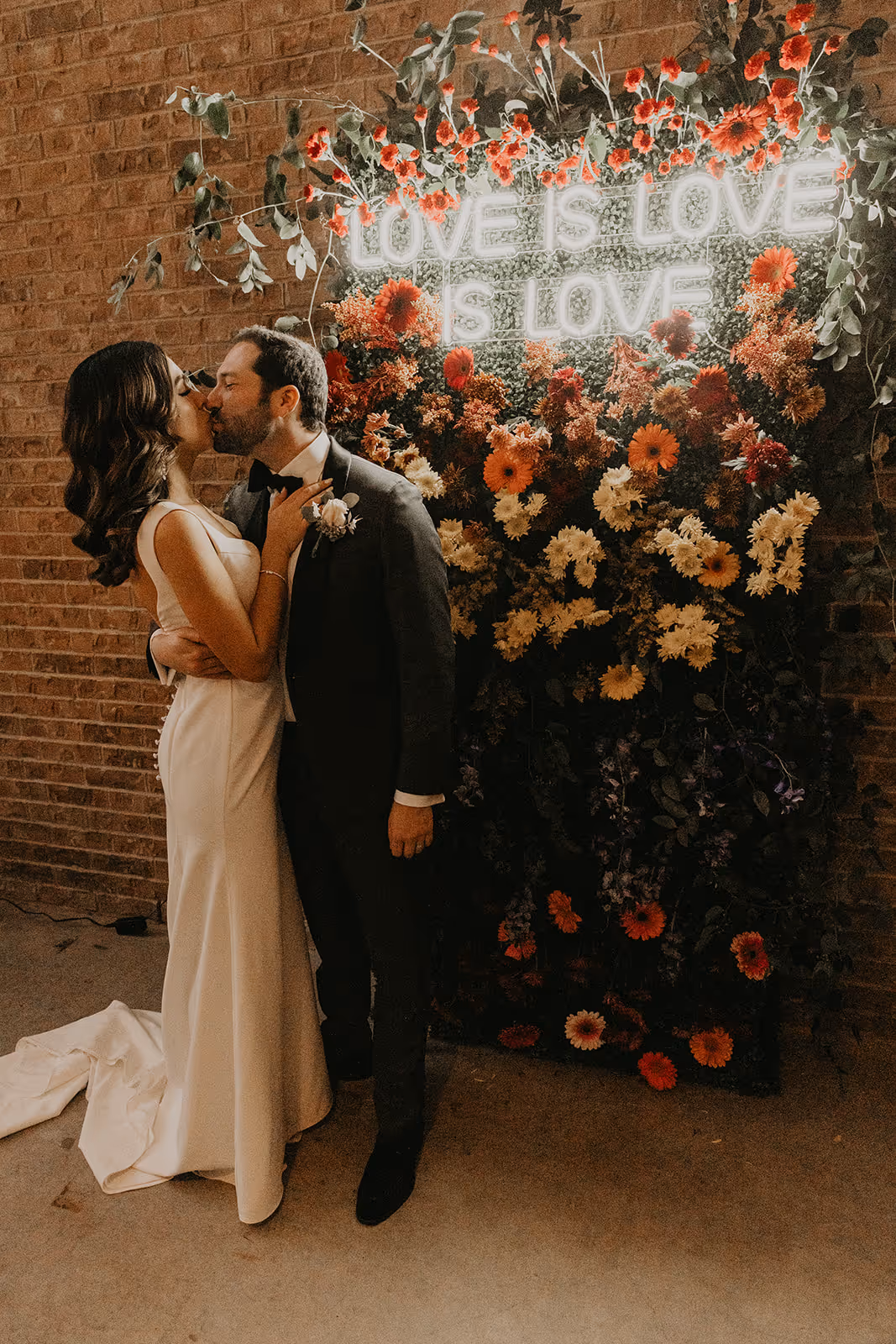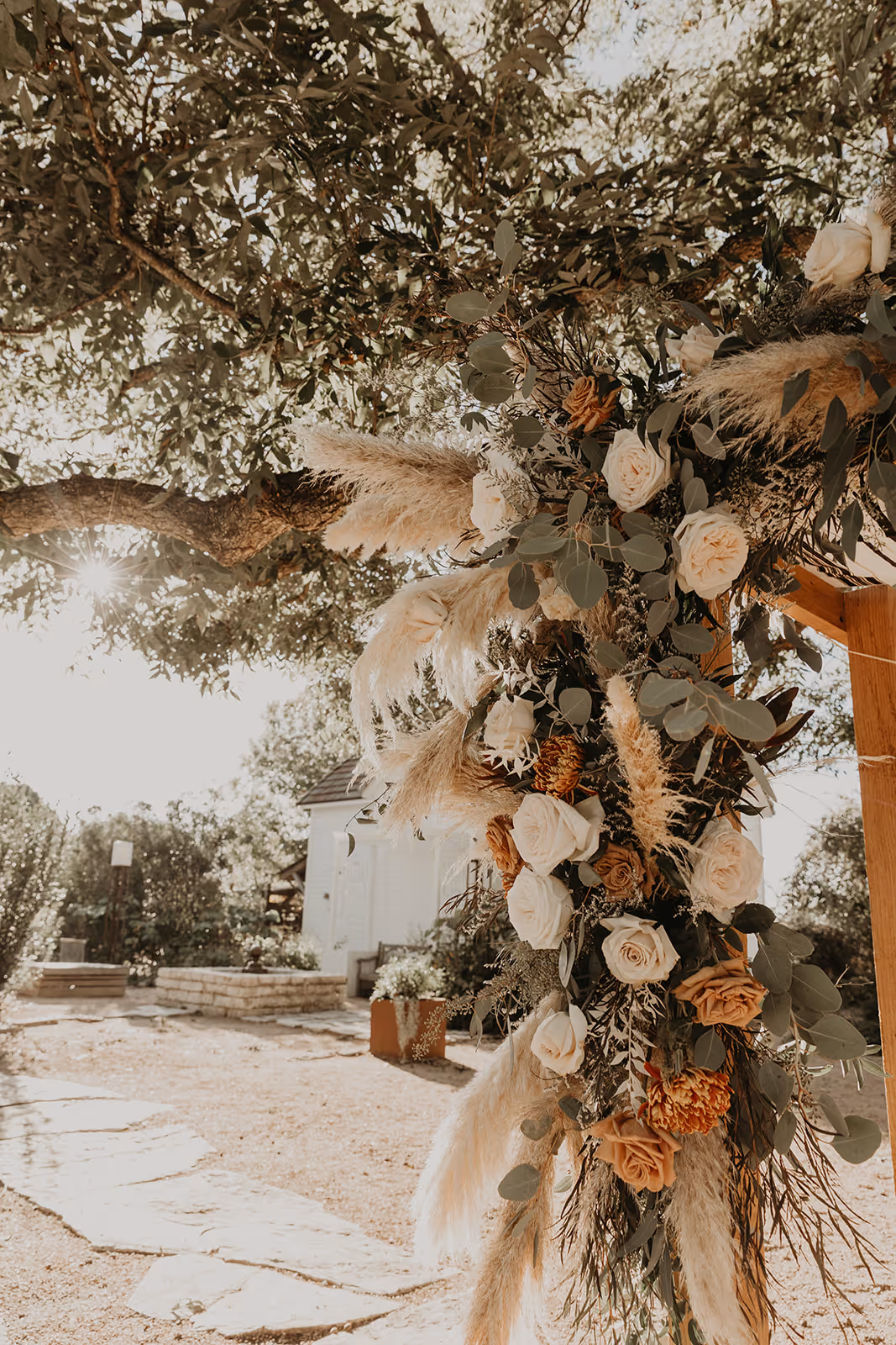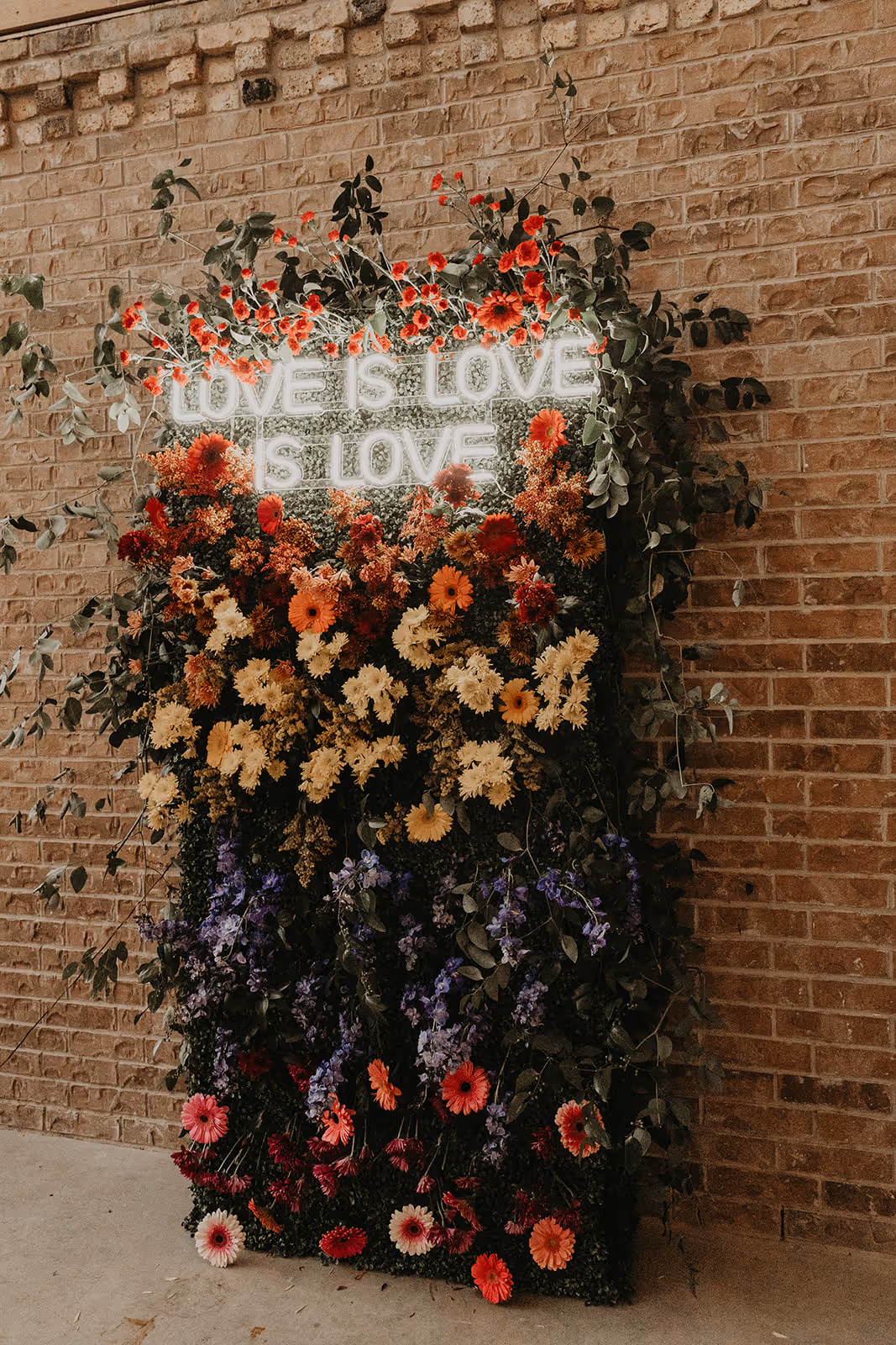 There is nothing more striking than Austin in the fall. Especially when you are out of the Austin downtown bustle and into the beautiful North Austin Barr Mansion Venue. Kalley and Coby got married this past fall at the mansion and we are still swooning over their Jewish ceremony chuppah complete with the most amazing fall tone flowers and greenery on our cedar 7 ft tall chuppah. The pampas grass accents were just the finish it needed to give the ceremony a fun fall flair. We used fall wedding tones with soft caramel undertones and warm whites and ivory's. The ceremony took place in front of the mansion under the sprawling oak tree while teh reception flowed into the barn for an amazing photo backdrop in front of our rental hedge wall step and repeat that was decked in rainbow flowers with our couple's neon sign that glowed "love is love" the most fun flower wall backdrop that guest could enjoy before dinner in the lawn under their strand lights. We used pillar candles, greenery, bud vases, and candles down their harvest table to give it a very warm, romantic, simple vibe.