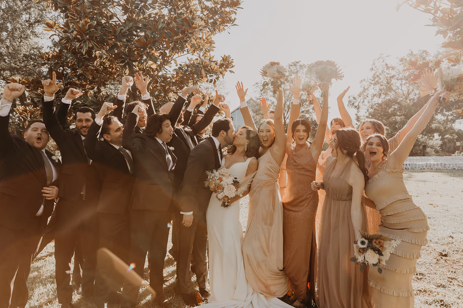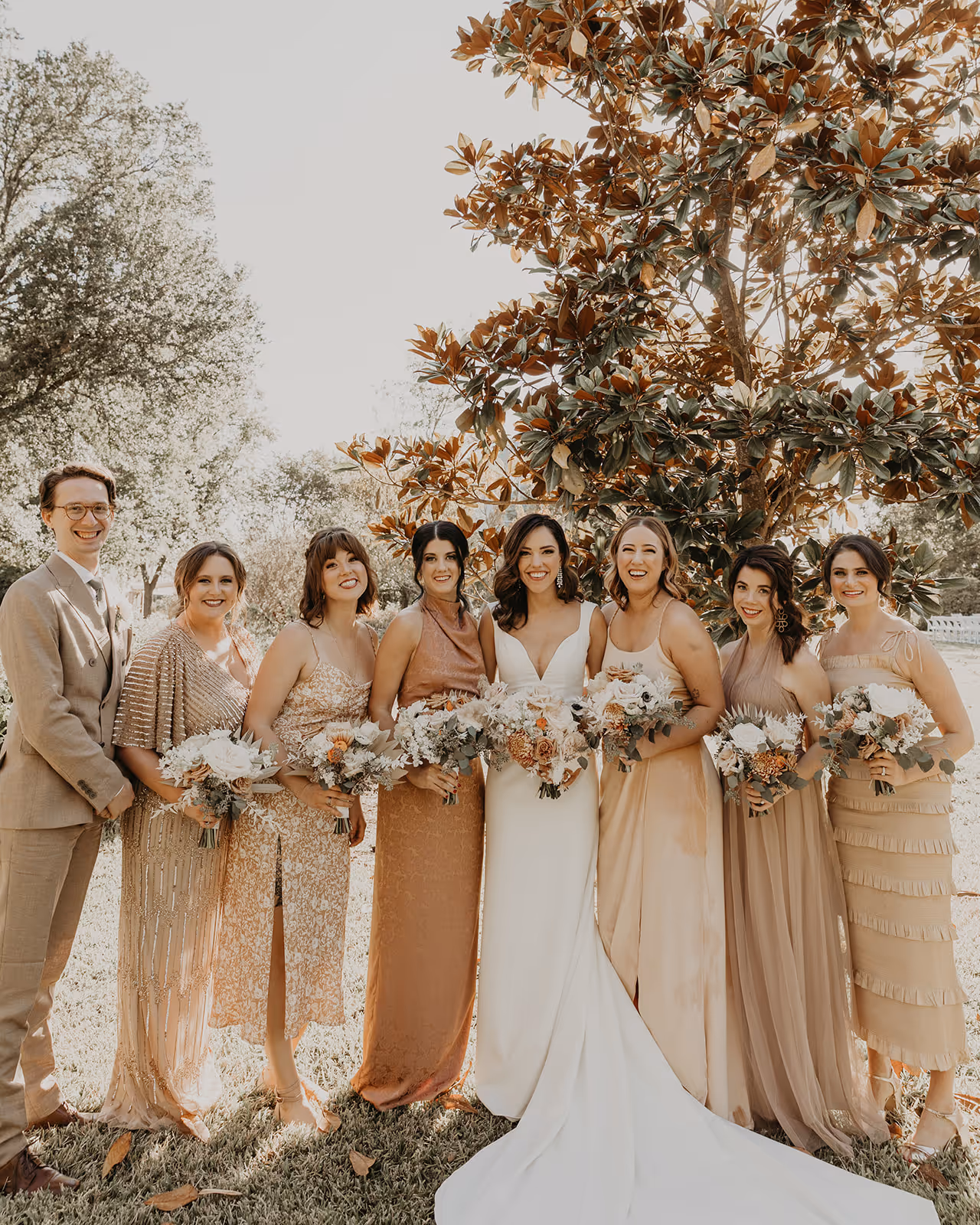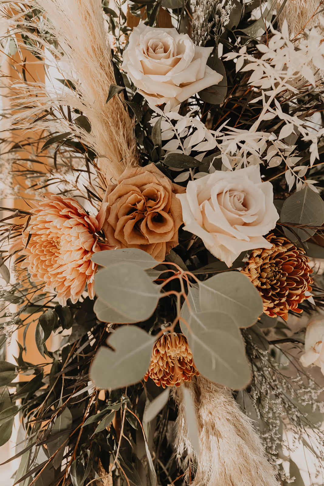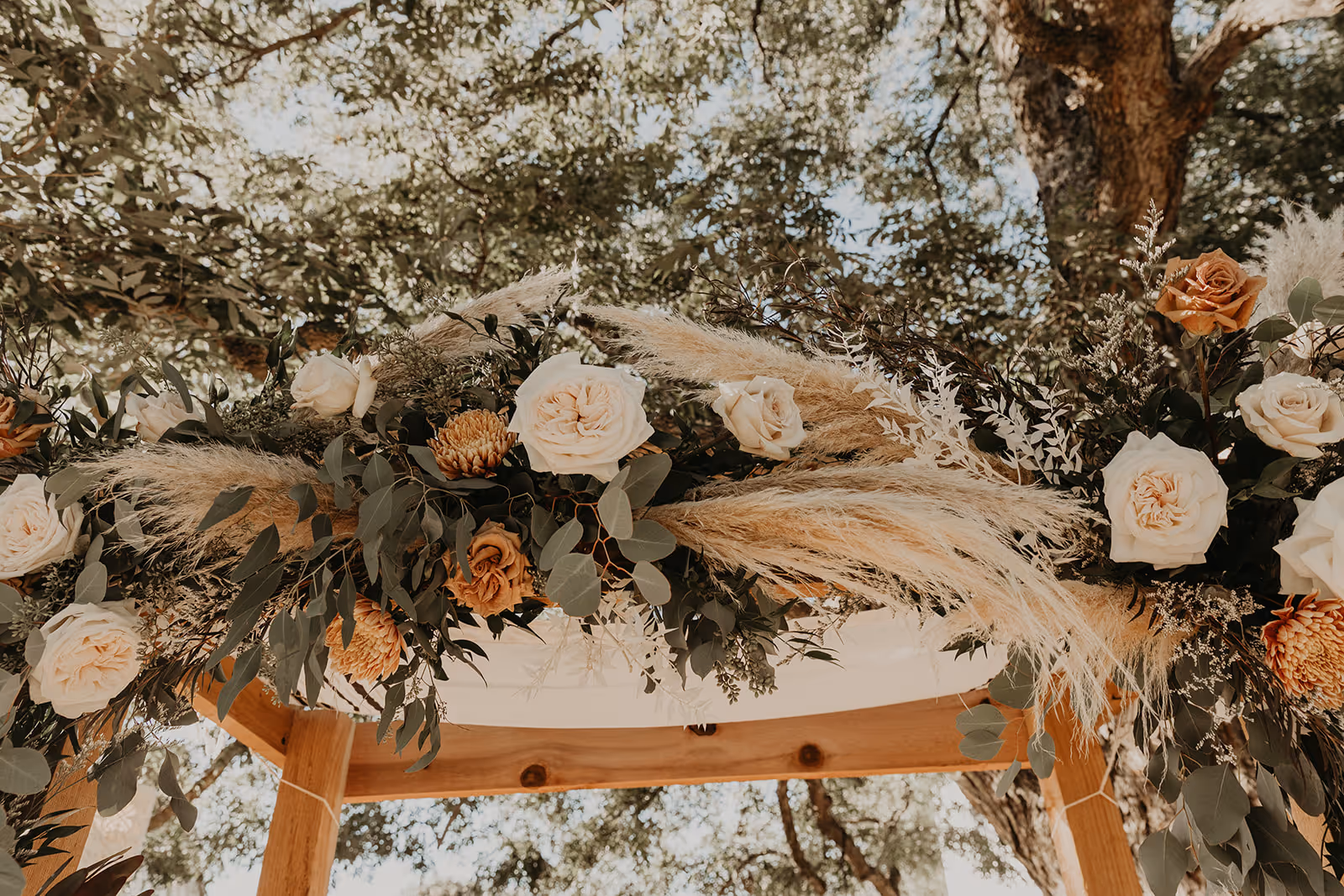 There is nothing more striking than Austin in the fall. Especially when you are out of the Austin downtown bustle and into the beautiful North Austin Barr Mansion Venue. Kalley and Coby got married this past fall at the mansion and we are still swooning over their Jewish ceremony chuppah complete with the most amazing fall tone flowers and greenery on our cedar 7 ft tall chuppah. The pampas grass accents were just the finish it needed to give the ceremony a fun fall flair. We used fall wedding tones with soft caramel undertones and warm whites and ivory's. The ceremony took place in front of the mansion under the sprawling oak tree while teh reception flowed into the barn for an amazing photo backdrop in front of our rental hedge wall step and repeat that was decked in rainbow flowers with our couple's neon sign that glowed "love is love" the most fun flower wall backdrop that guest could enjoy before dinner in the lawn under their strand lights. We used pillar candles, greenery, bud vases, and candles down their harvest table to give it a very warm, romantic, simple vibe.