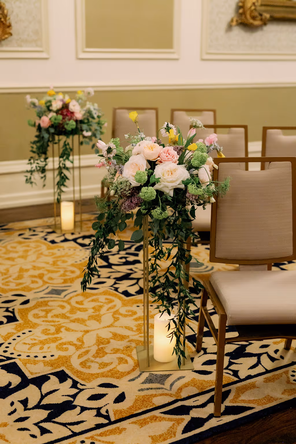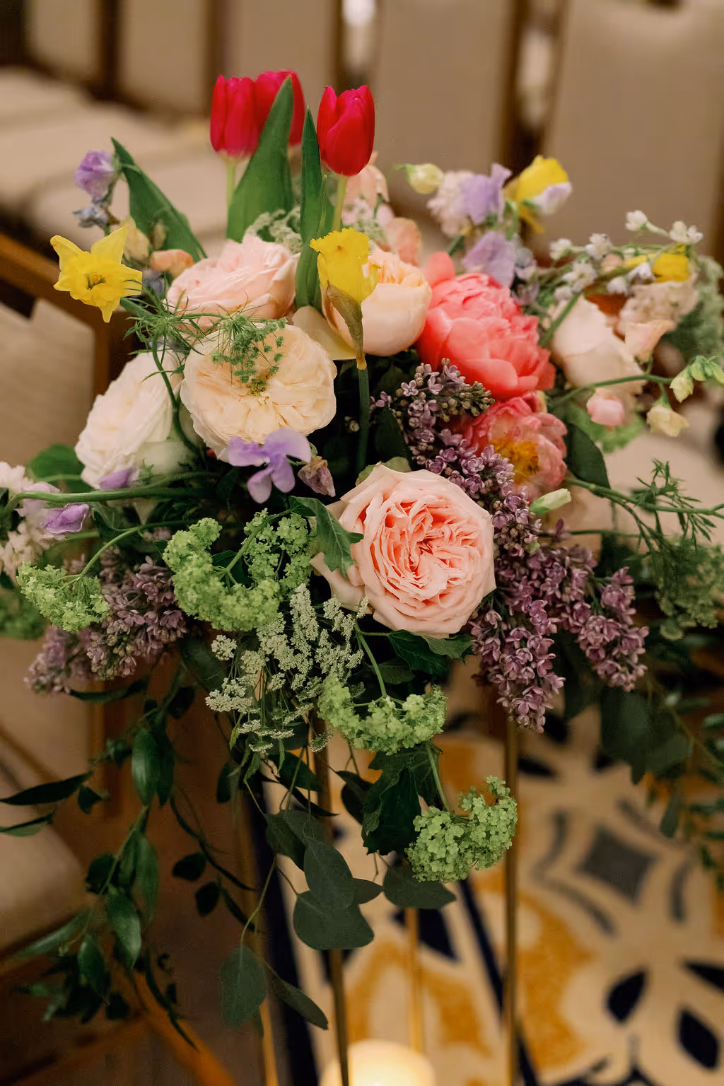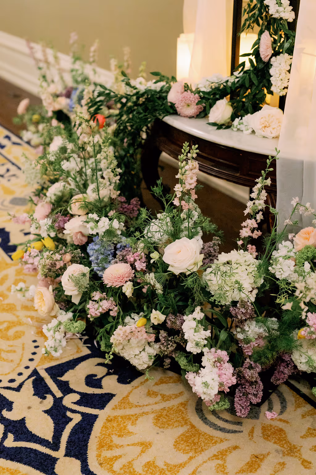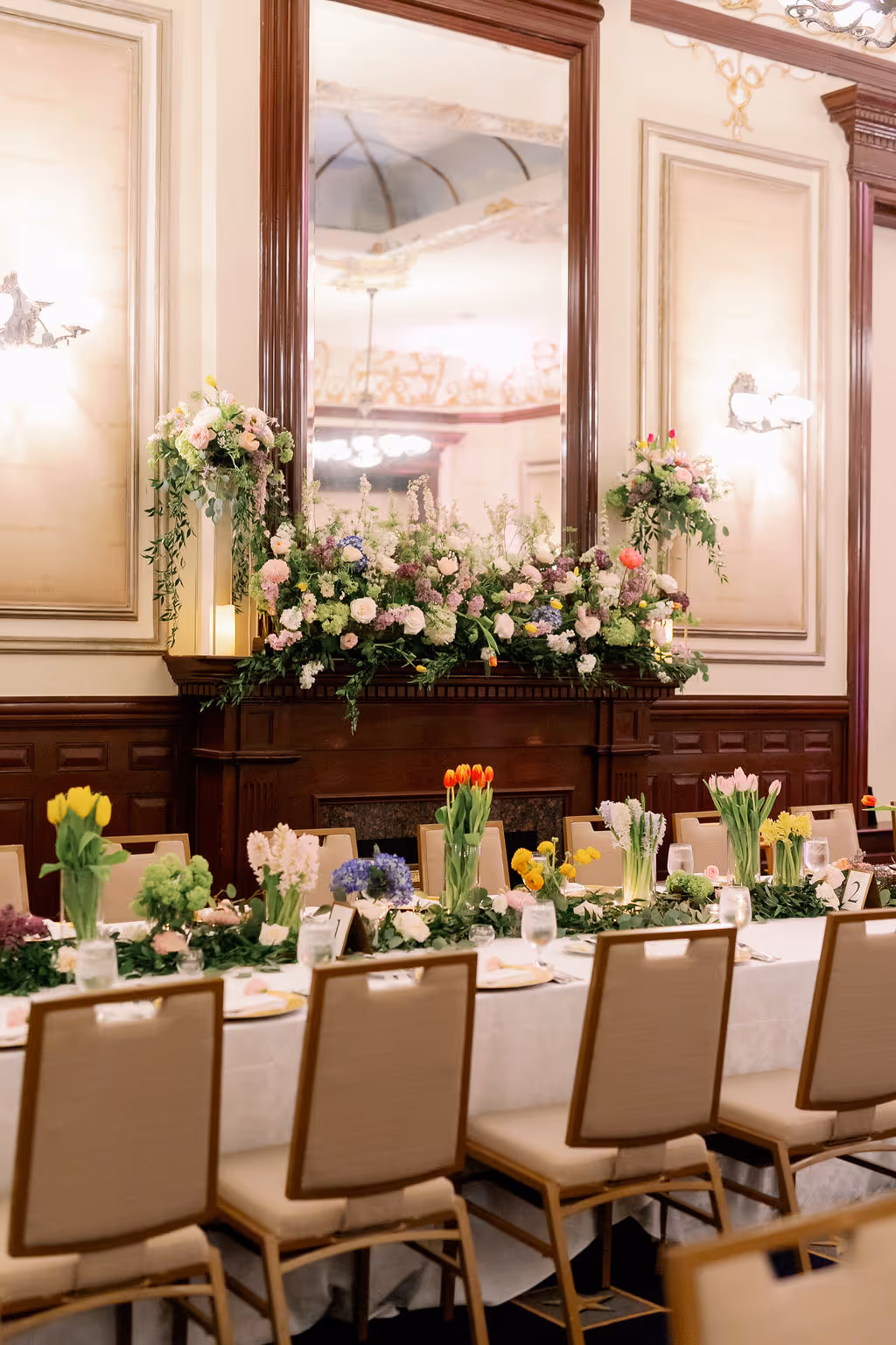 Kim and Bob's Driskill Spring Easter wedding was a flower lover's spring come true!!! With their colorful easter tones and abundance of in season flowers it was as if you were walking into their ceremony in the Maxamilian room/ field of flowers. Their ceremony and reception had all of the amazing smells and stunning looks between the Driskill's delicious food and our luxurious flowers overflowing from the tables! We lined flowers at the very front of the ceremony space in the room and down the aisle were various candle and tall flowers on our rental gold harlow stands. After the ceremony we moved the tall floral to the mantle and the room nooks to really create an elevated ambiance in the Driskill ballroom including room entrance. Every guest received a flower stem tucked into each of their napkins at their place setting to really bring that flower details to life and elevate the guests table setting.