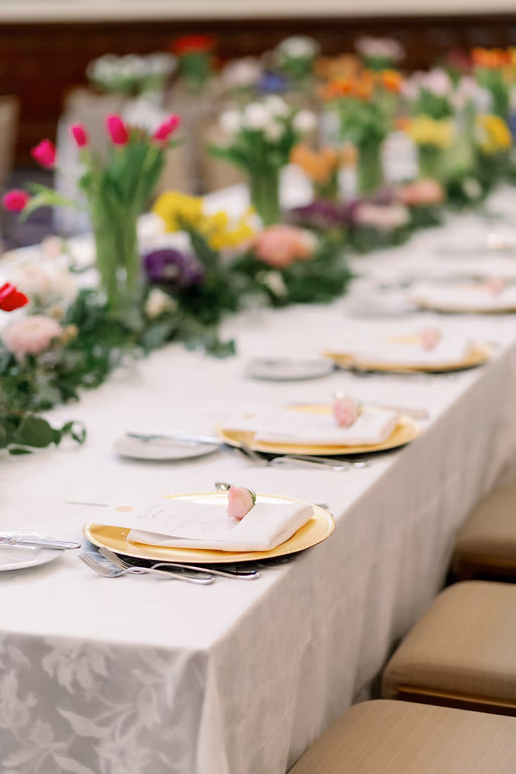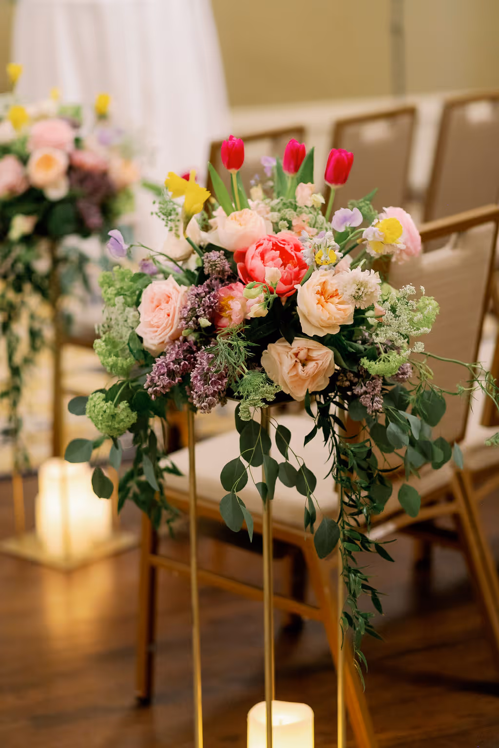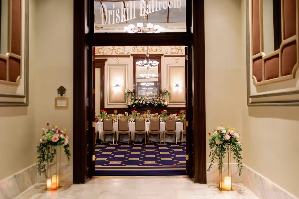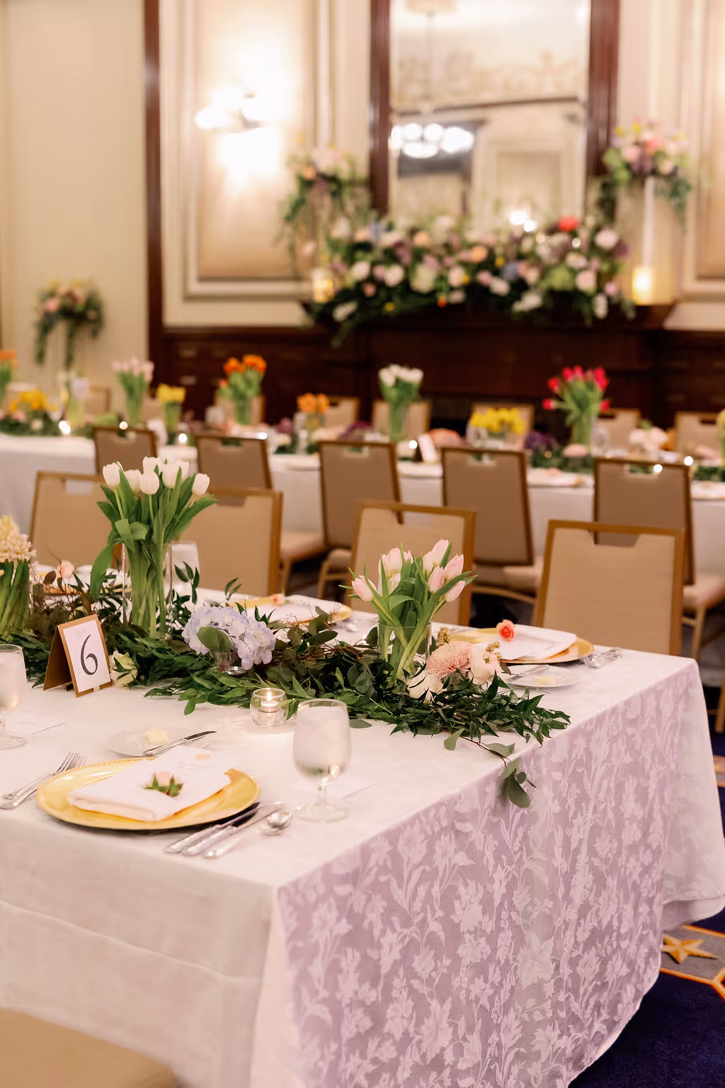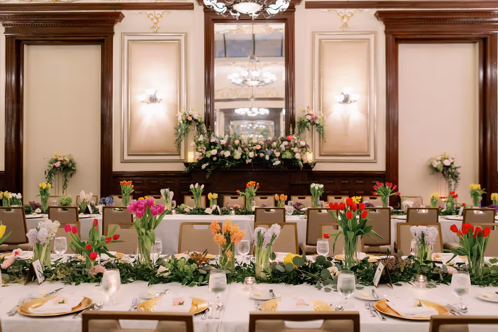 Kim and Bob's Driskill Spring Easter wedding was a flower lover's spring come true!!! With their colorful easter tones and abundance of in season flowers it was as if you were walking into their ceremony in the Maxamilian room/ field of flowers. Their ceremony and reception had all of the amazing smells and stunning looks between the Driskill's delicious food and our luxurious flowers overflowing from the tables! We lined flowers at the very front of the ceremony space in the room and down the aisle were various candle and tall flowers on our rental gold harlow stands. After the ceremony we moved the tall floral to the mantle and the room nooks to really create an elevated ambiance in the Driskill ballroom including room entrance. Every guest received a flower stem tucked into each of their napkins at their place setting to really bring that flower details to life and elevate the guests table setting.