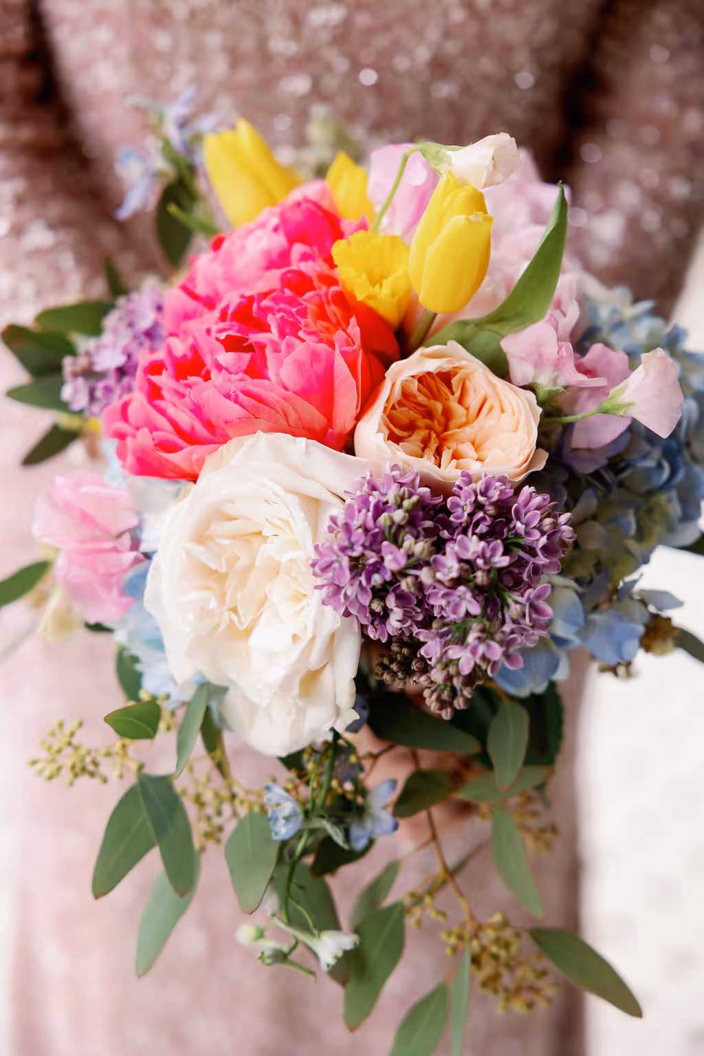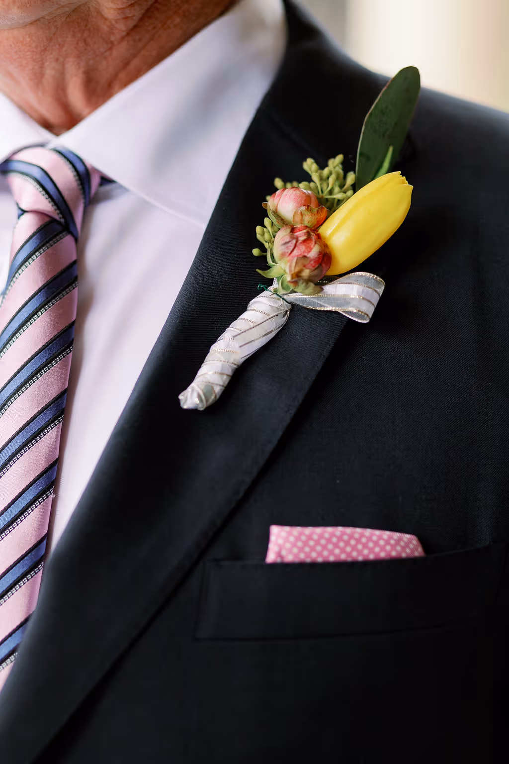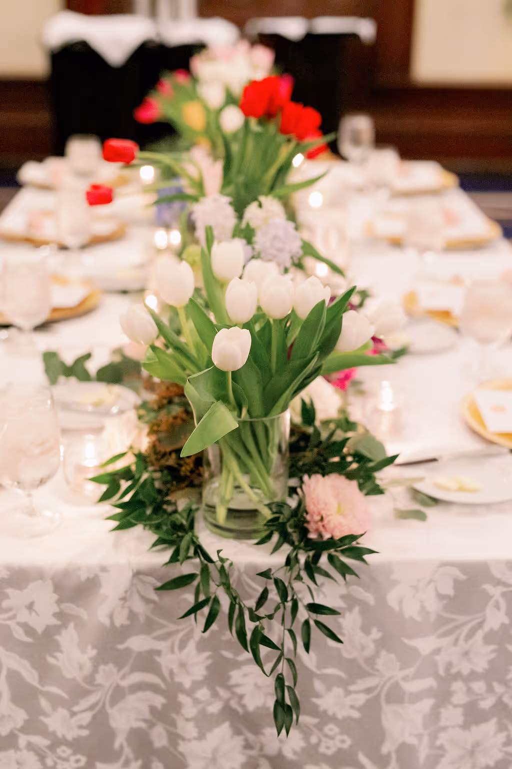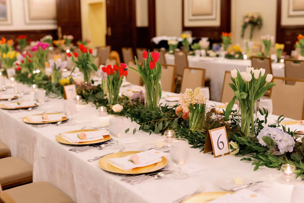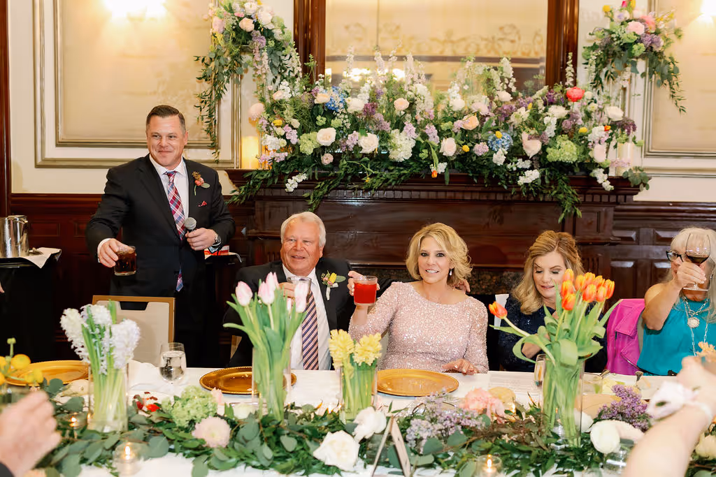 Kim and Bob's Driskill Spring Easter wedding was a flower lover's spring come true!!! With their colorful easter tones and abundance of in season flowers it was as if you were walking into their ceremony in the Maxamilian room/ field of flowers. Their ceremony and reception had all of the amazing smells and stunning looks between the Driskill's delicious food and our luxurious flowers overflowing from the tables! We lined flowers at the very front of the ceremony space in the room and down the aisle were various candle and tall flowers on our rental gold harlow stands. After the ceremony we moved the tall floral to the mantle and the room nooks to really create an elevated ambiance in the Driskill ballroom including room entrance. Every guest received a flower stem tucked into each of their napkins at their place setting to really bring that flower details to life and elevate the guests table setting.