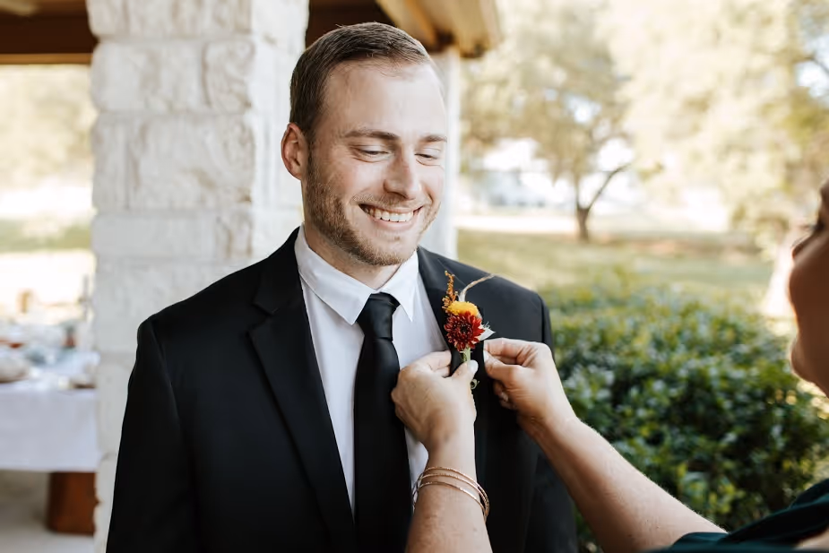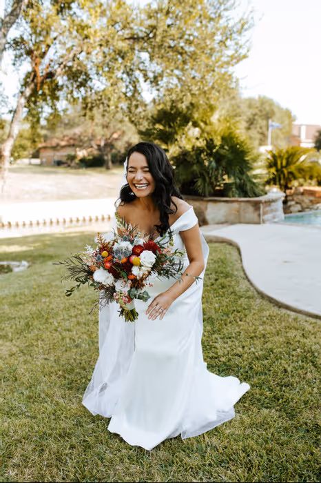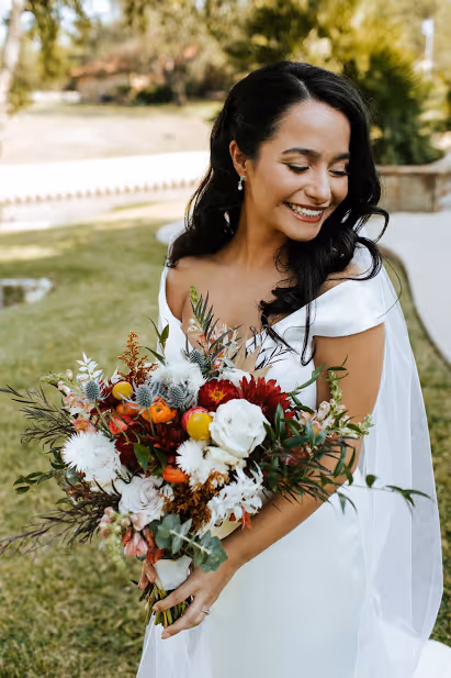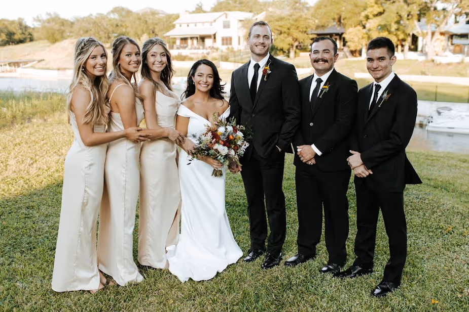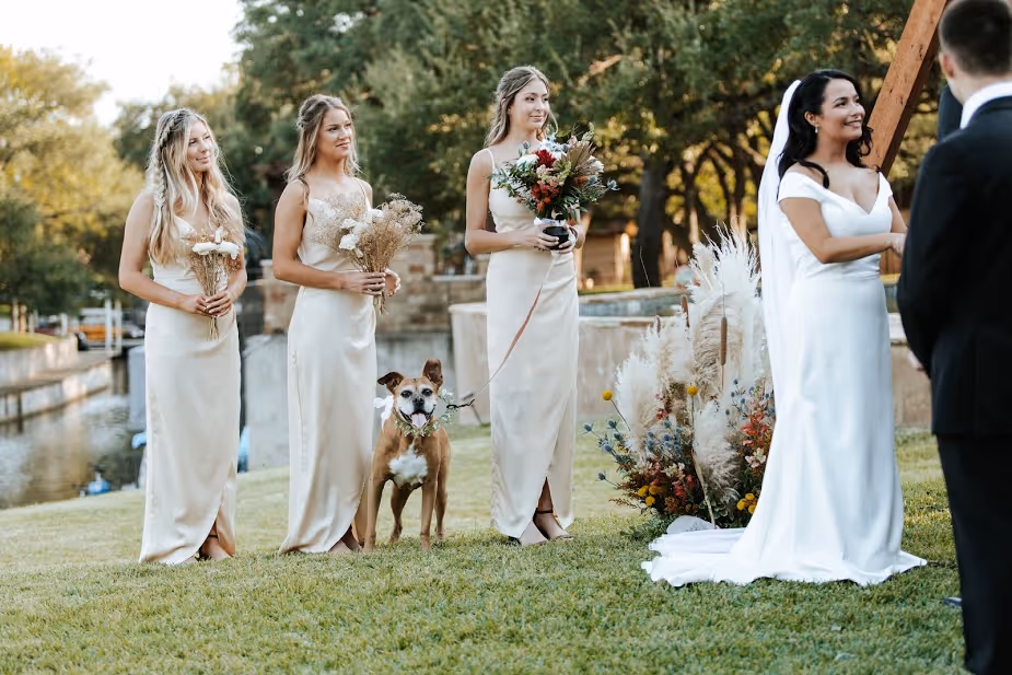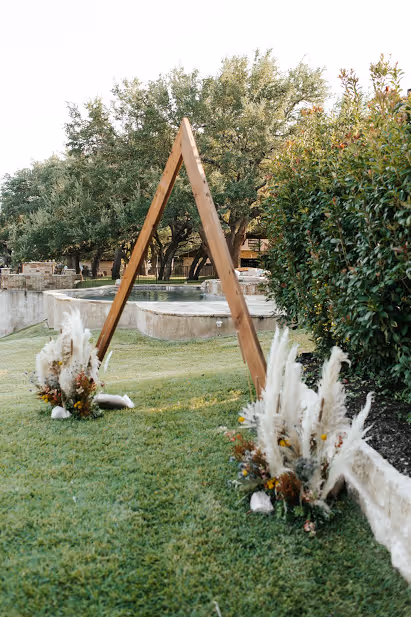 Morgan and Alec had a beautiful intimate waterfront wedding. Colorful moody fall natural tones with pampas and cat tail accents. Their ceremony arch was a custom made triangle arch with the pampas and floral growing from each side bottom up to cover any mechanics of the arch. Blues, yellow, orange, red, burgundy, the colors all paired so well together. Our favorite part detail were the bridesmaids dahlia cuff wrist corsages. Afterwards they became bracelet keepsake gifts for the bridesmaids. This was such a unique bridal party flower touch.
