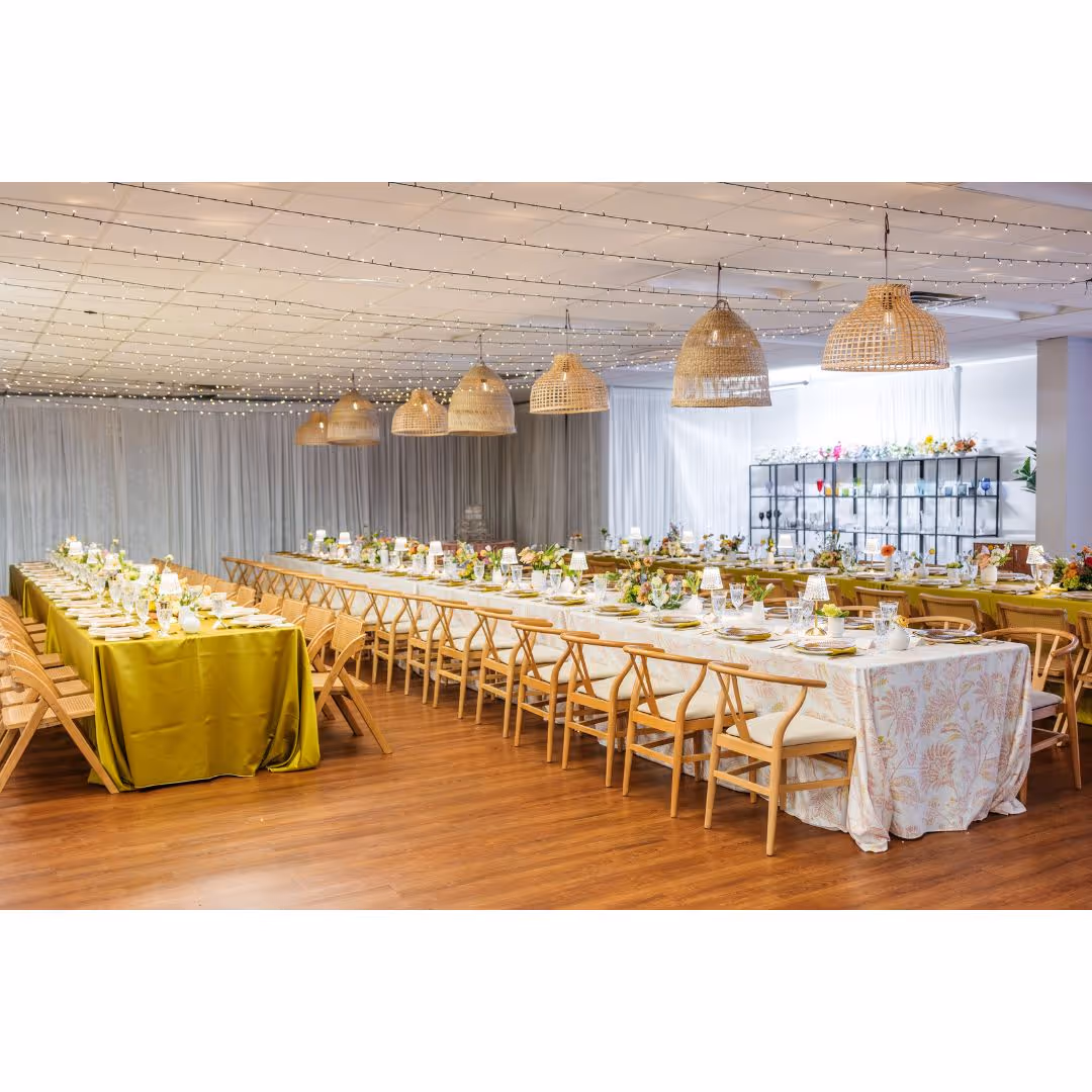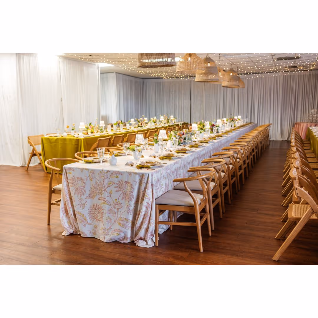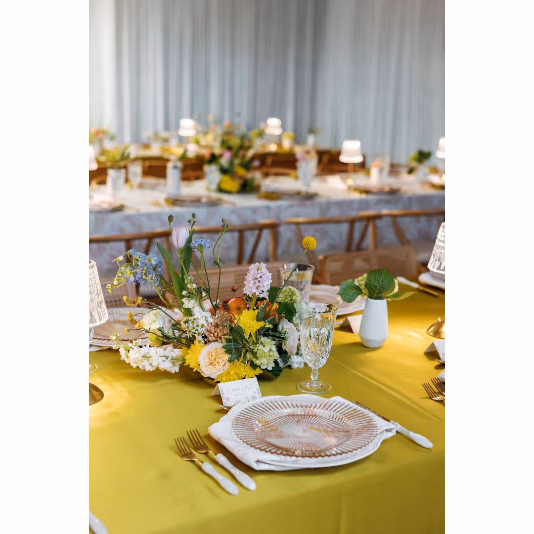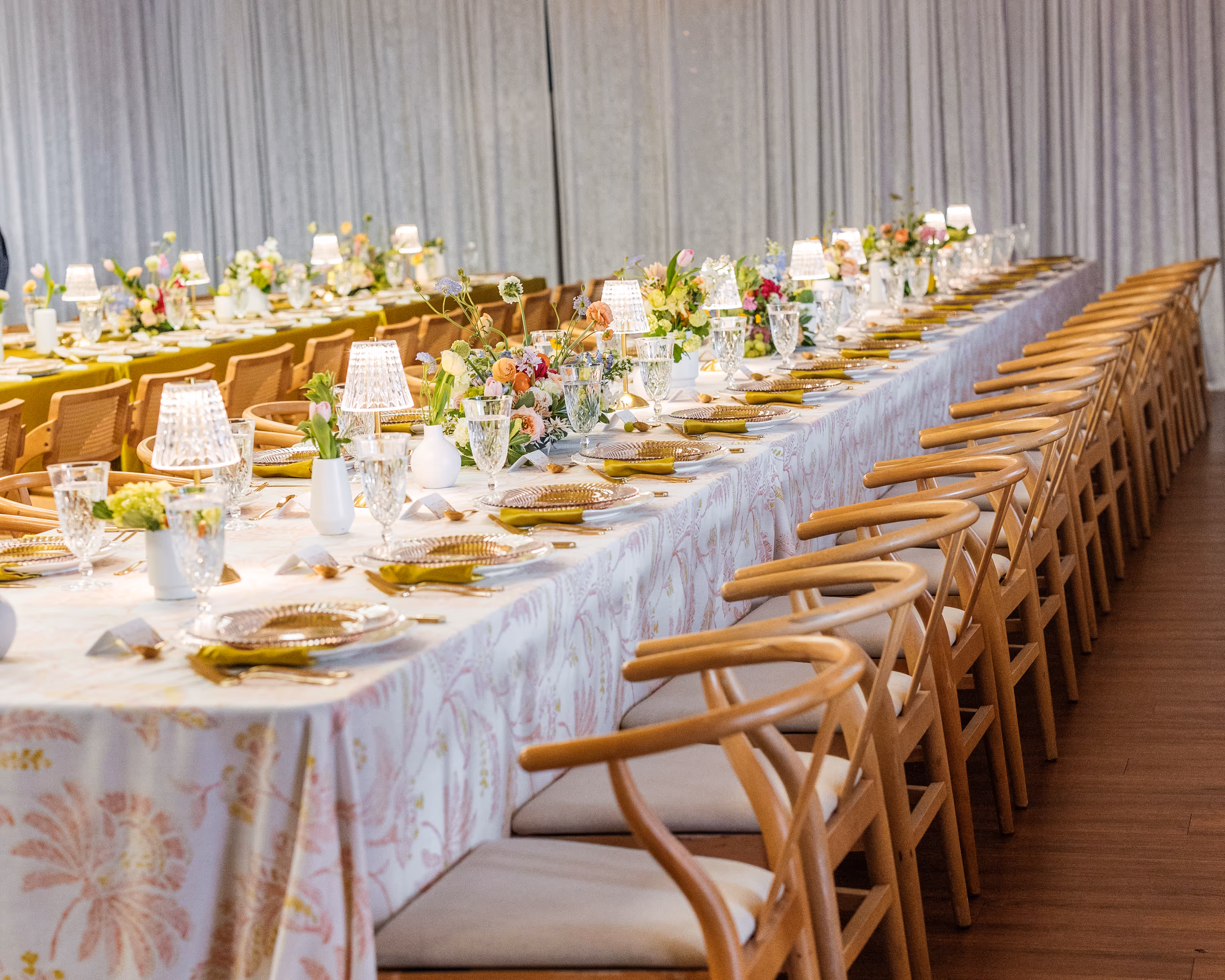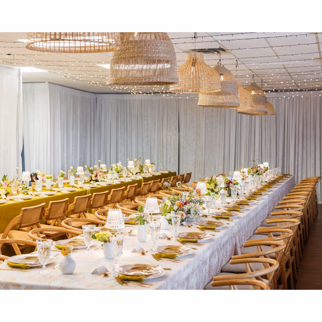 The tablescapes were a true highlight, featuring long, flowing table arrangements accented with delicate bud vases scattered down the length. This design created an intimate yet grand feel, perfectly showcasing how our new rentals can elevate any event.