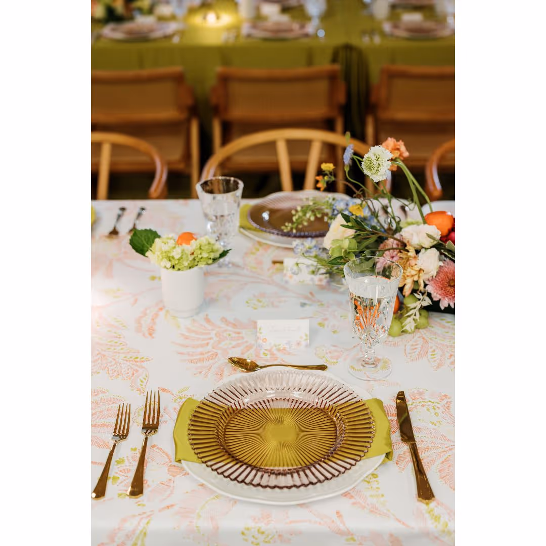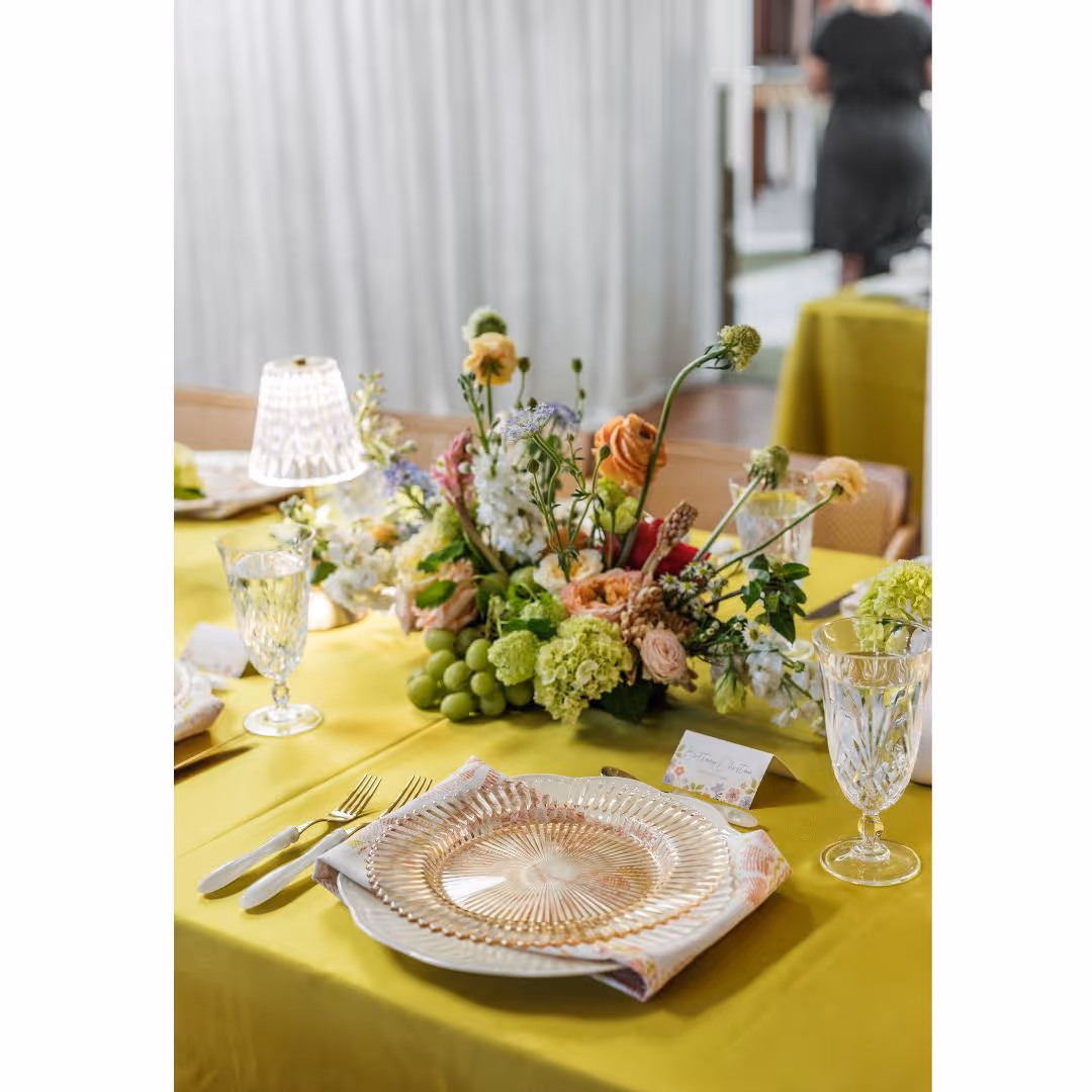 Our goal was to inspire, and the decor certainly did just that! We embraced the essence of spring with a vibrant palette of fresh flowers beautifully mixed with seasonal fruits like peaches, grapes, and pears. These natural elements were thoughtfully chosen to complement our stunning linens, creating a harmonious and inviting atmosphere.