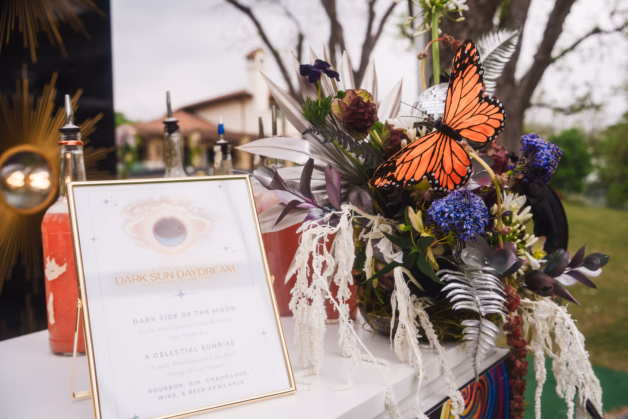 Immerse yourself in the enchanting world of a private eclipse festival hosted at a luxurious home estate. Picture a landscape adorned with towering, vibrant, life-sized flowers, reminiscent of a surreal dreamscape. Psychedelic disco ball mushrooms twinkle amidst the foliage, accompanied by the graceful fluttering of butterflies, creating an otherworldly ambiance.