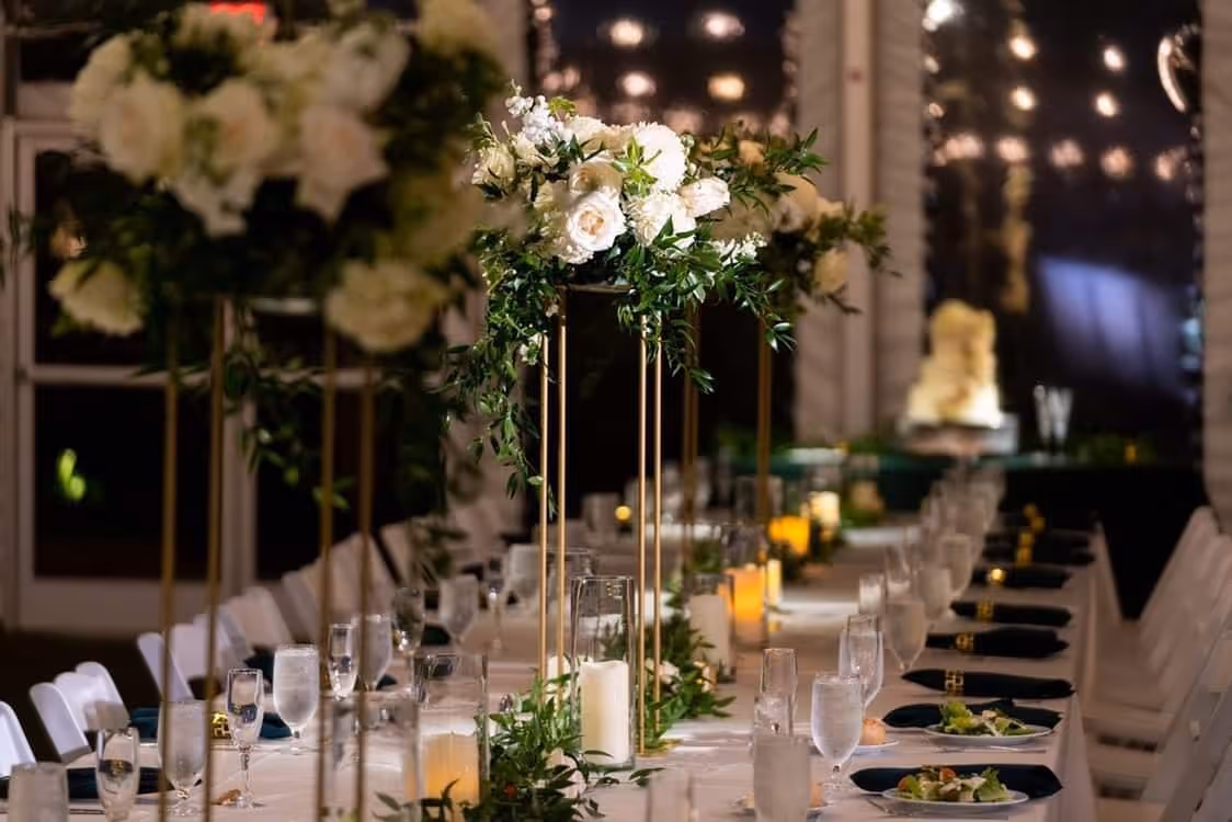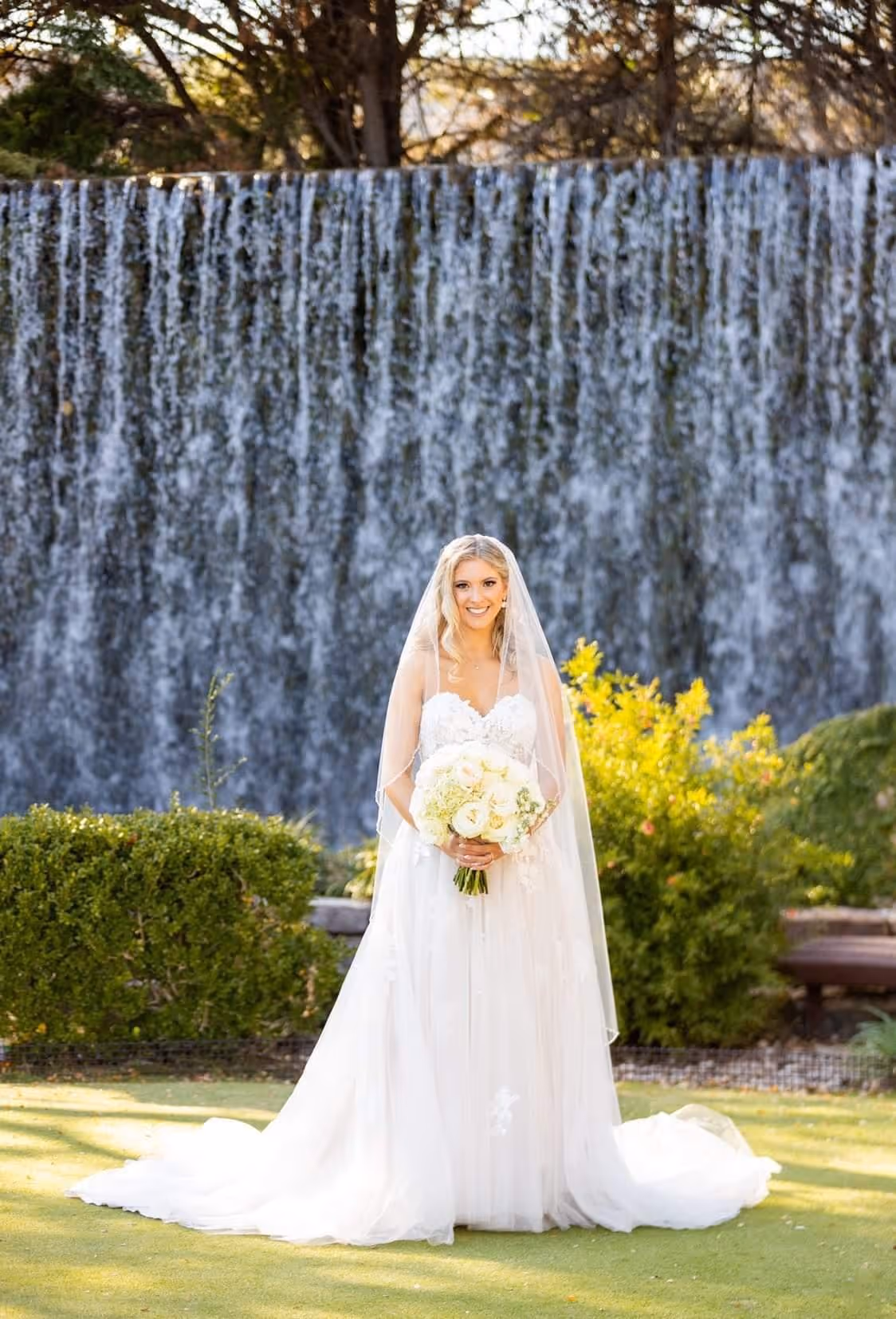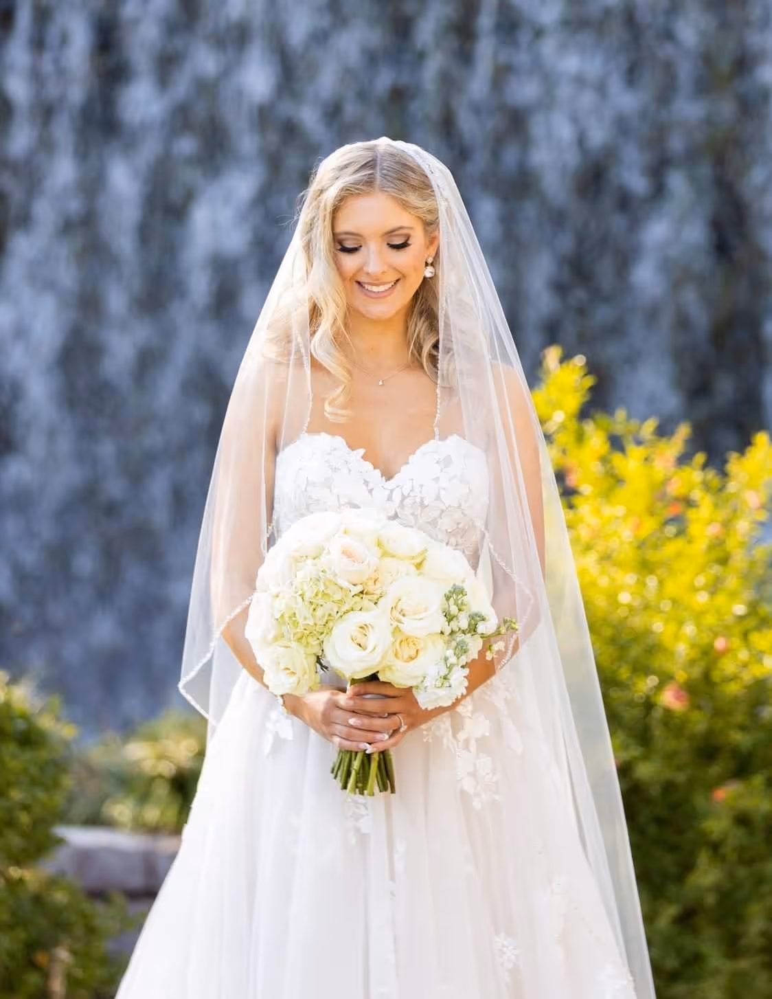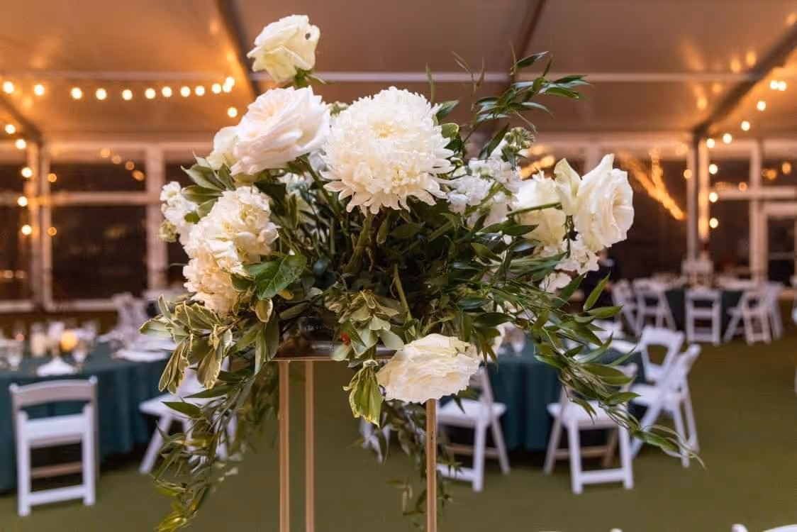 Thea and Michael's Horseshoe Bay Resort wedding day was one of our favorites!! They selected such a classic color palette of ivory, white, and greenery to bring their elegant wedding day to life. Their timeless flowers and decor had our florists swooning over every single floral design! From their lakeside terrace ceremony under the venue's pergola to their reception under strands of golden lights it was simply perfect. For the bridal party bouquets we used traditional style designs with little to no greenery full of premium flowers and lush garden roses. We used our gold harlow stands rentals for each side of the ceremony aisles that were brought in after the ceremony and transformed from aisle floral to table centerpieces. The reception head table was absolutely stunning! With a mixture of our rental clear glass hurricane vase sets and LED pillar candles among the greenery table runner garland and the repurposed aisle flower to give the table height. For their guests tables we used our hurricane vase with candle rentals with floral and greenery in between. Then for the other half, we repurposed the bouquets as centerpieces and tied all of the tables together with greenery and tea light. As a florist, I highly recommend floral like their wedding day since it is so neutral, versatile, elegant, and timeless. A wedding that will forever be beautiful and you will not look back on 20 years from now and ask yourself, "why?". Sheer perfection:)