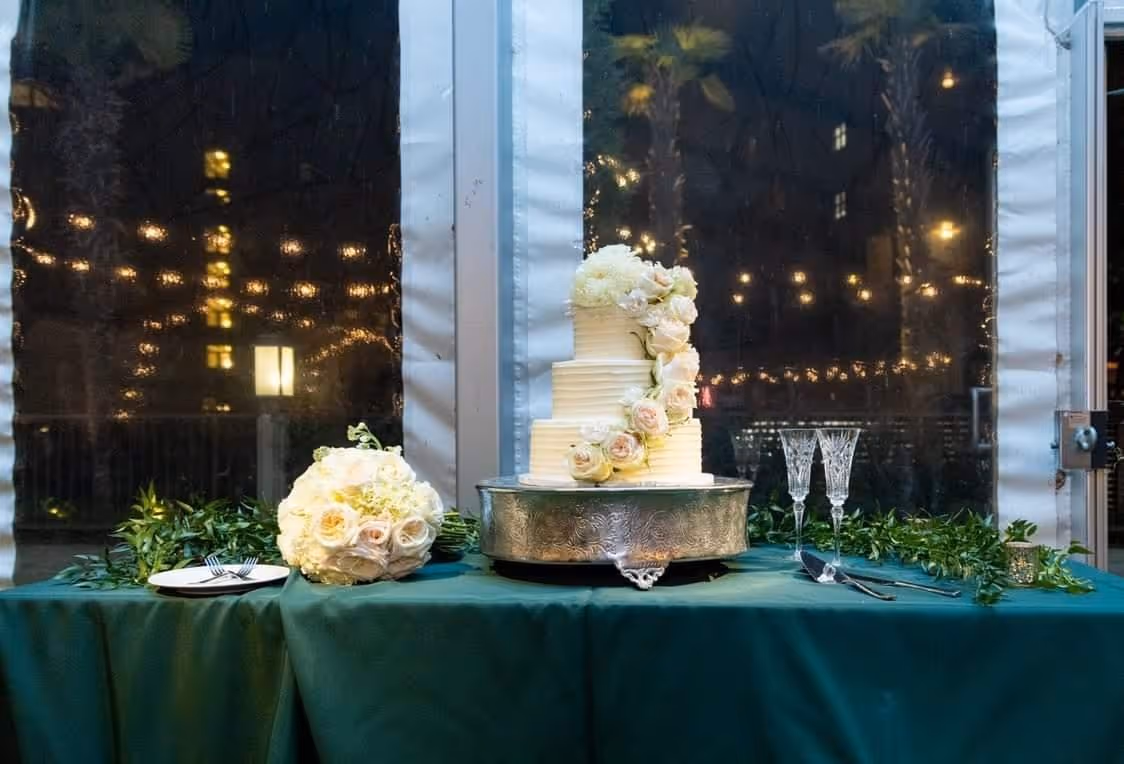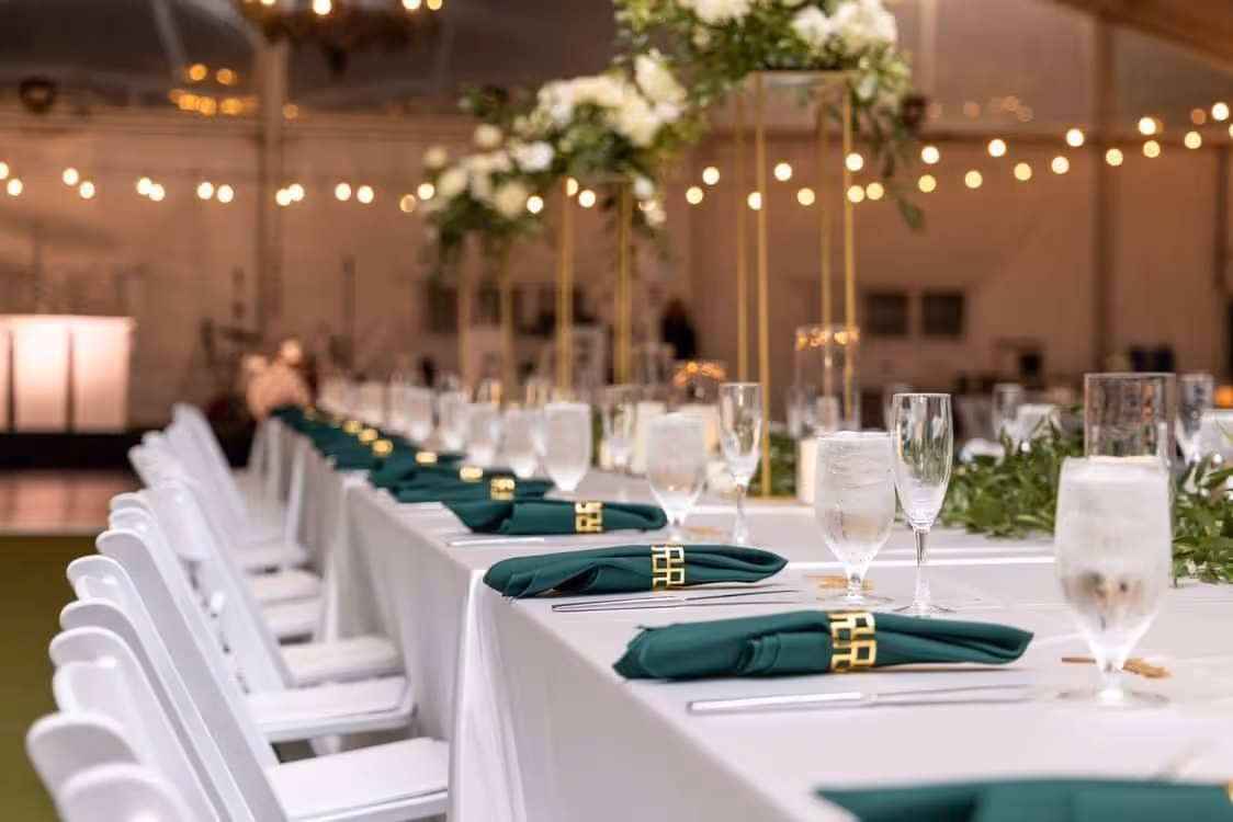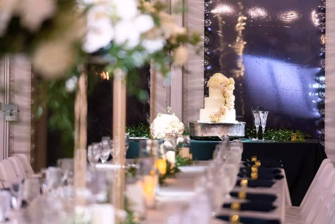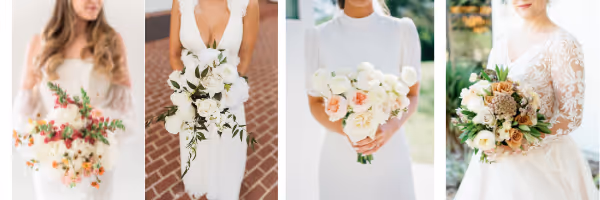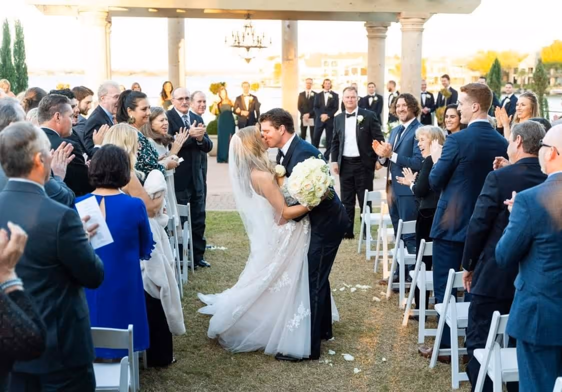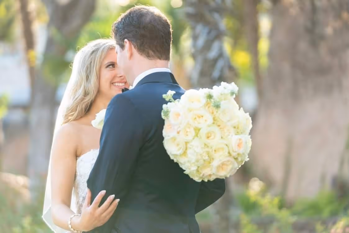 Thea and Michael's Horseshoe Bay Resort wedding day was one of our favorites!! They selected such a classic color palette of ivory, white, and greenery to bring their elegant wedding day to life. Their timeless flowers and decor had our florists swooning over every single floral design! From their lakeside terrace ceremony under the venue's pergola to their reception under strands of golden lights it was simply perfect. For the bridal party bouquets we used traditional style designs with little to no greenery full of premium flowers and lush garden roses. We used our gold harlow stands rentals for each side of the ceremony aisles that were brought in after the ceremony and transformed from aisle floral to table centerpieces. The reception head table was absolutely stunning! With a mixture of our rental clear glass hurricane vase sets and LED pillar candles among the greenery table runner garland and the repurposed aisle flower to give the table height. For their guests tables we used our hurricane vase with candle rentals with floral and greenery in between. Then for the other half, we repurposed the bouquets as centerpieces and tied all of the tables together with greenery and tea light. As a florist, I highly recommend floral like their wedding day since it is so neutral, versatile, elegant, and timeless. A wedding that will forever be beautiful and you will not look back on 20 years from now and ask yourself, "why?". Sheer perfection:)