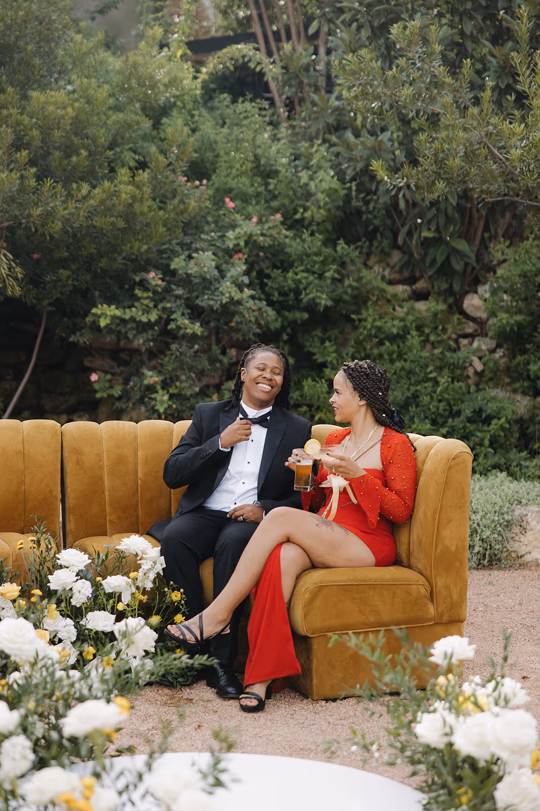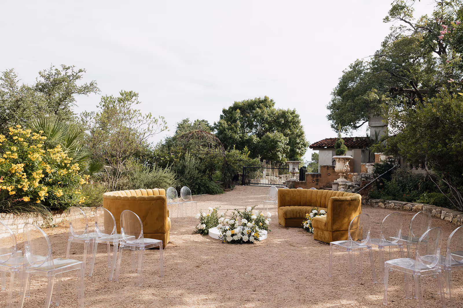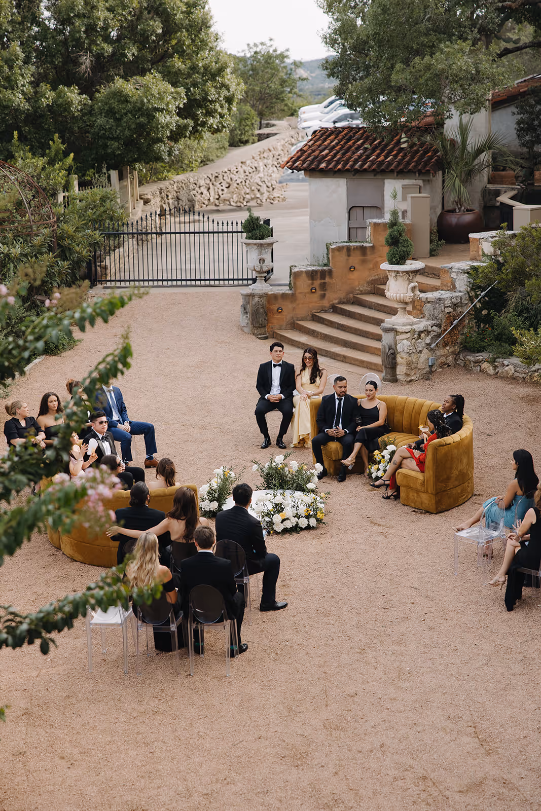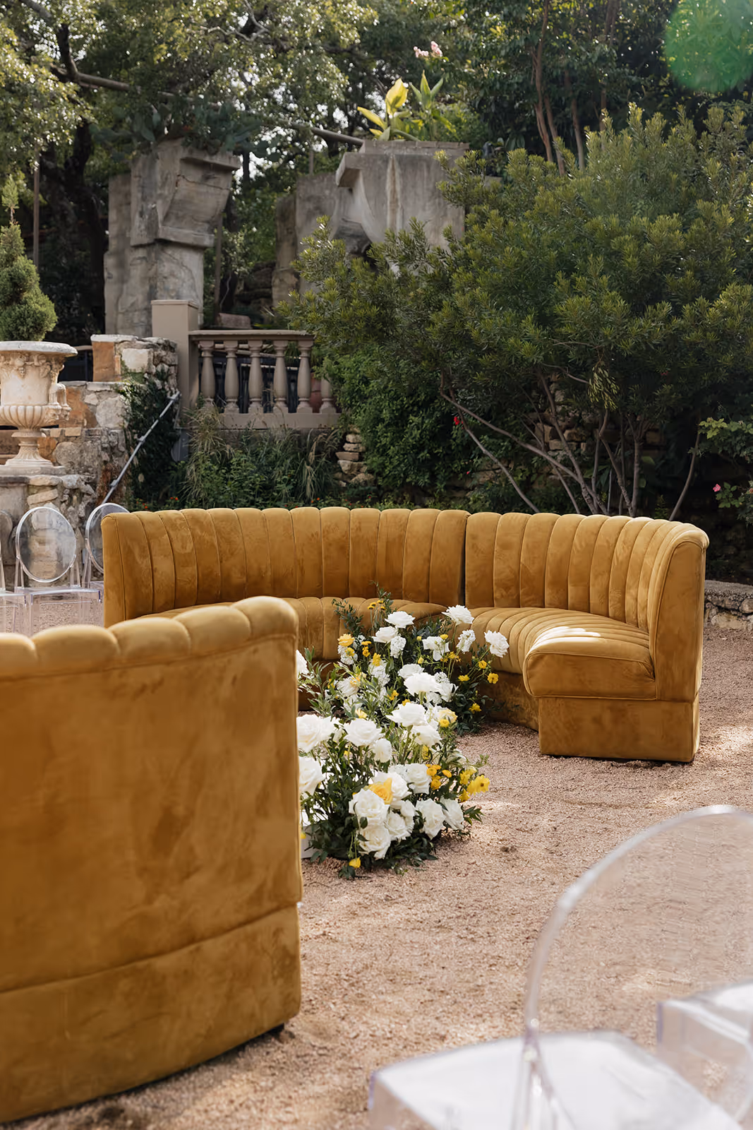 The ceremony flowers were a breathtaking display, with the wedding florist creating a lush, fresh floral arrangement that adorned a circular white stage. This unique stage became the focal point of the ceremony, where the bride and groom exchanged vows. The decor was thoughtfully designed, featuring circular, lush, round ottoman couches in a striking mustard yellow to match the couple's color palette. The Spanish Tuscan villa style provided a romantic and timeless backdrop for this new wedding trend.