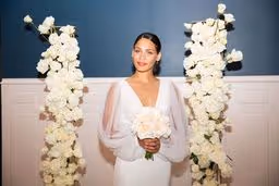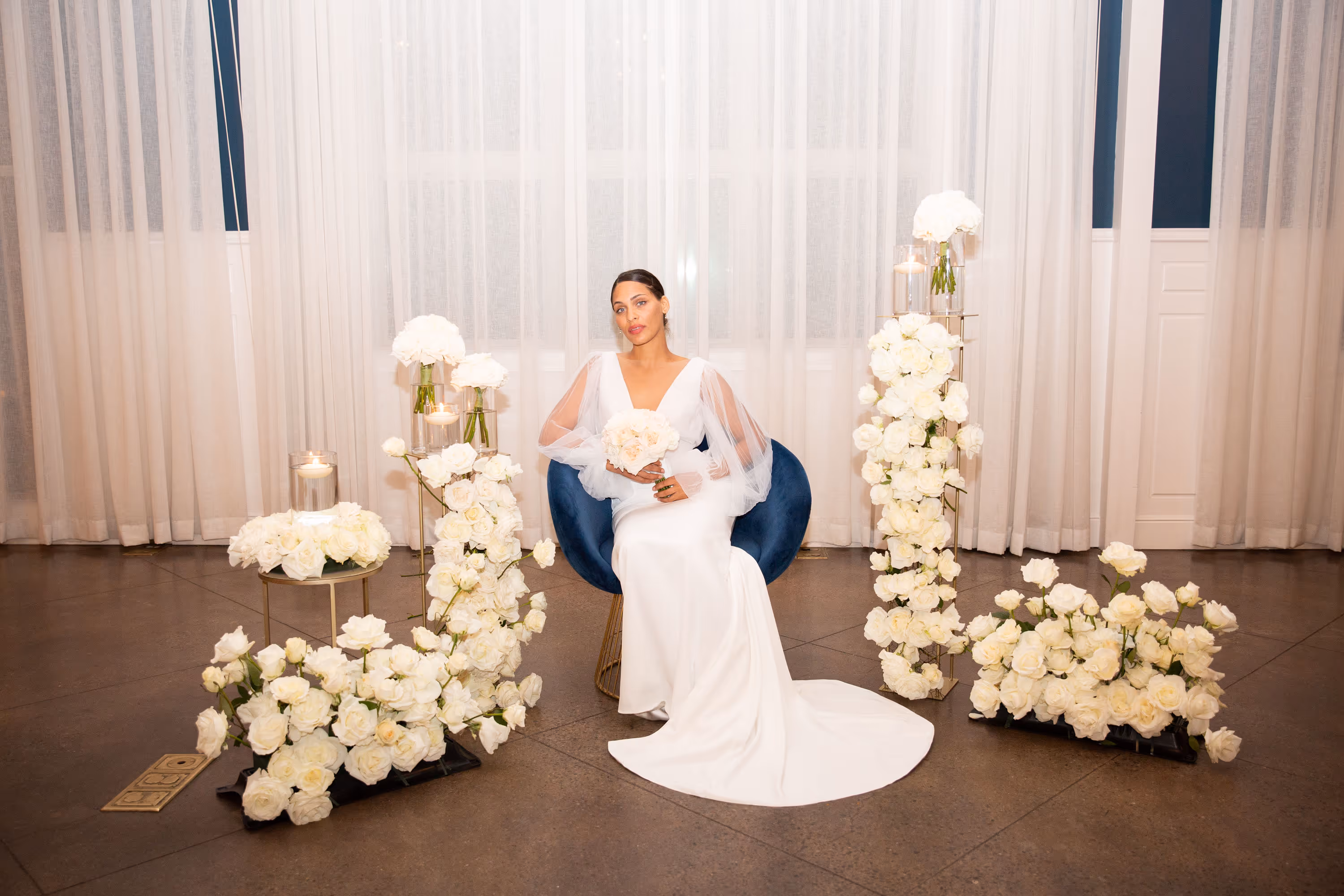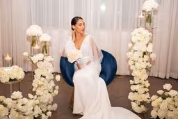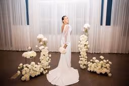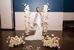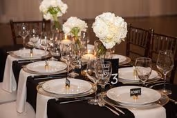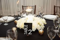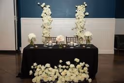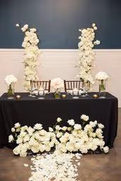 A beautiful full white rose mixture with no greenery to create a luxurious modern wedding design. We used flower columns that were great at creating a beautiful ceremony set up then were be able to be repurposed at the reception for the cake table and lounge are to give it that additional awe-inspiring touch. The wedding colors were white and black and the wedding was like something from a Vogue catalog feature! Paris Hilton inspired this black and white wedding set up and we could not be happier for her and with this!! The ceremony floral were able to be reused at the reception to frame the sweetheart table framing the table and the couple. The ground floral were moved to the front of the table and lined the skirt and the ceremony floral stayed where they were. The cake stand was a lush floral install with candles to partner and match the tables. There is nothing more romantic than company in warm candlelight. Hotel Ella provided the milk white dining ware, sterling silver ware, and clear glass goblets. The black linens with white plates and floral was such a modern elegant unique spin and contrasted perfect. Ying to yang, black to white, everything perfectly balanced and simpatico.