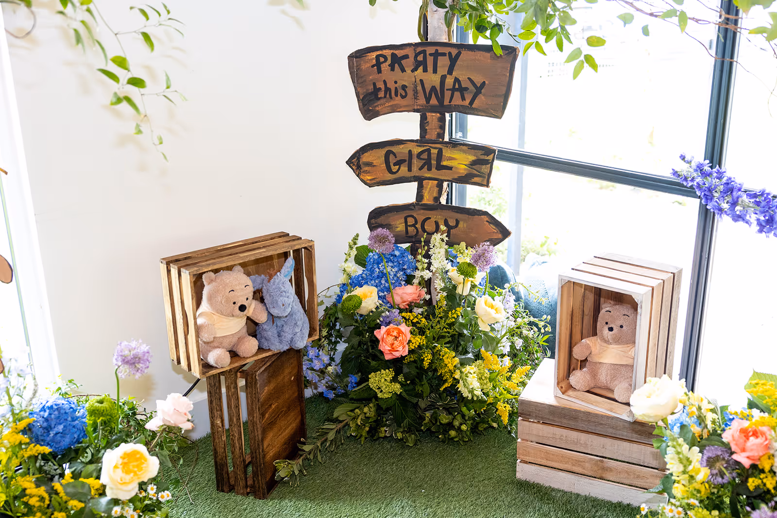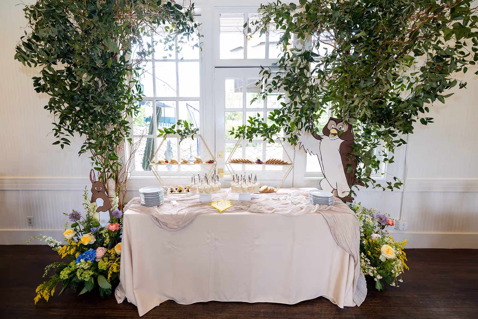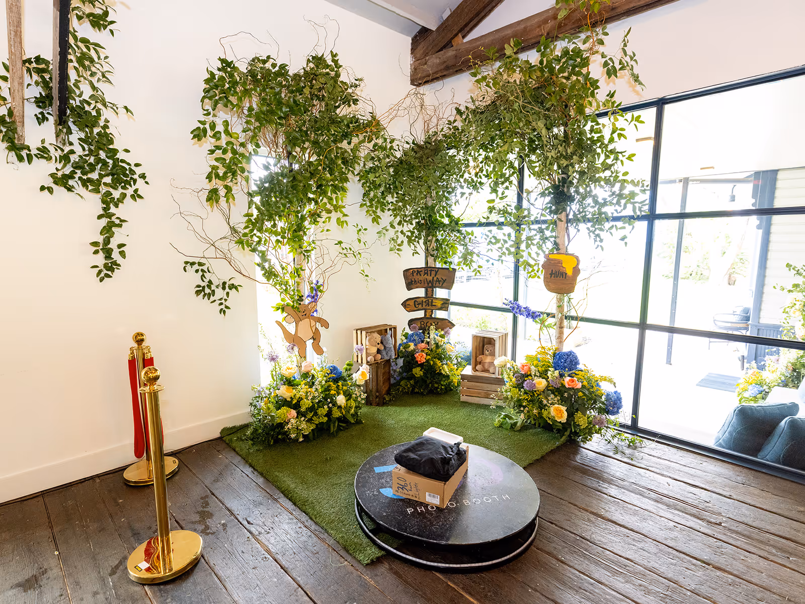 Finally, the joyous and vibrant Lover era burst forth in a riot of color. Rainbow floral arrangements, bursting with cheerful blooms and delicate butterfly accents (courtesy of Jordan Flowers & Events), perfectly mirrored the whimsical bubble balloons from My Balloon Boutique that floated throughout the space. Adding another layer of playful charm, Pop & Drop created a vibrant streamer backdrop, enhancing the celebratory and lighthearted feel of this era. Groove Labs provided dynamic lighting throughout the venue, further amplifying the energy of each era. A particularly charming touch was the natural moss at the base of every whimsical flower arrangement, a direct homage to Taylor Swift's own moss-covered home she used on stage, adding an authentic and organic feel to the celebratory atmosphere. To capture even more personalized memories, Industry Print offered live hoodie screen printing, allowing guests to take home a unique souvenir. For a special moment, EZBM – DJ Team also facilitated the presentation of a montage using a temporary projector and screen.