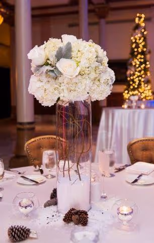 The event of the year! This wedding was such an elegant white winter wood spin on an elegant wedding at the Driskill Hotel. We used silver accents, mirrors, snow, pine cones, and all white floral for the head table centerpieces. Natural wood paired with glitzy shiny crystals, silver ting, and snow. Winter weddings are always such a delight to celebrate Christmas as well a wedding with your closest friends and family.