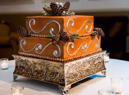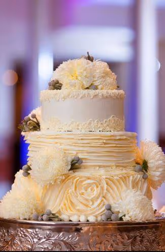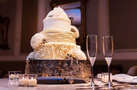 Inside, the reception tables were a vision of sophisticated simplicity. Rich blue linens provided a striking contrast to the soft hues of the floral arrangements. Our signature decor candle trios, accented with delicate greenery and flowers, cast a warm, inviting glow, creating an intimate and romantic ambiance for dinner and celebration. And, of course, no celebration is complete without a masterpiece, and Michelle's Patisserie delivered a stunning cake that was as delicious as it was beautiful.